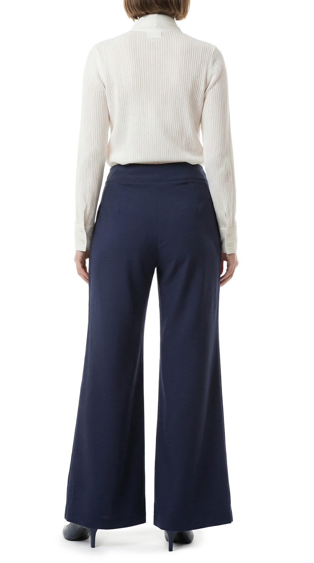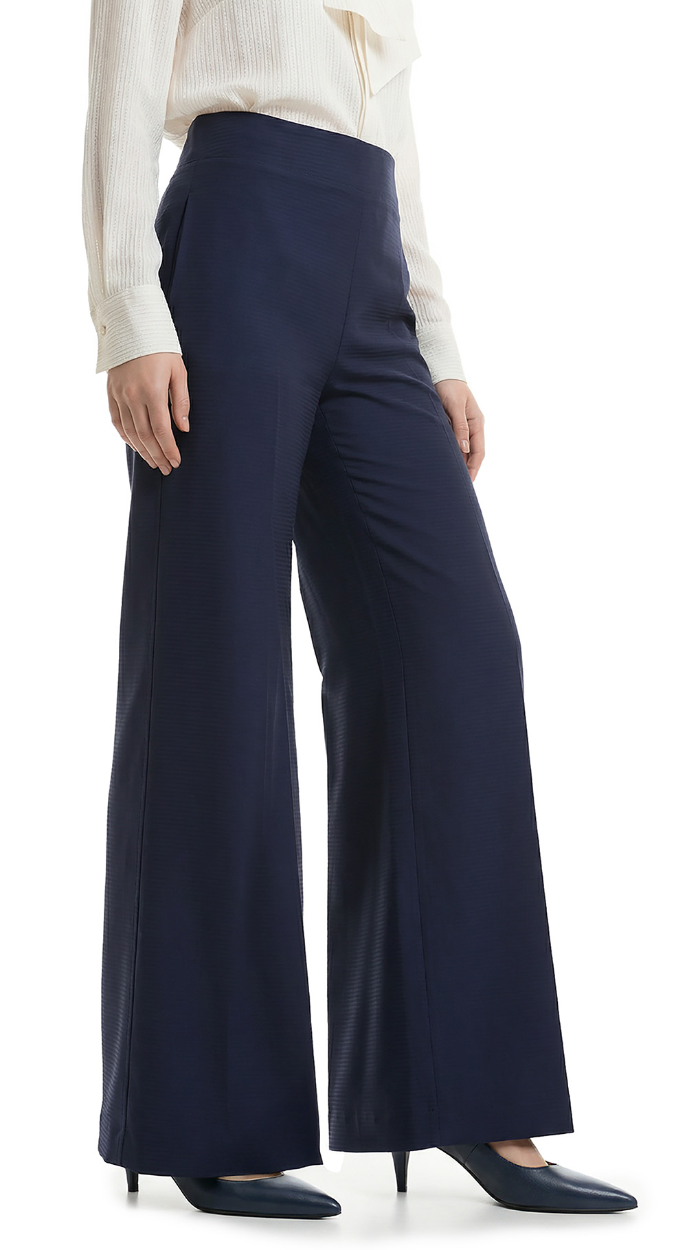 Оригинал. Новые брюки Max Mara темно-синего цвета. Широкие, расклешенные от бедра, брючины с посадкой по талии. Застежка сбоку на молнию и потайной крючок. Широкий комфортный пояс. Врезные кармашки в боковых швах. Пошив — Польша. В составе: 100% вискоза, без подклада — ткань средней плотности, шелковистая, хорошо садится по фигуре, фактурная (в еле заметную продольную полосу). Состояние — новое, из аутлета концерна MaxMara (ярлык бренда надрезан — это политика аутлета).