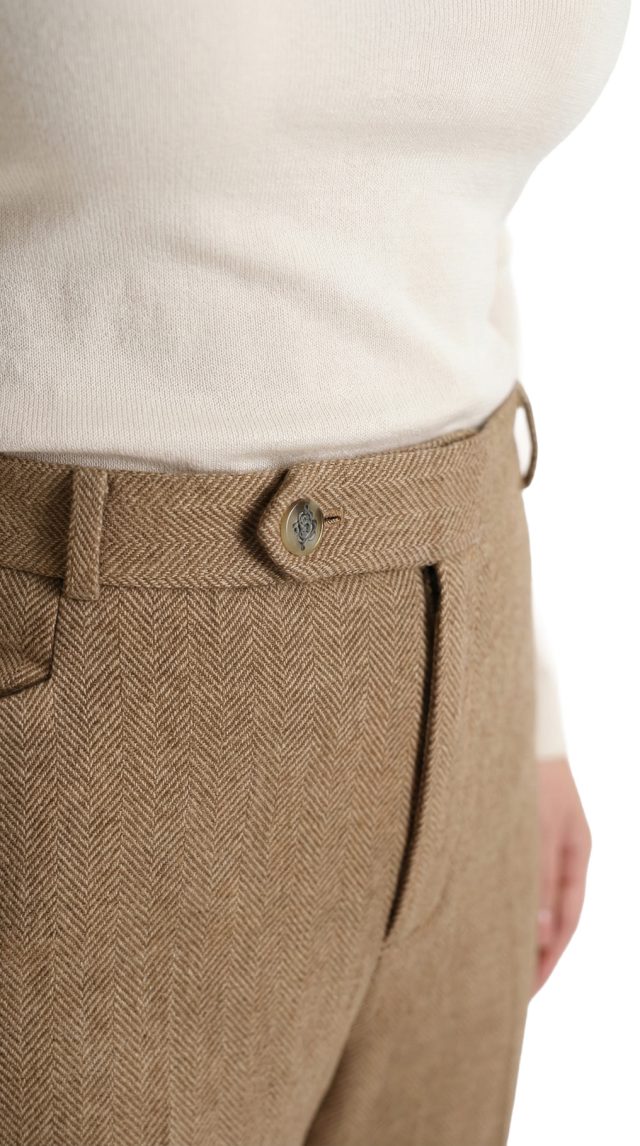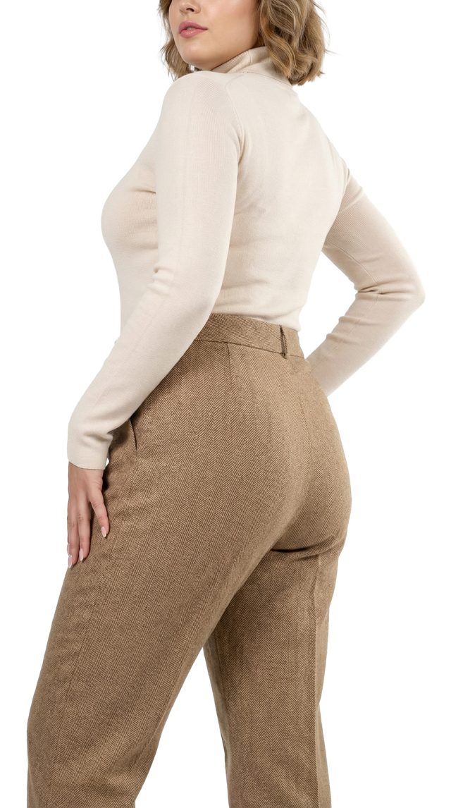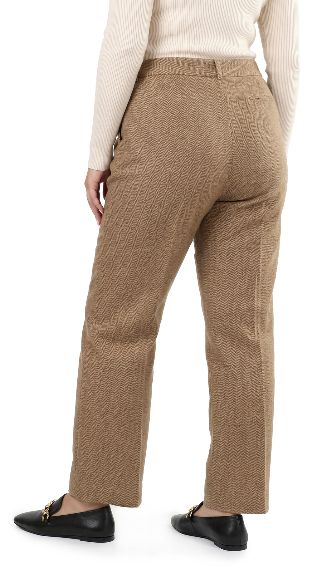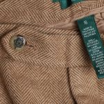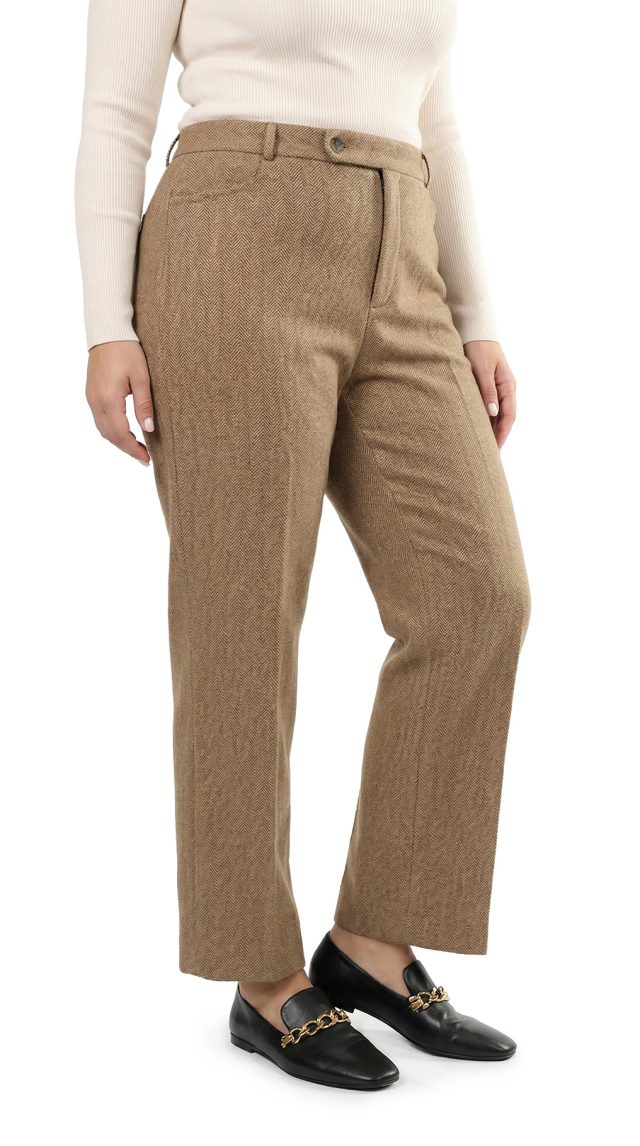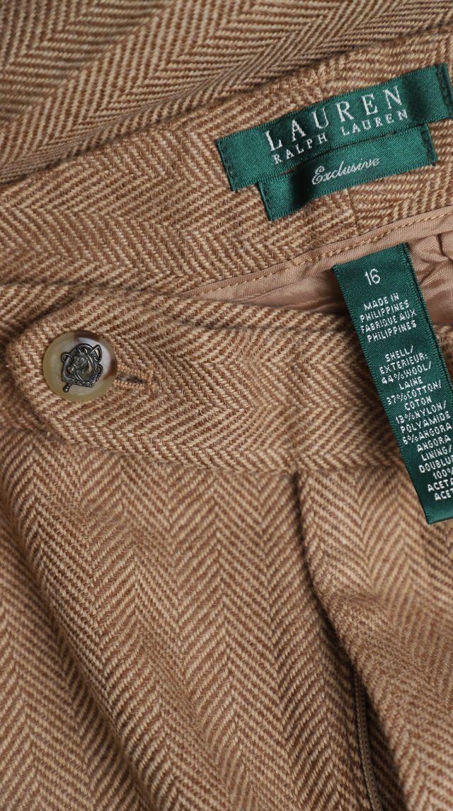 Оригинал из США. Шерстяные брюки Ralph Lauren (премиальная коллекция Exclusive) бежевого цвета в классическую «елочку». Прямой фасон с посадкой по талии. Пояс со шлицами под ремень. Застежка на молнию, потайную пуговку и фирменную перламутровую пуговку с гравировкой символики бренда. Врезные кармашки по бокам, накладной кармашек по спинке. Премиальное качество элитного бренда. В составе: 44% шерсть, 37% хлопок, 13% нейлон, 6% ангора, на подкладе из 100% натурального ацетата — ткань экстра качества: очень мягкая, шелковистая. Состояние — идеальное, как новое.