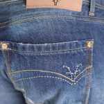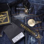 Новые джинсы итальянского бренда Fracomina темно-синего цвета, потертые и рваные. Прямой, слегка расклешенный от колена, фасон с заниженной посадкой. Врезные кармашки по бокам, большие накладные кармашки по спинке. Пояс со шличками под ремень. Застежка на потайную молнию и фирменную золотую пуговку, декорированную стразами. Большая фирменная плашка по спинке с золотой гравировкой бренда. В составе: 100% хлопок: ткань плотная, хорошо держит форму. Состояние — новое, с оригинальной биркой Fracomina.