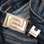 Фирменные, оригинальные, джинсы Versace темно-синего цвета с золотой окантовкой, кожаным золотым лейблом и брендованными золотыми пуговками. Посадка ниже талии, зауженный фасон. Состав: 60% хлопок, 40% п/э, без подклада. Ткань джинсовая, плотная. Состояние — идеальное, как новое. Итальянский размер: W26/34 (соответствует российскому размеру 42 (S).