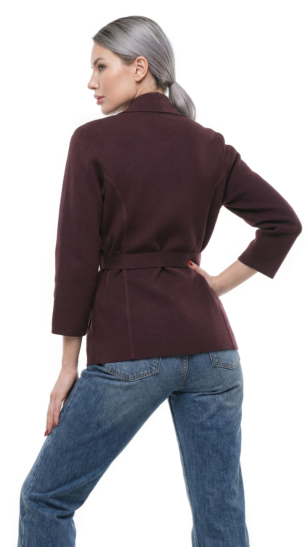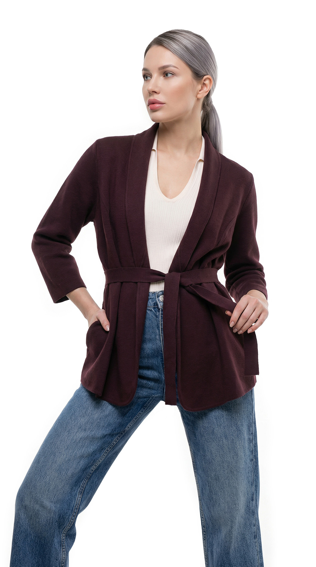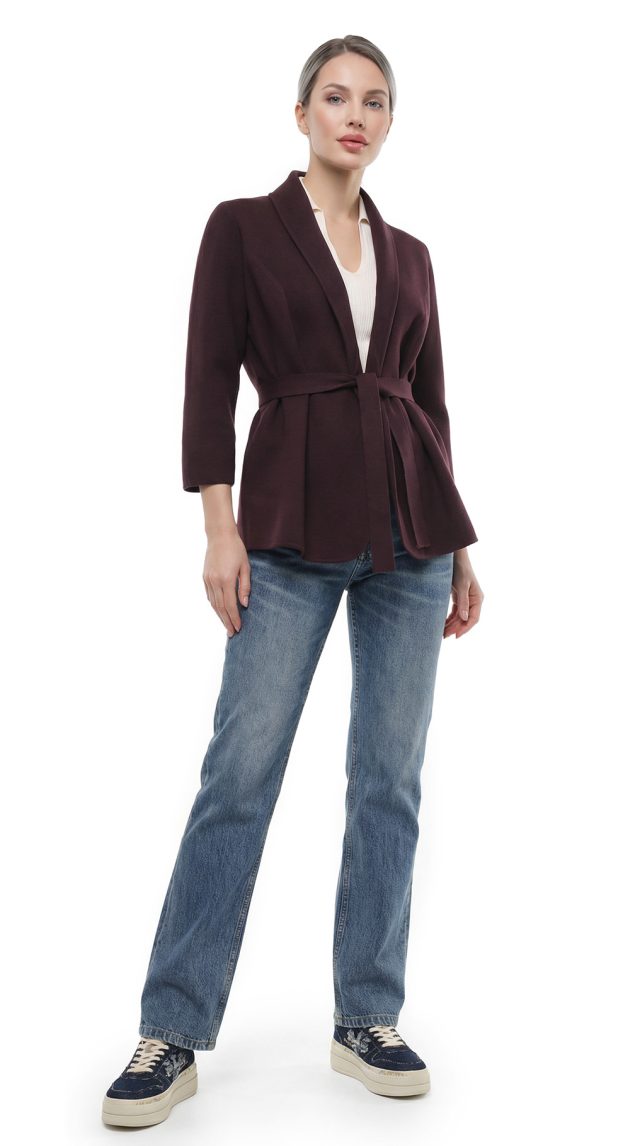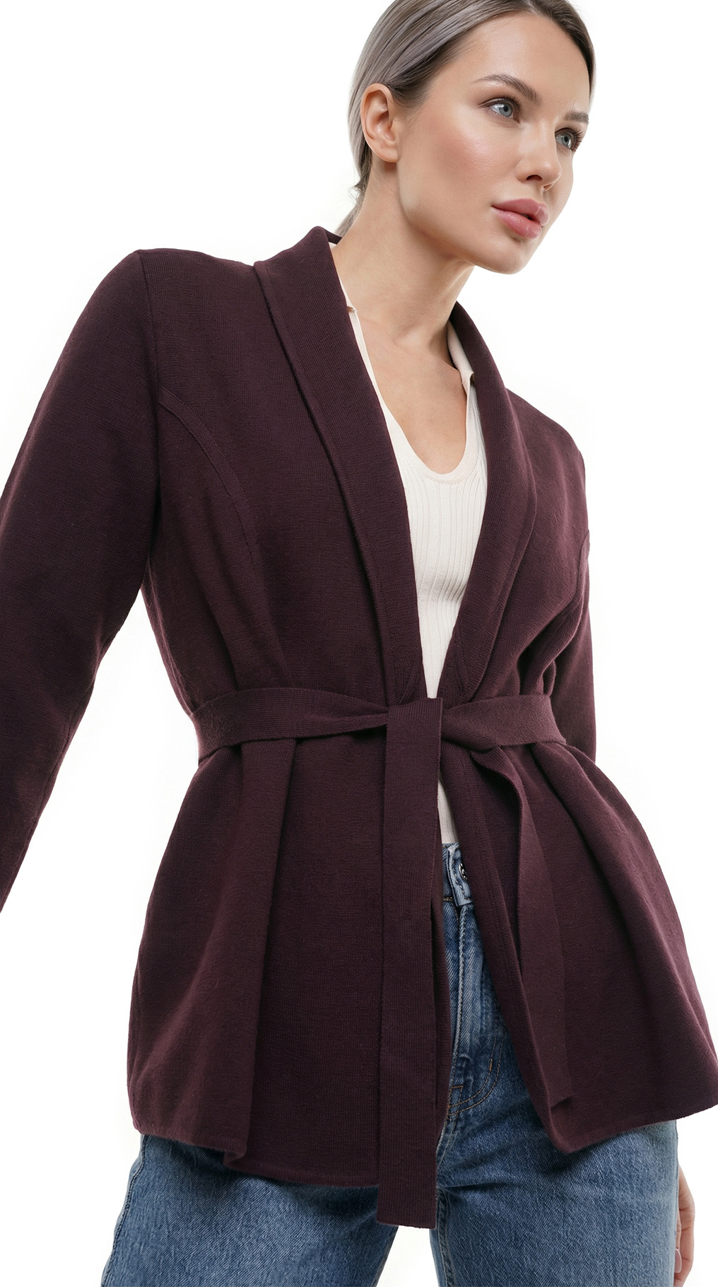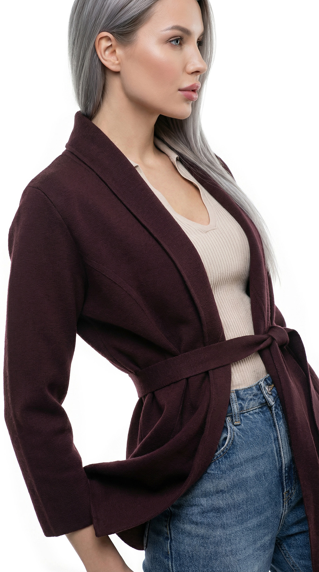 Новый трикотажный кардиган американского бренда Alfani винного (коричнево-бордового) цвета. Женственный приталенный фасон с открытым запахом, без застежки, и подвязкой на пояс. Глубокий вырез горловины, подчеркивающий декольте. Рукав длиной 3/4. В составе: 74% хлопок, 26% нейлон, без подклада. Состояние — новое, с фирменной биркой. Цена на бирке — 79.5$.