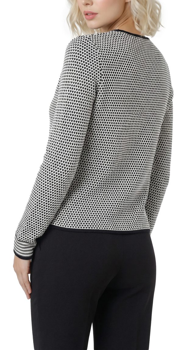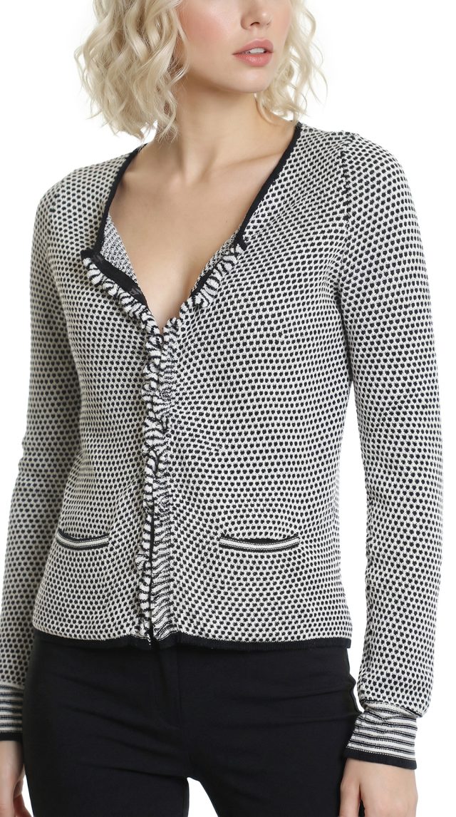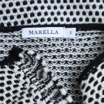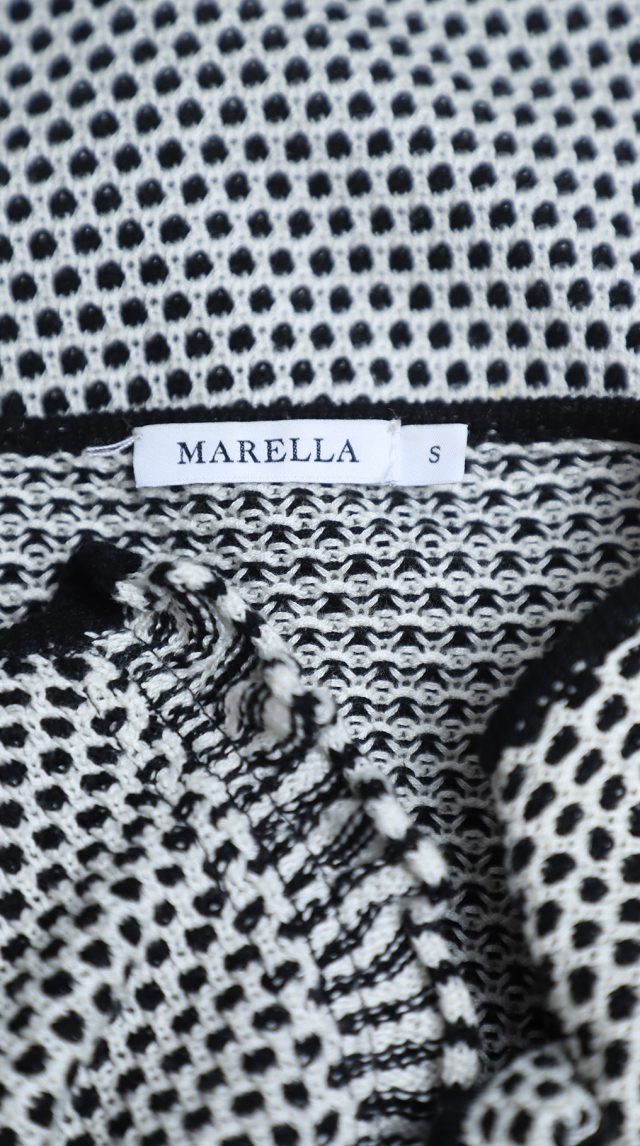 Трикотажный кардиган итальянского бренда Max Mara (линия Marella) черно-белого цвета. Прямой фасон с длинным рукавом и застежкой на потайные крючки. Небольшие врезные кармашки. Бирка с составом срезана: экспертная оценка — хлопок: ткань средней плотности, эластичная. Состояние — отличное.