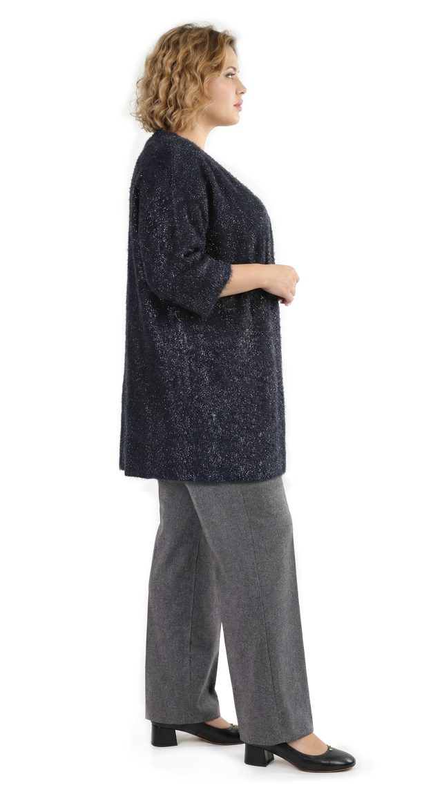 Новый роскошный кардиган концерна Max Mara (Marina Rinaldi) черного цвета с черно-серебристыми «перьями», красиво переливающимися на свету. Свободный прямой фасон с длинным рукавом и застежкой на кнопки. Скругленная горловина. Плечики на рукавах — держат форму. Врезные кармашки в боковых швах. Смотрится элегантно и стильно. В составе: 100% п.э, на подкладе из 60% натурального ацетата и вискозы — ткань экстра качества: легкая, как пушинка, мягкая, отлично драпируется и садится по фигурке. Состояние — новое, из аутлета концерна Max Mara (ярлык бренда надрезан — это политика аутлета).