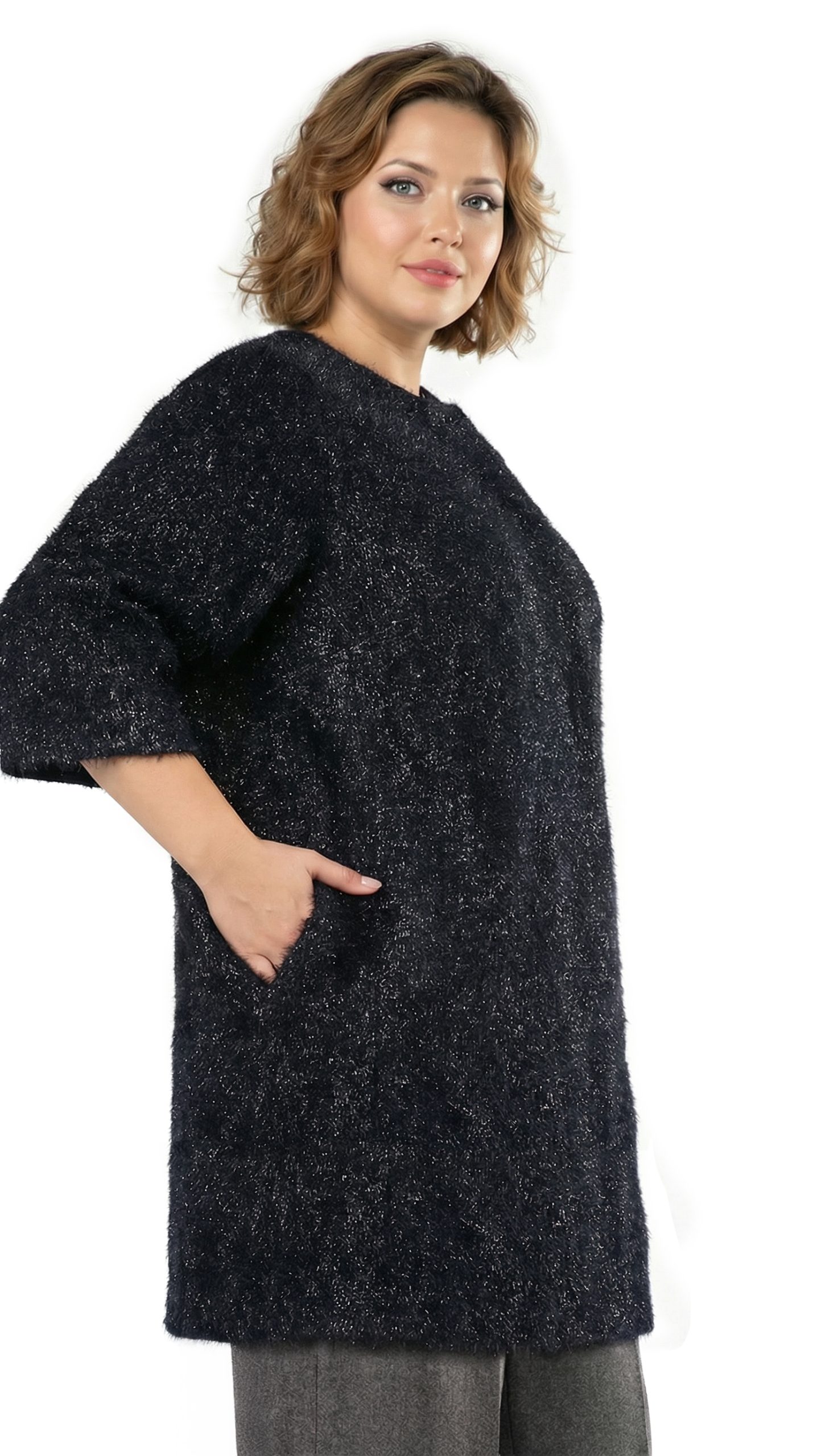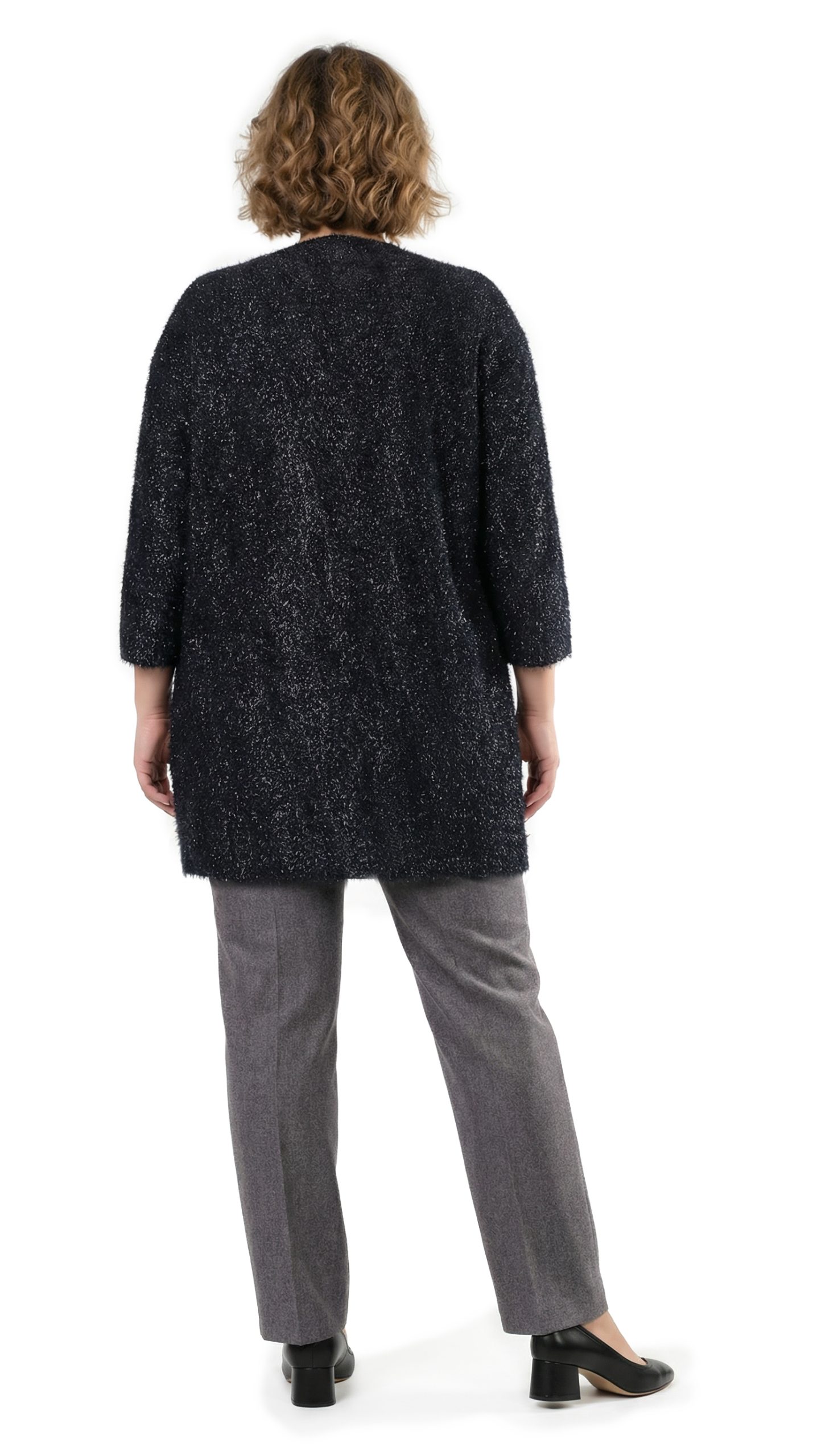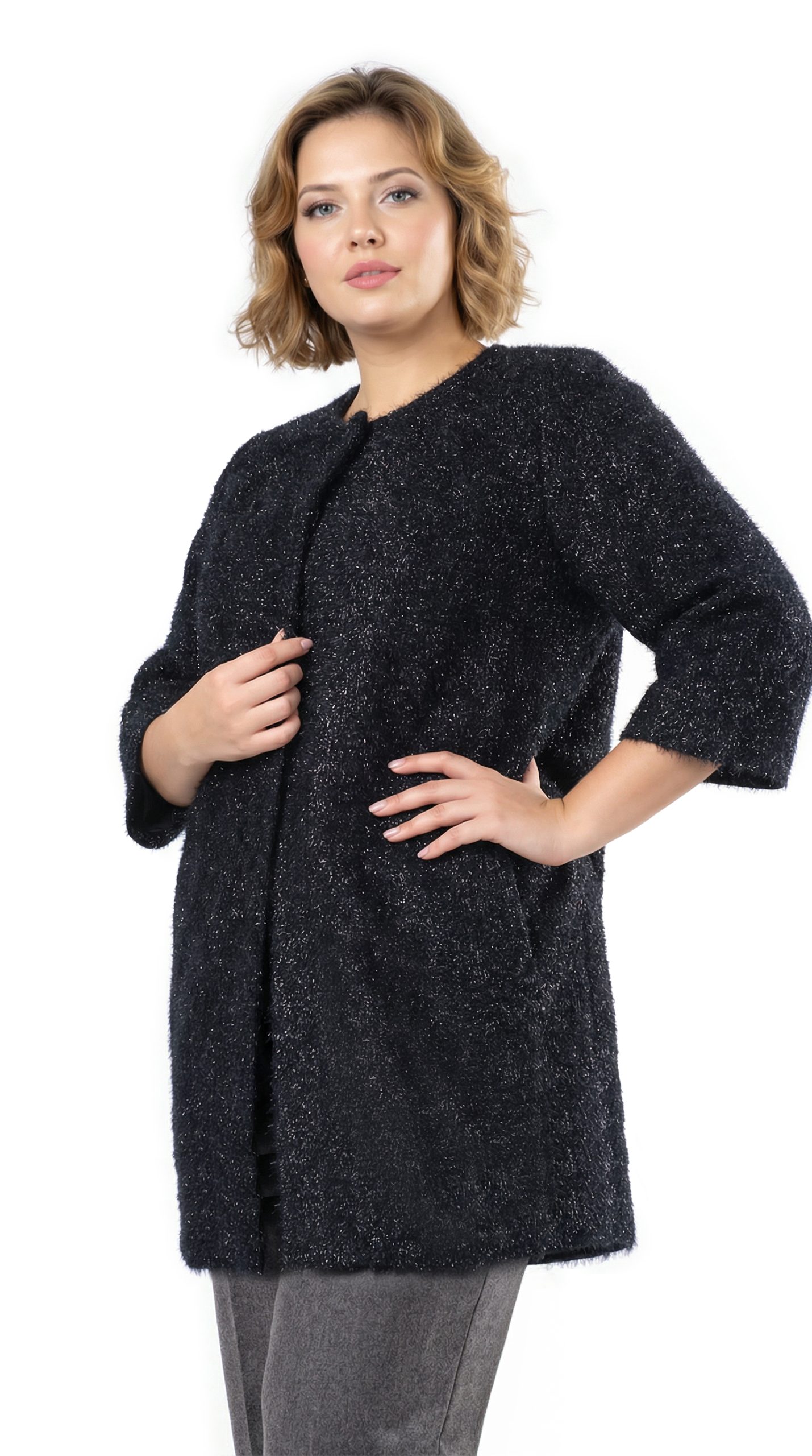 Новый роскошный кардиган концерна Max Mara (Marina Rinaldi) черного цвета с черно-серебристыми «перьями», красиво переливающимися на свету. Свободный прямой фасон с длинным рукавом и застежкой на кнопки. Скругленная горловина. Плечики на рукавах — держат форму. Врезные кармашки в боковых швах. Смотрится элегантно и стильно. В составе: 100% п.э, на подкладе из 60% натурального ацетата и вискозы — ткань экстра качества: легкая, как пушинка, мягкая, отлично драпируется и садится по фигурке. Состояние — новое, из аутлета концерна Max Mara (ярлык бренда надрезан — это политика аутлета).