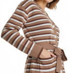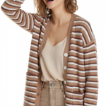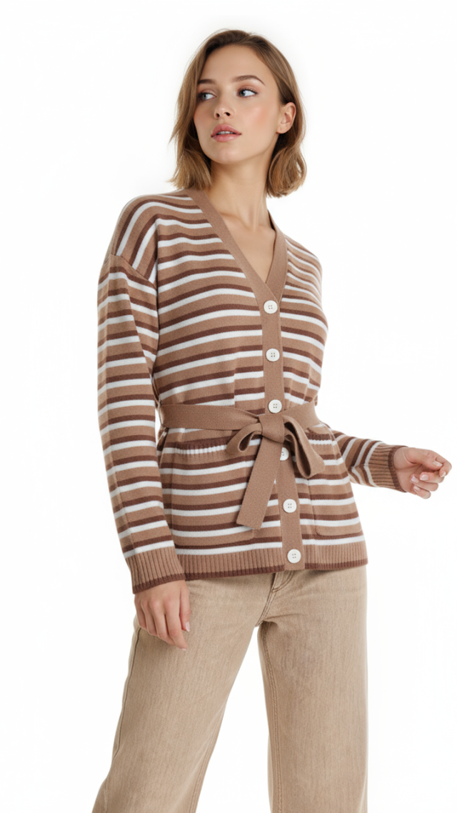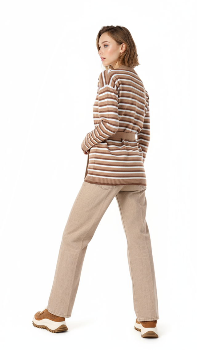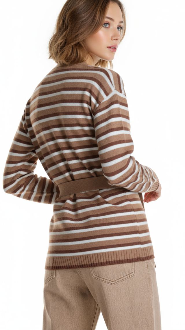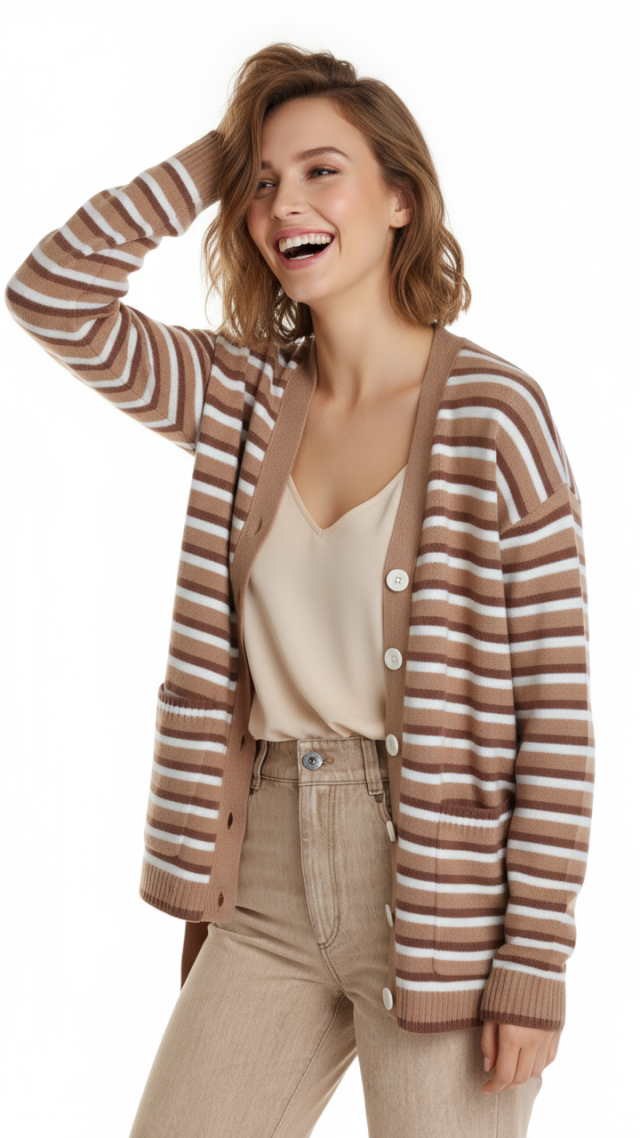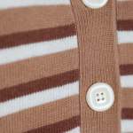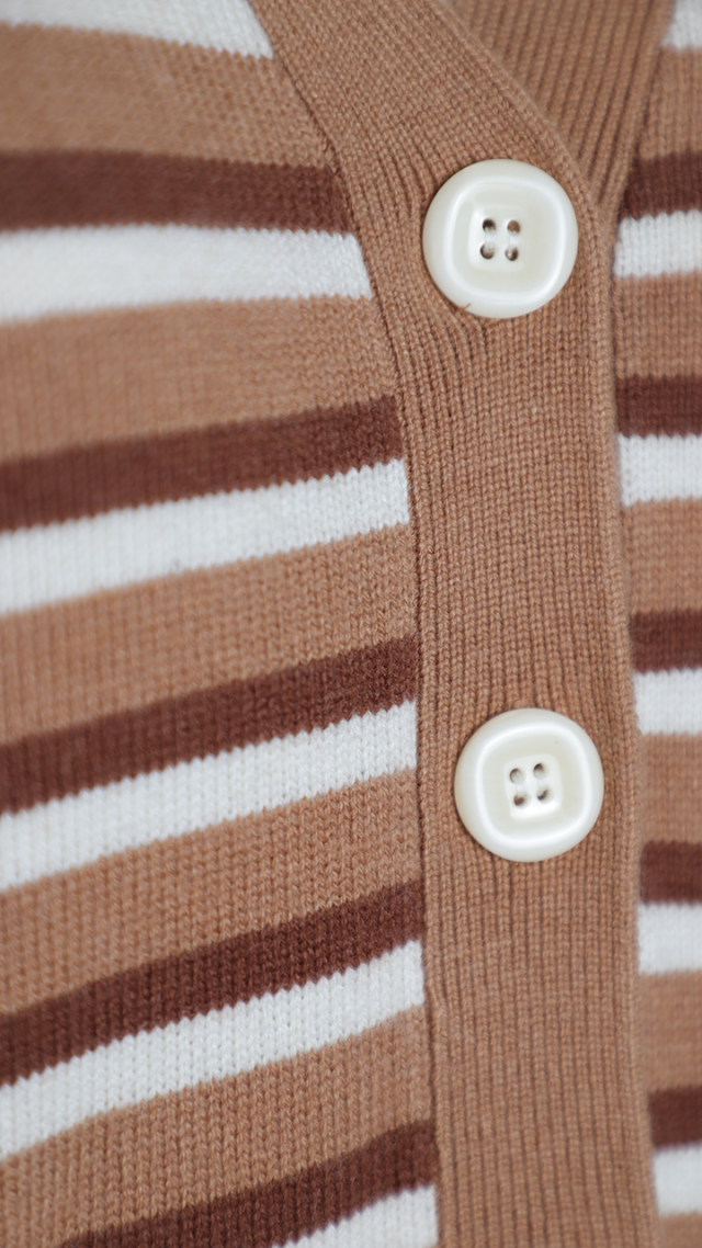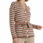 Оригинал с биркой. Новый шерстяной кардиган концерна Max Mara (линия PennyBlack) в полоску молочно-белого-бежевого и коричневого цвета. Приталенный на пояс покрой с длинным приспущенным рукавом и V-вырезом горловины. Накладные кармашки. Застежка на большие пуговки. Фирменная золотая «монетка» с гравировкой бренда. В составе: 35% полиамид, 31% вискоза, 30% шерсть, 4% кашемир: ткань средней плотности, мягкая (не колючая), теплая, эластичная. Состояние — новое, с оригинальной биркой PennyBlack.