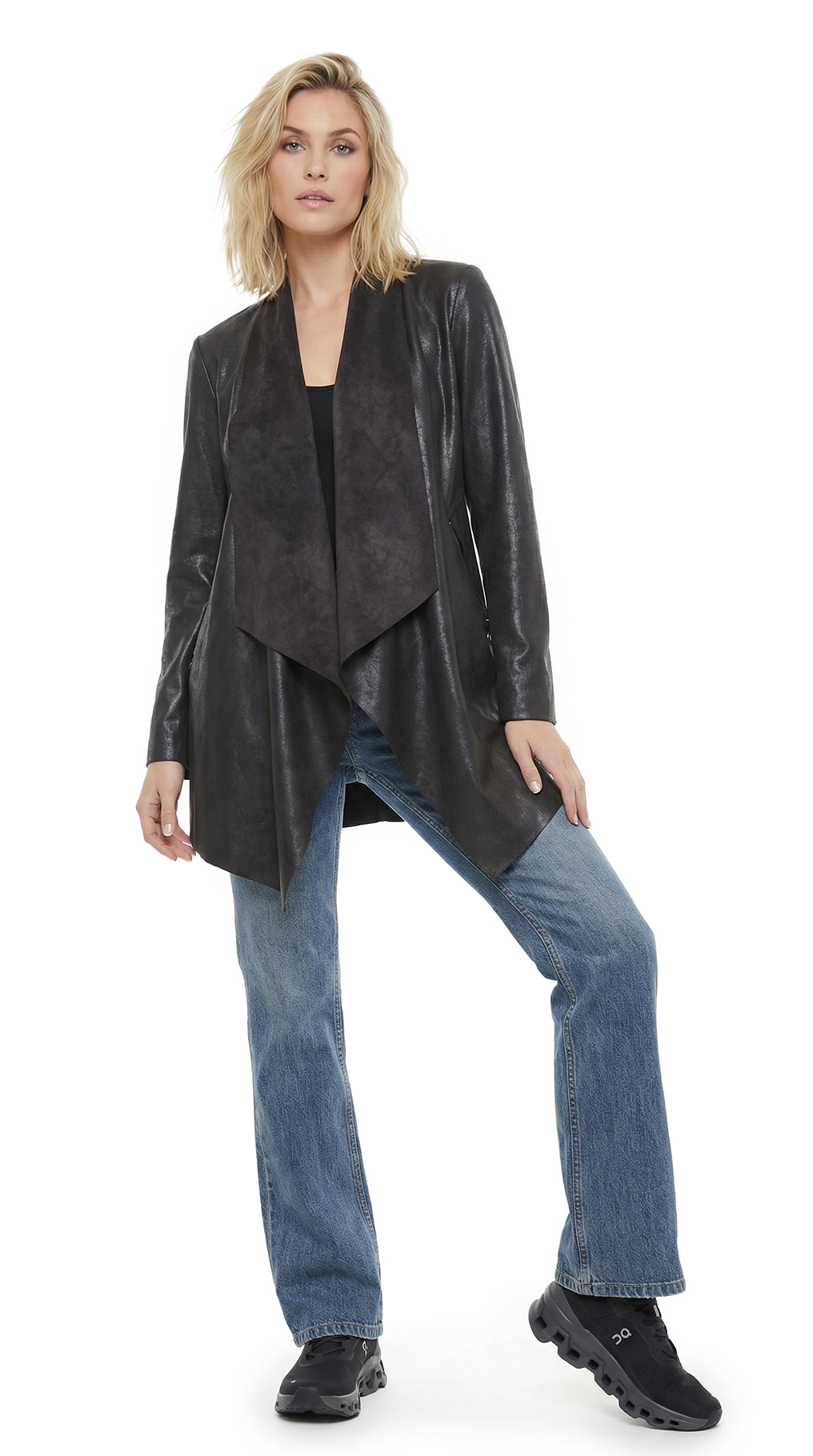Новый кардиган английского дизайнерского бренда Pomodoro черного цвета в сочетании двух фактур: под мягкую телячью кожу и замшу. Свободный удлиненный фасон на запах, без застежки, с глубоким V-образным вырезом и красивыми отворотами. Длинный рукав. Врезные кармашки на молнии. Пошив — Греция. В составе: 90% п.э, 10% спандекс: ткань средней плотности, мягкая, бархатистая. Состояние: новое, с фирменной биркой.