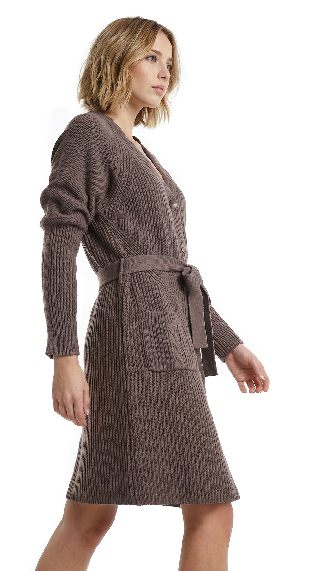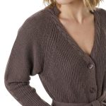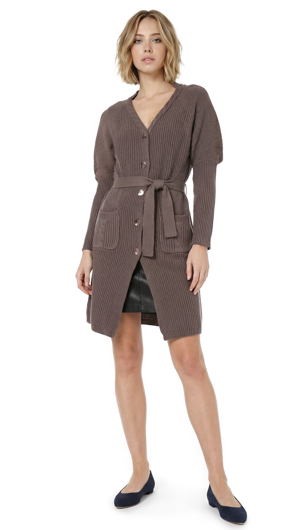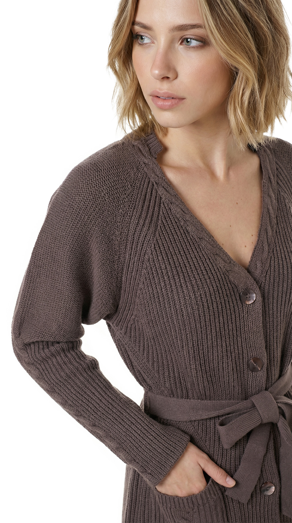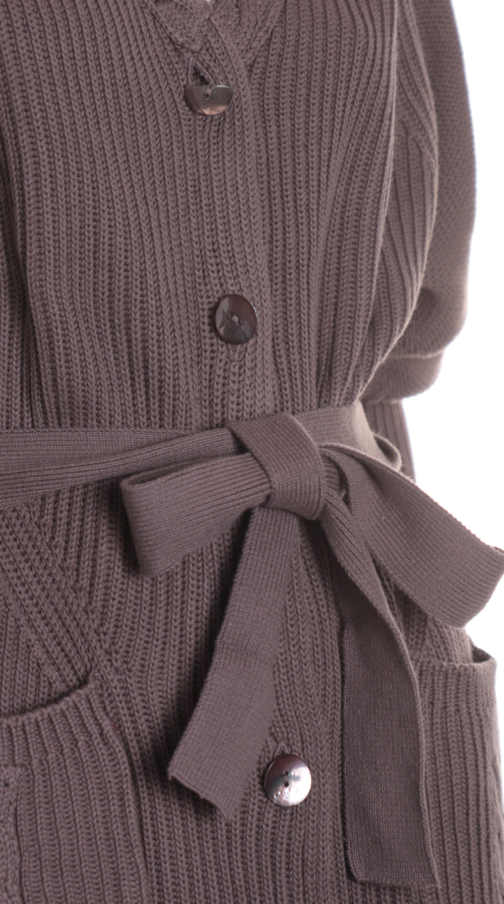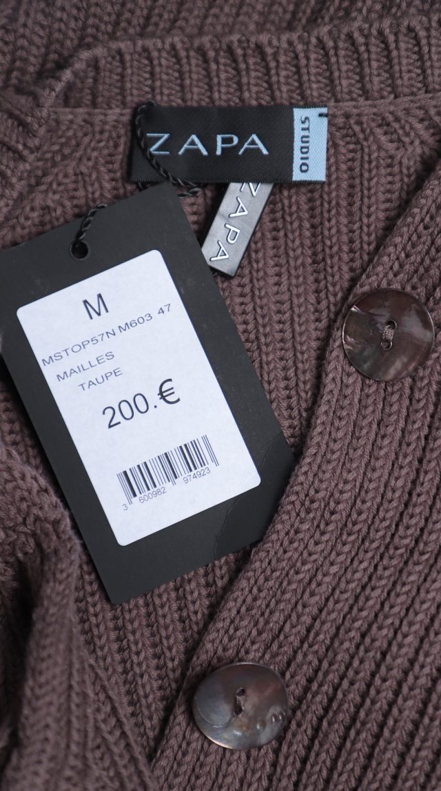 Новый трикотажный кардиган французского бренда класса «люкс» Zapa Paris бежево-коричневого цвета. Удлиненный прямой фасон с подвязкой на пояс, застежкой на перламутровые пуговки и большими накладными кармашками. Длинный приспущенный рукав с широкой манжетой. V-образный вырез горловины, декорированный «косами». Красивое сочетание вязки резинкой и платочной вязки. Премиальное качество пошива и материалов. В составе 100% хлопок экстра качества: плотный, мягкий, уютный, хорошо тянется, но не растягивается. Эксклюзив: в единственном экземпляре в России. Состояние — новое, с фирменной биркой Zapa. Цена на бирке — 200 евро (!).