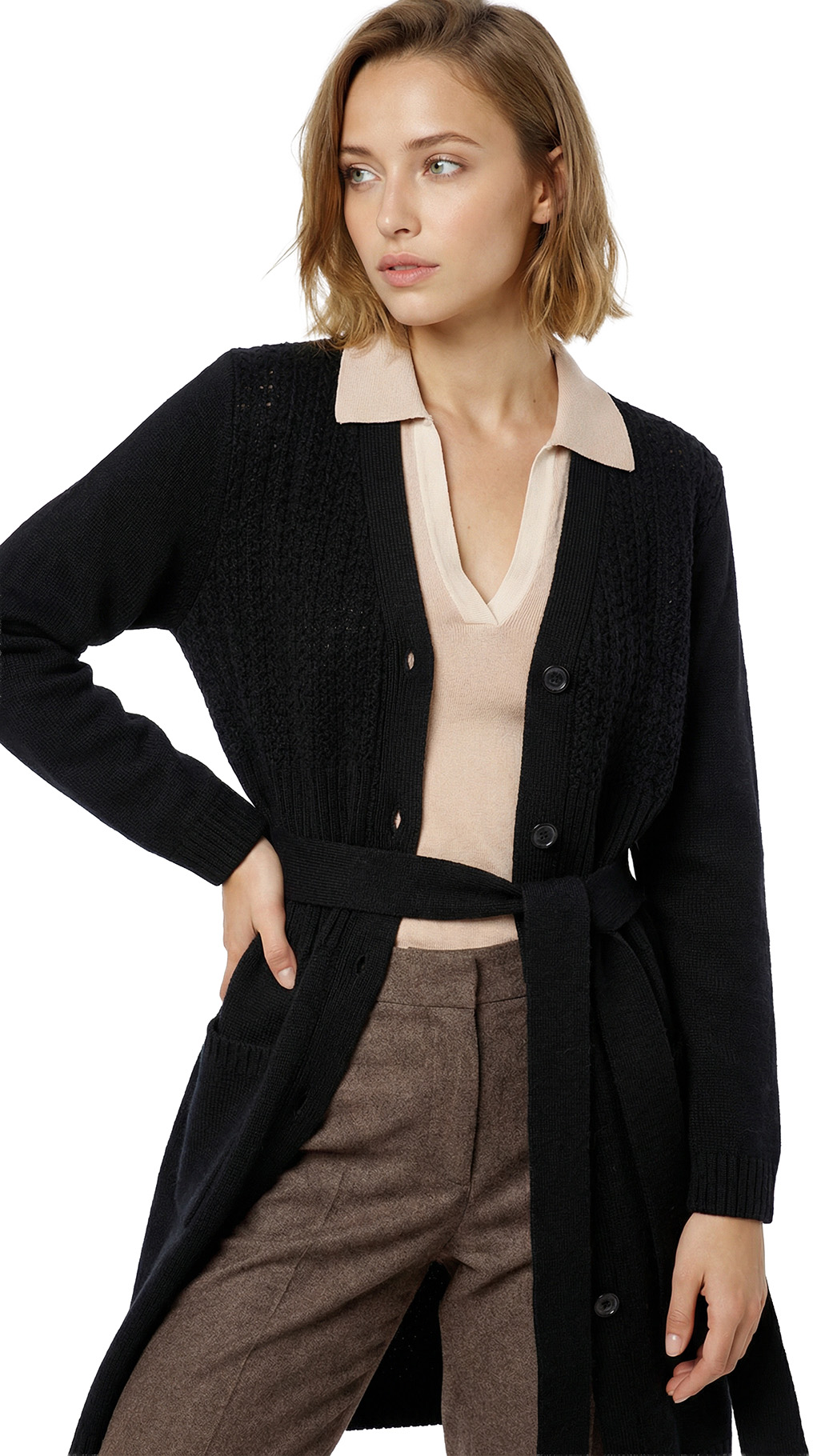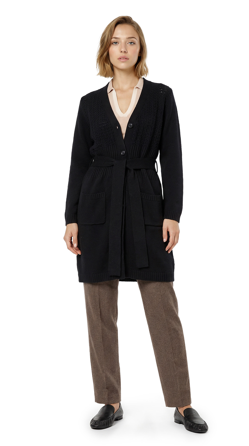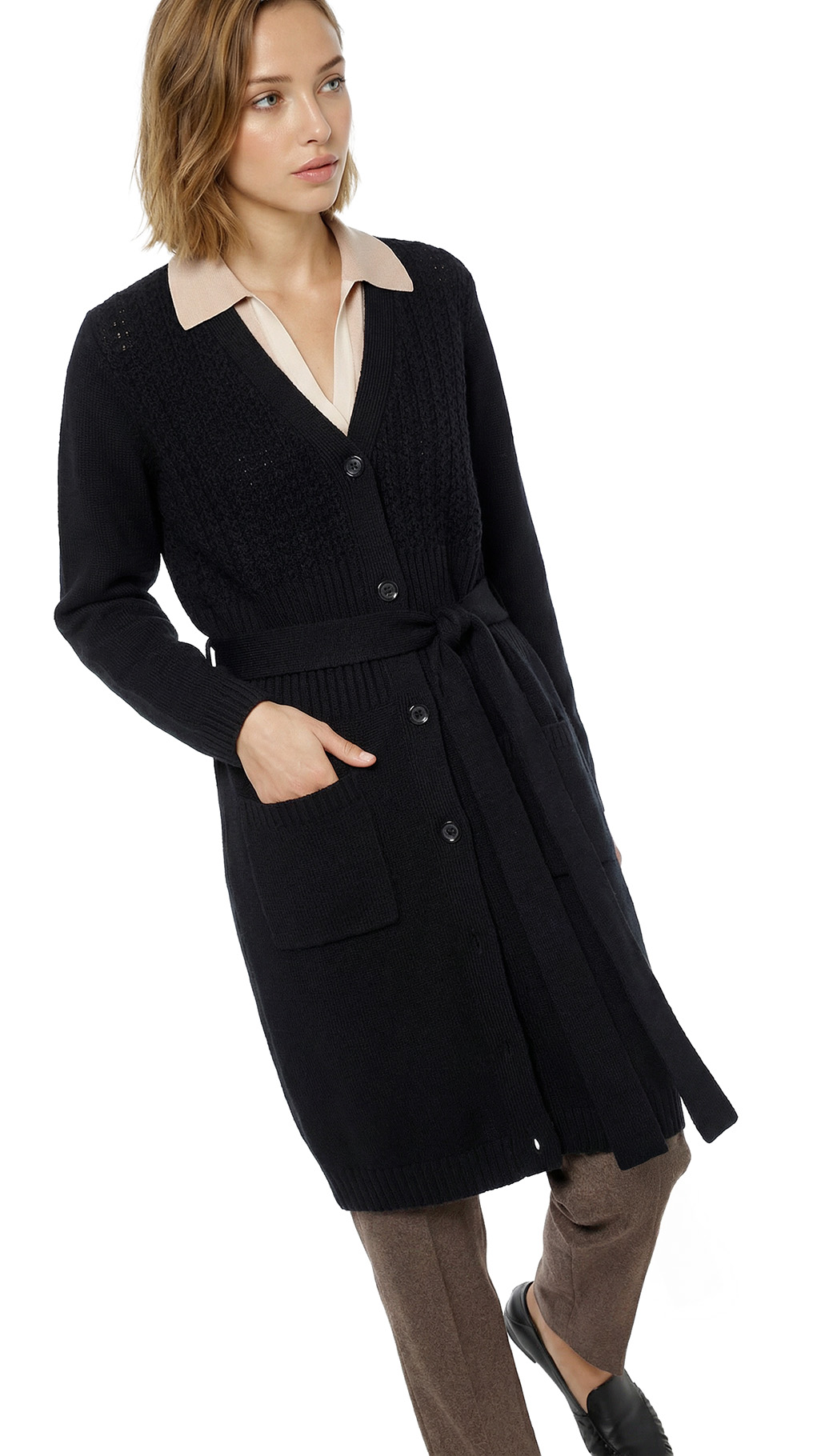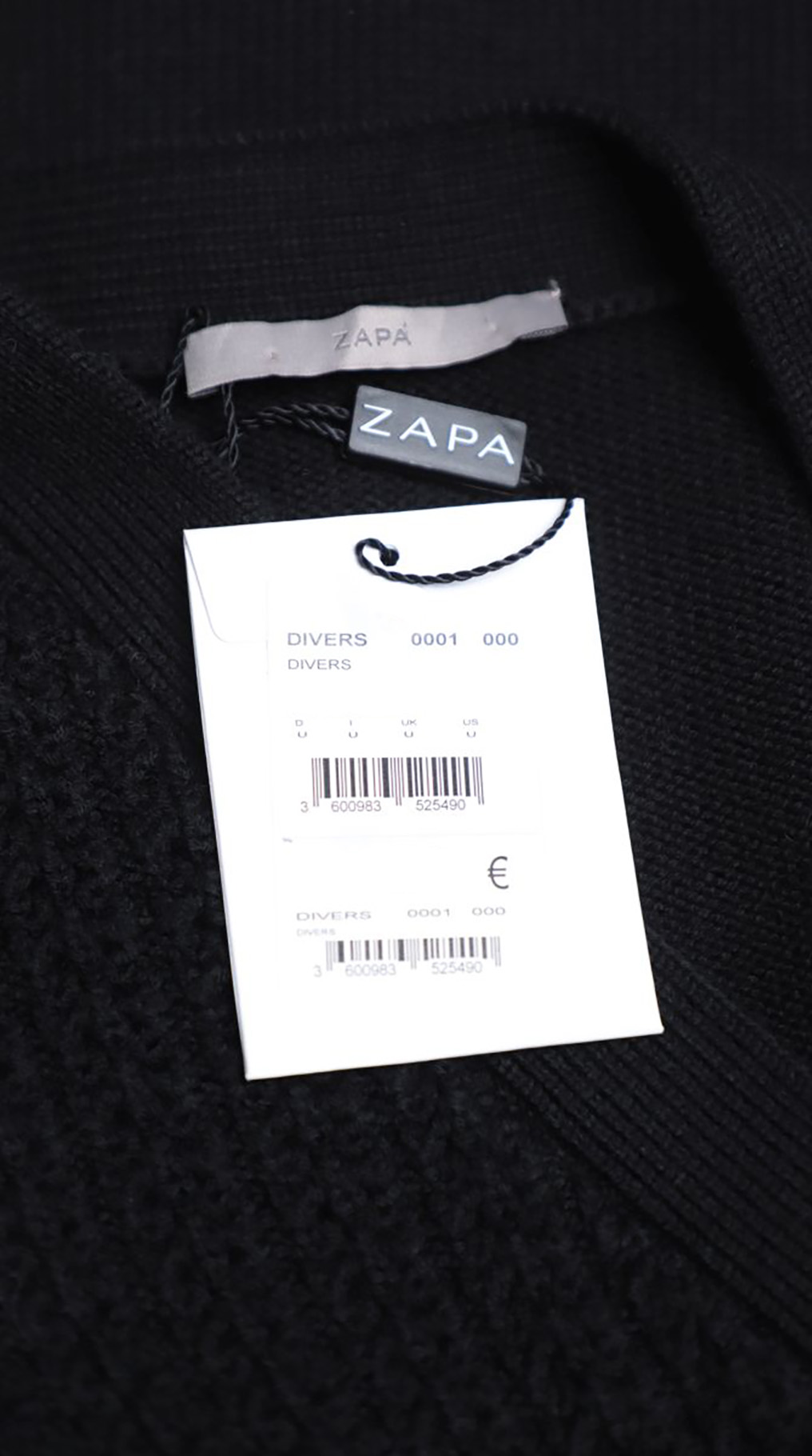 Новый шерстяной кардиган французского бренда класса «люкс» Zapa Paris черного цвета. Свободный, удлиненный фасон с подвязкой на пояс, застежкой на пуговки и большими накладными кармашками. Длинный рукав. V-образный вырез горловины. Красивое сочетание ажурной вязки, вязки резинкой и платочной вязки. Премиальное качество пошива и материалов. В составе 100% шерсть экстра качества: плотная, мягкая, теплая, хорошо тянется, но не растягивается. Состояние — новое, с фирменной биркой Zapa.