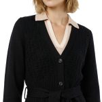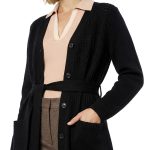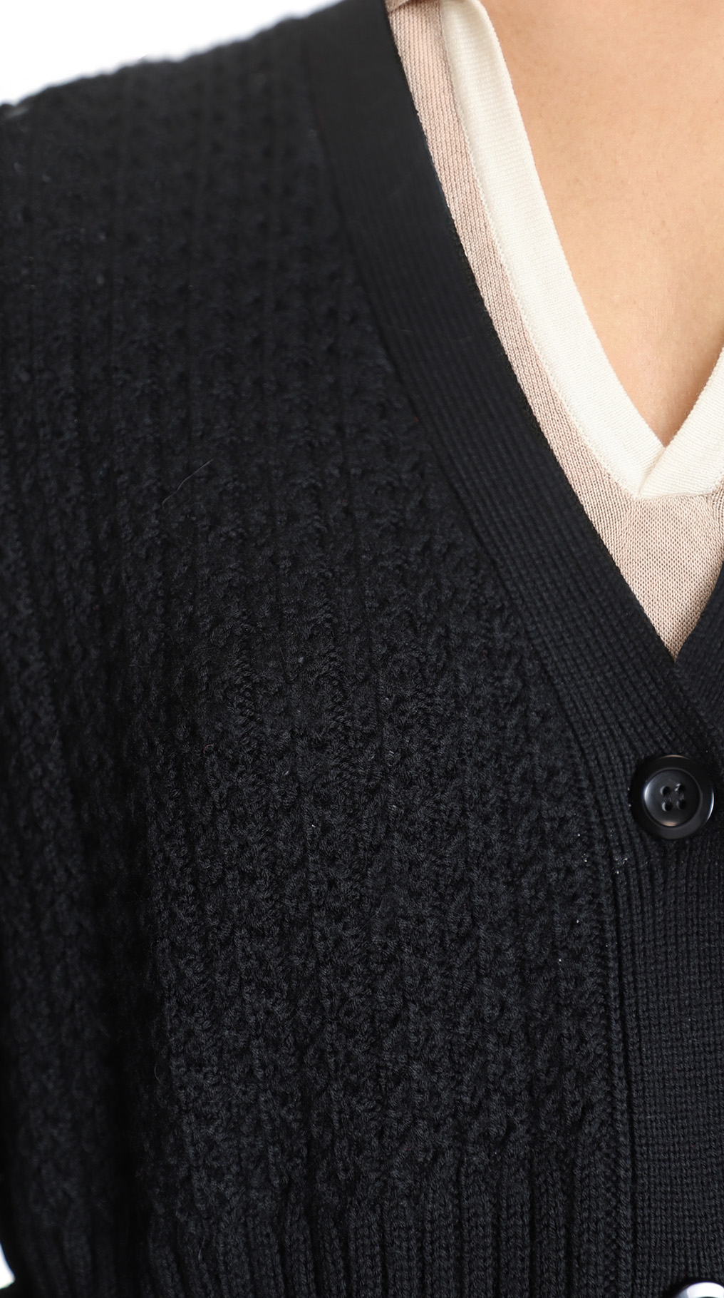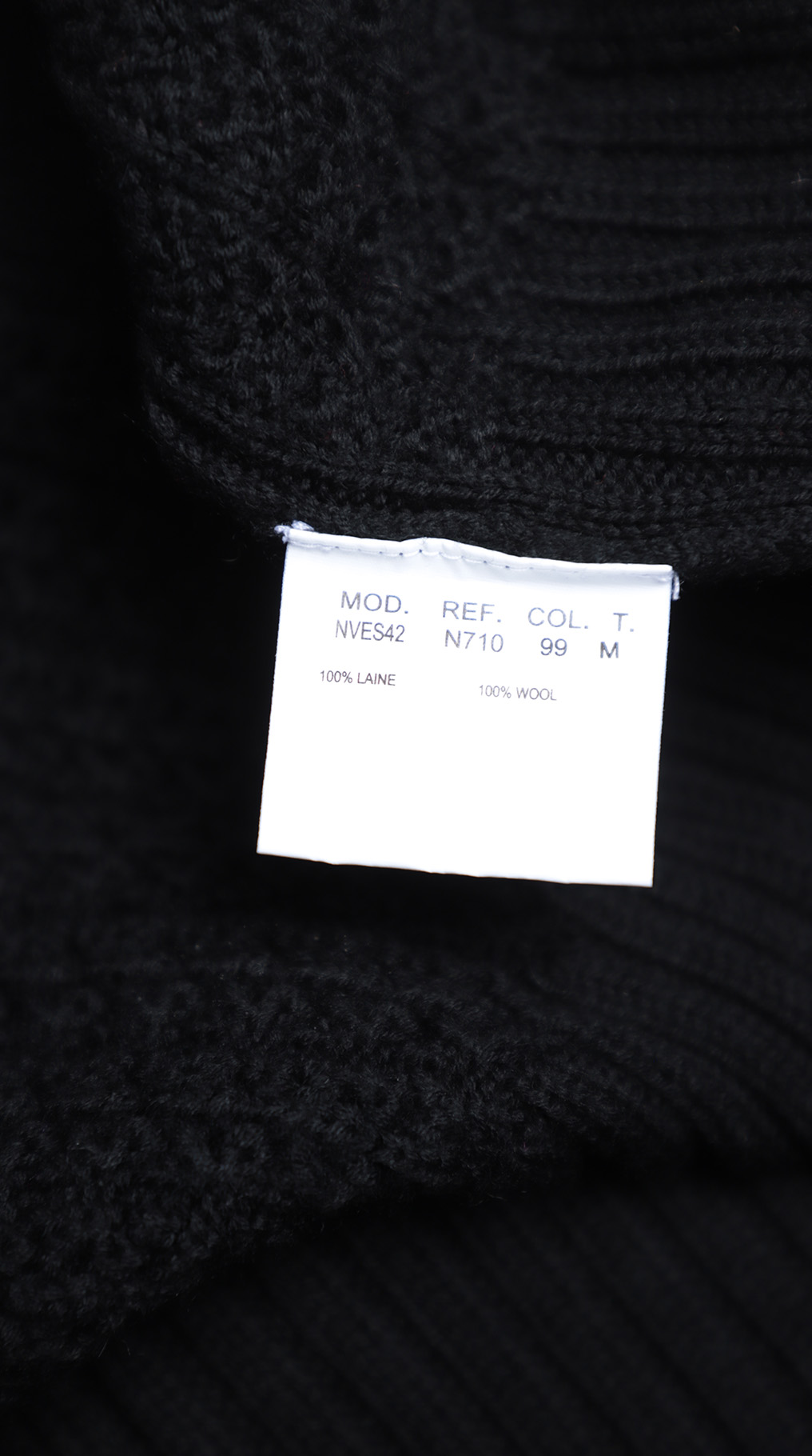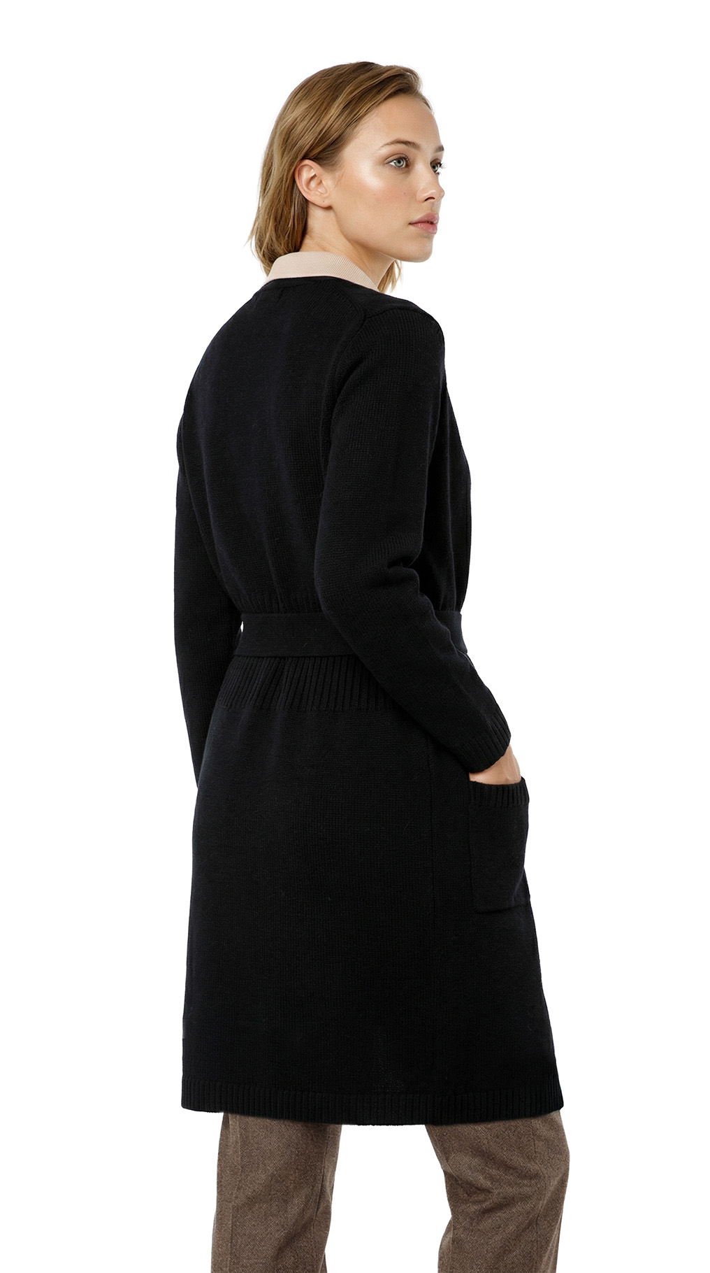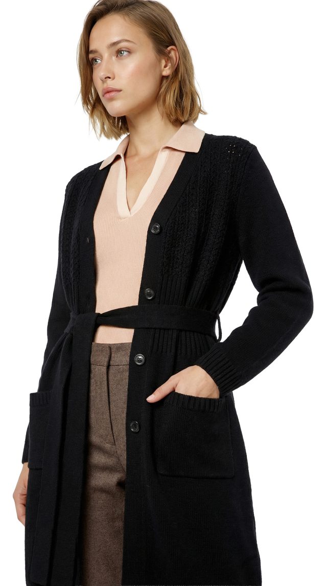 Новый шерстяной кардиган французского бренда класса «люкс» Zapa Paris черного цвета. Свободный, удлиненный фасон с подвязкой на пояс, застежкой на пуговки и большими накладными кармашками. Длинный рукав. V-образный вырез горловины. Красивое сочетание ажурной вязки, вязки резинкой и платочной вязки. Премиальное качество пошива и материалов. В составе 100% шерсть экстра качества: плотная, мягкая, теплая, хорошо тянется, но не растягивается. Состояние — новое, с фирменной биркой Zapa.