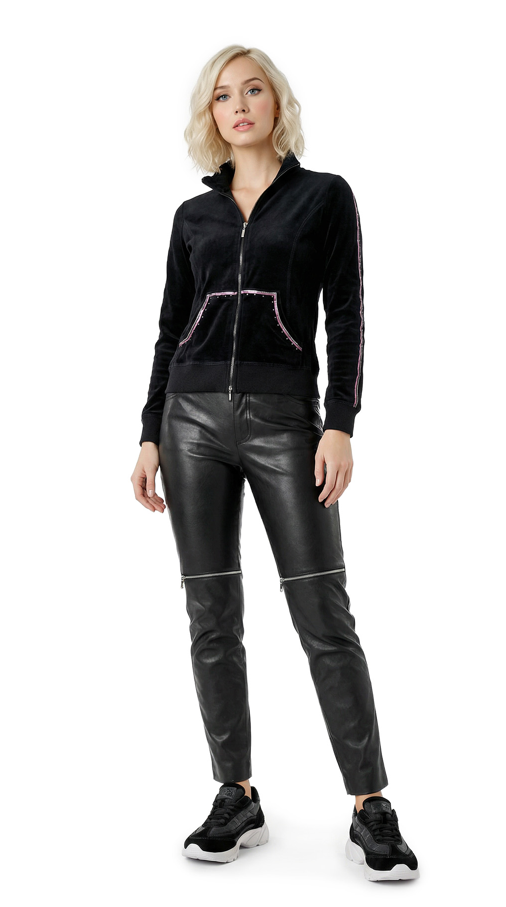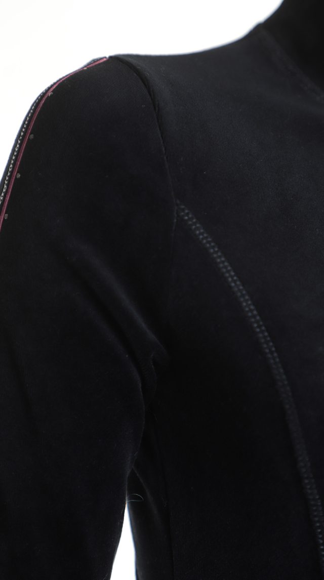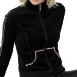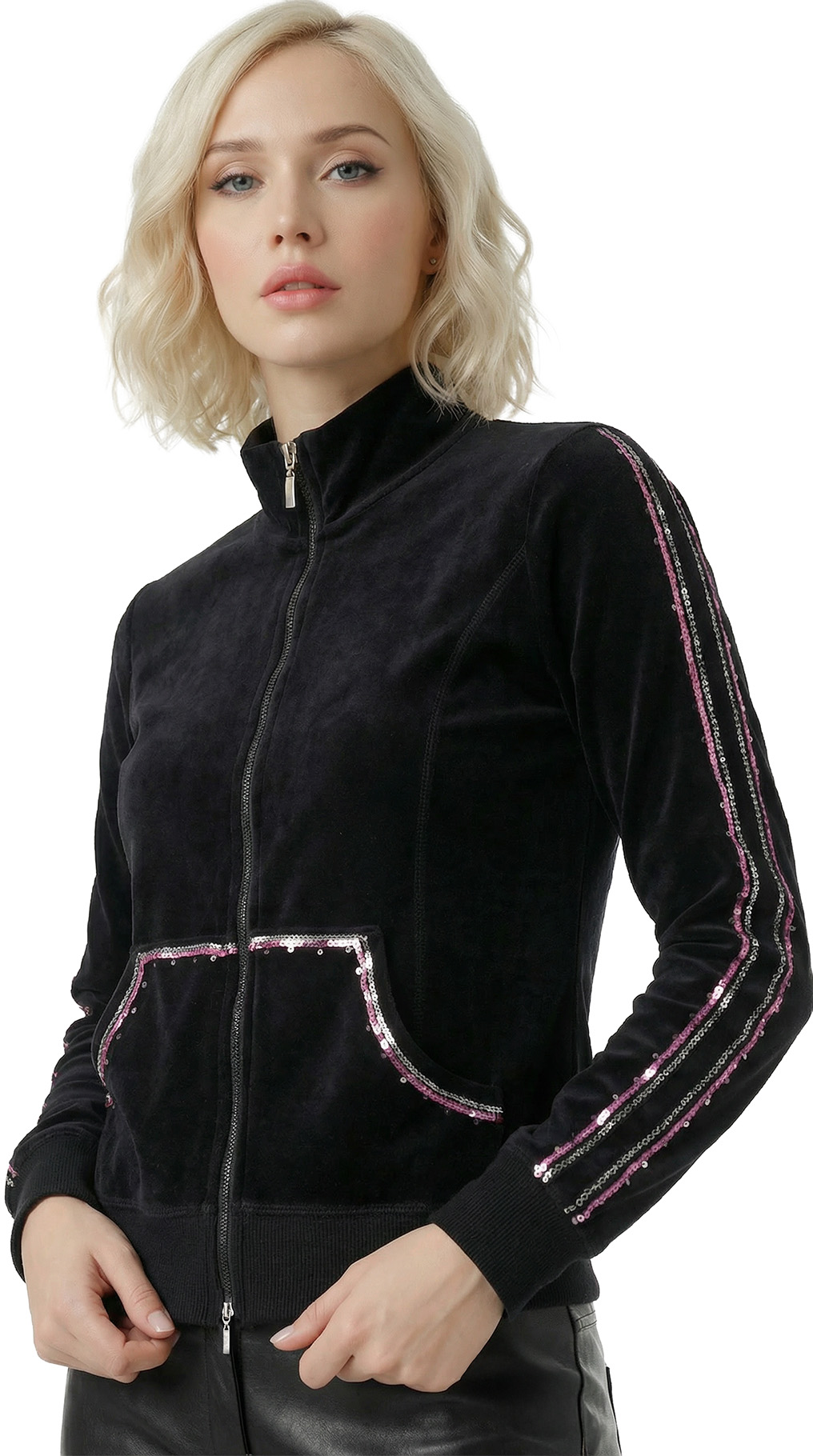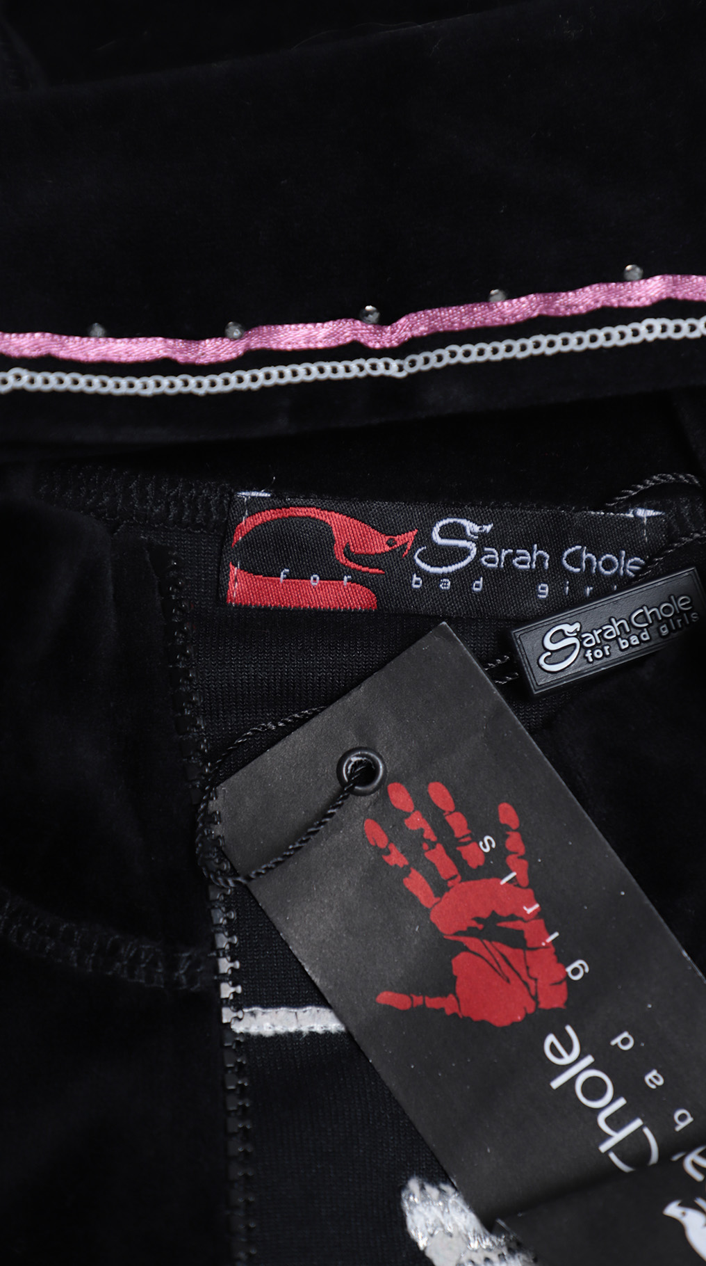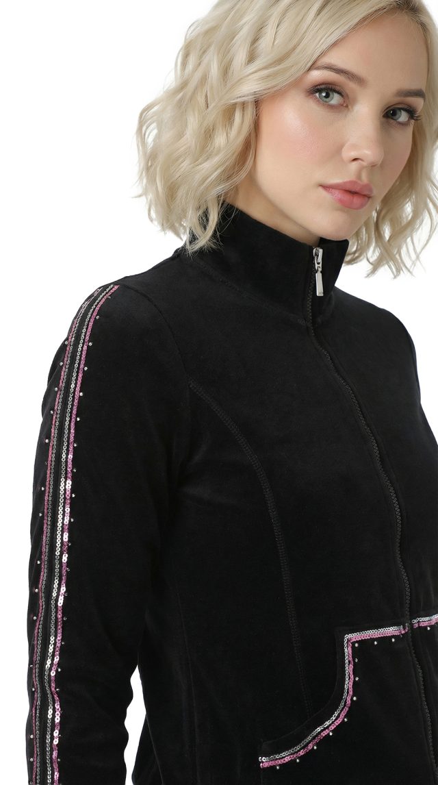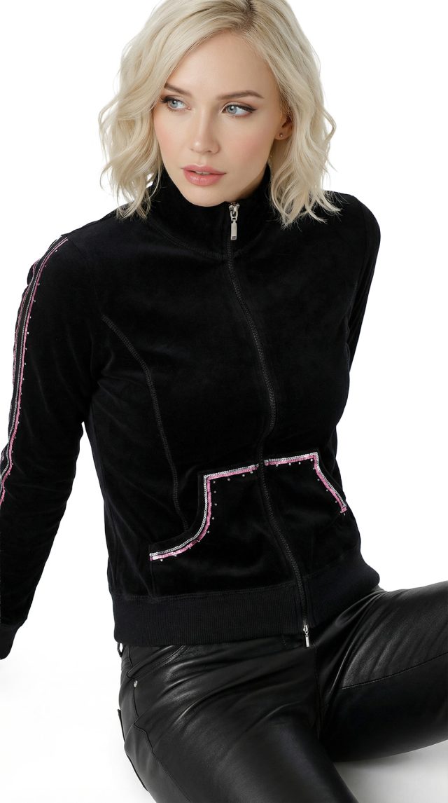 Новая кофта бомбер итальянского бренда Sarah Chole черного цвета, декорированная серебристыми пайетками, стразами и розовой атласной лентой. Свободный фасон с застежкой на молнию. Врезные кармашки по бокам. Длинный рукав с трикотажной манжетой. Широкая резинка по талии. Воротничок стойка. Фирменная вышивка логотипа бренда по спинке. В составе 80% хлопок, 20% п.э — ткань средней плотности, мягкая, бархатистая на ощупь. Состояние — новое, с фирменной биркой Sarah Chole.