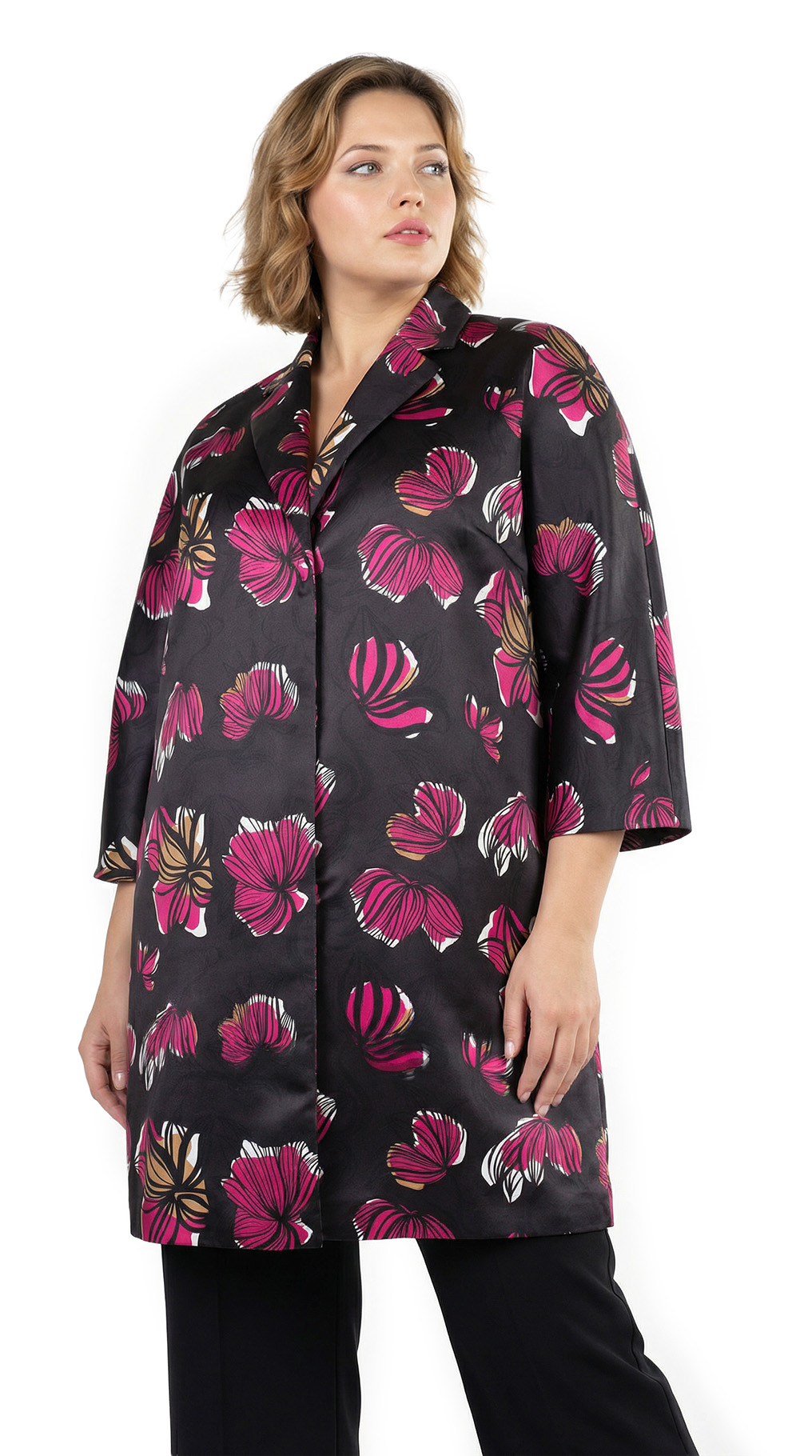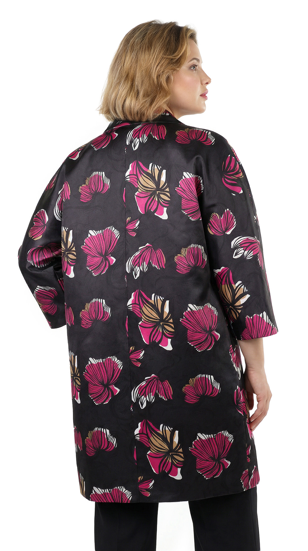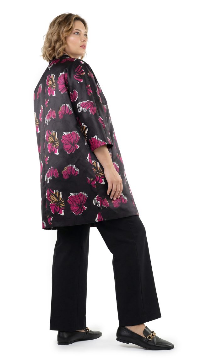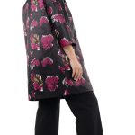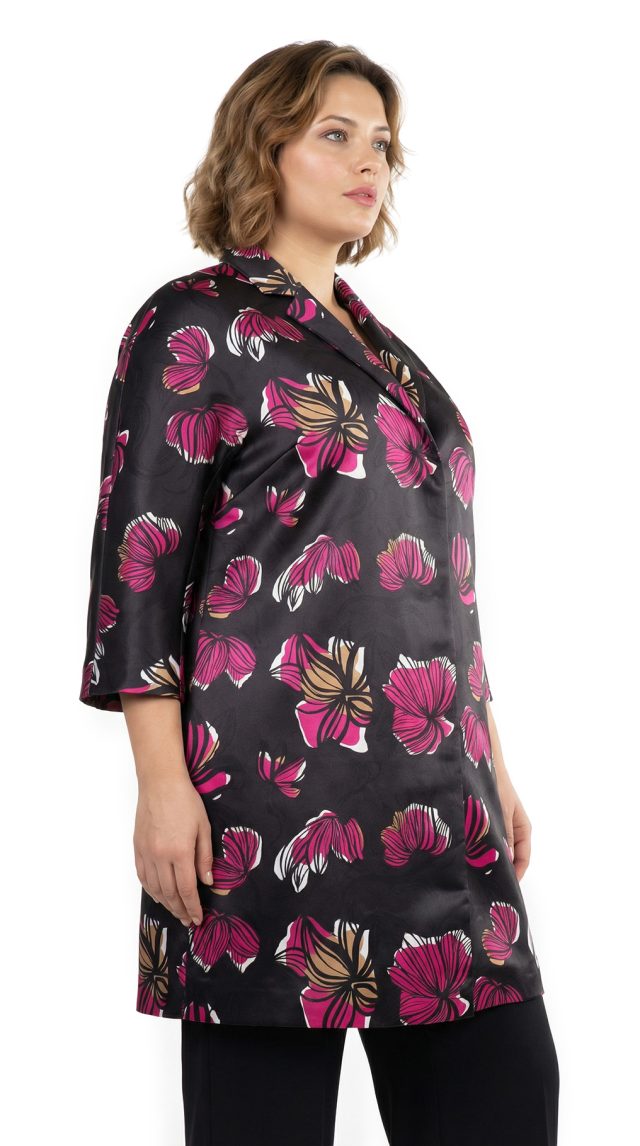 Оригинал. Новый кардиган-плащ концерна Max Mara (линия Marina Rinaldi) с ярким цветочным принтом в малиново-бежевых тонах на черном фоне. Фасон «трапеция» с застежкой на кнопочки и рукавом длиной 3/4. Врезные кармашки в боковых швах. Яркий, стильный, вариант на весну и прохладное лето. В составе: 100% п.э, на подкладе из п.э — ткань средней плотности, мягкая, шелковистая. Пошив — Румыния. Состояние — новое, из аутлета концерна MaxMara (ярлык бренда надрезан — это политика аутлета). По спинке около левого рукава есть практически незаметная затяжка (см. последнее фото) — существенно учтено в цене.