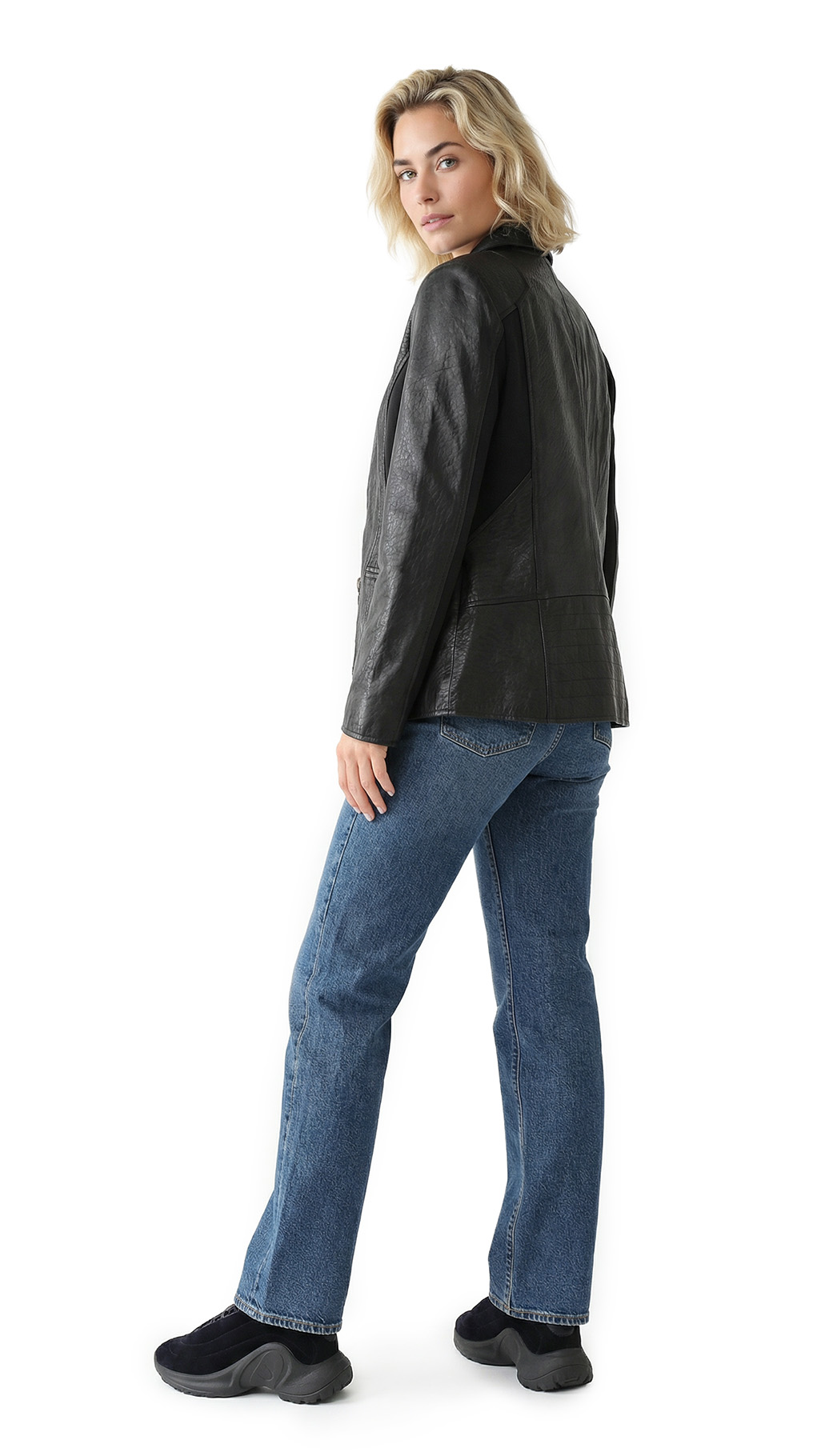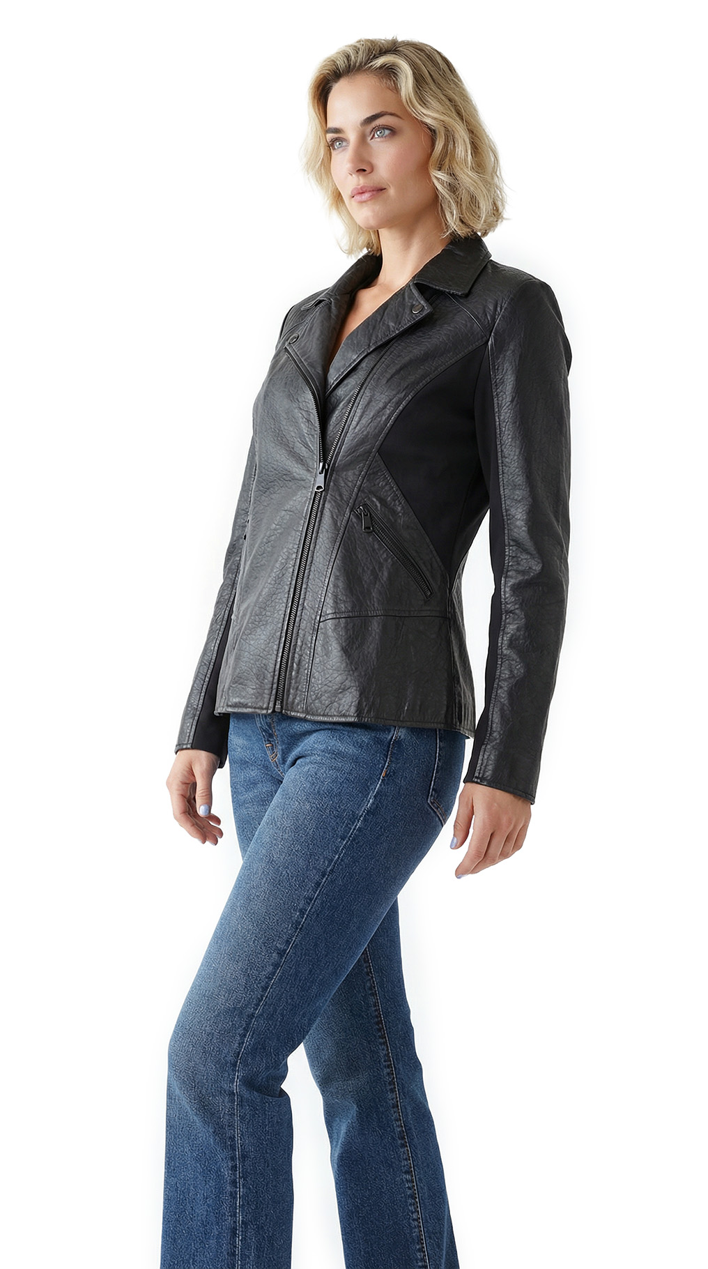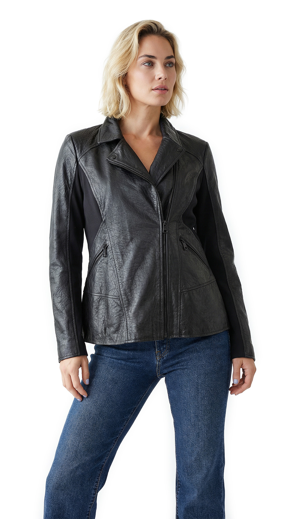 Новая кожаная куртка американского бренда Andrew Marc New York (США). Полу-приталенный фасон с трикотажными вставками по бокам и рукавам — обеспечивают комфорт в движении. Застёжка на молнию: можно застегнуть до конца, а можно отвернуть лацканы. На плечах и задней кокетке оригинальная декоративная отстрочка. Боковые кармашки на молнии. В составе: 100% натуральная овечья кожа, мягкая, фактурная. Оригинал из США. Состояние — новое, с фирменной биркой. Розничная цена — 425$ (!).