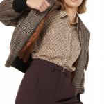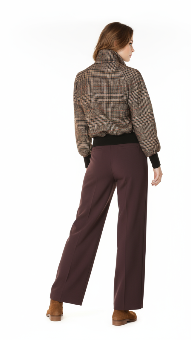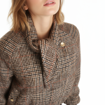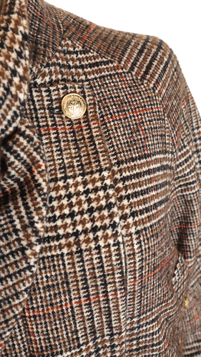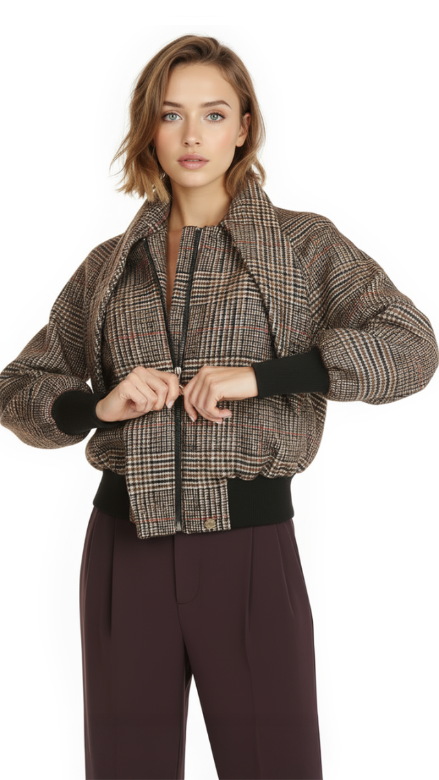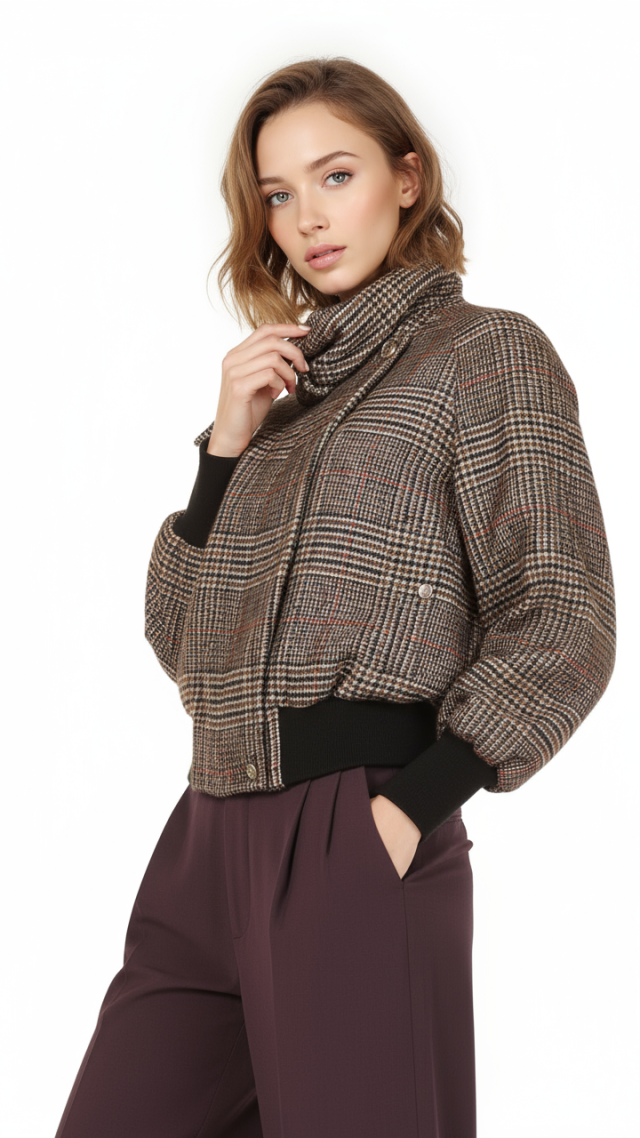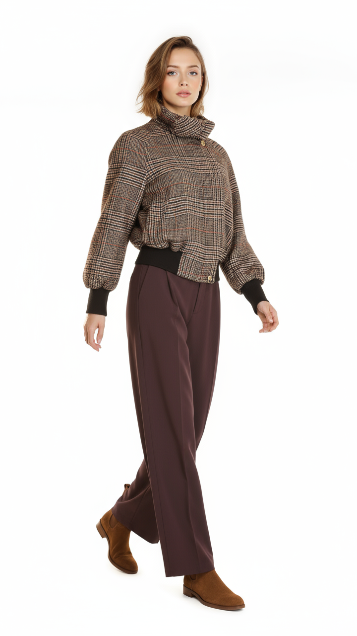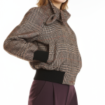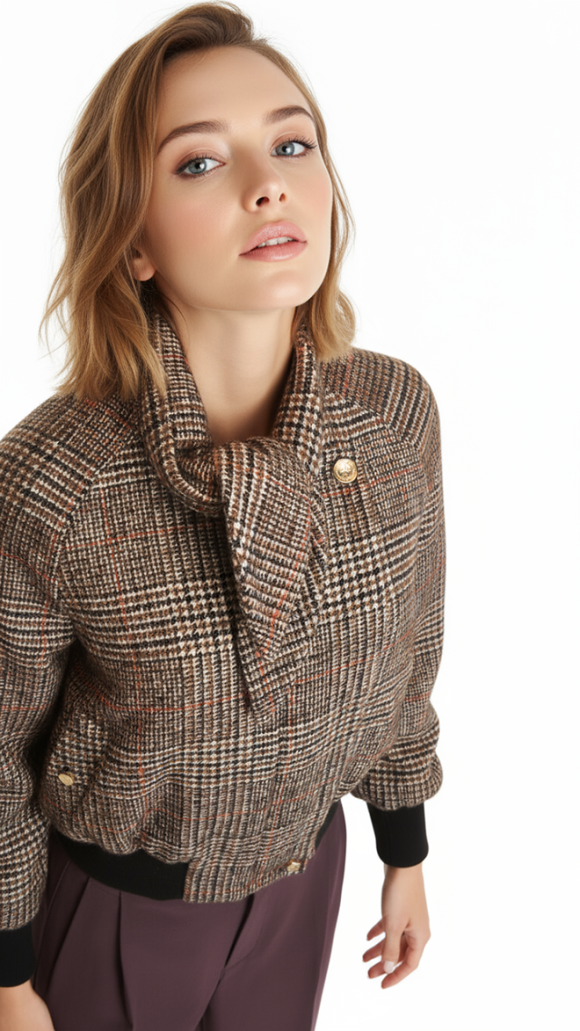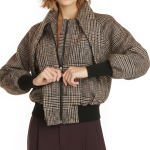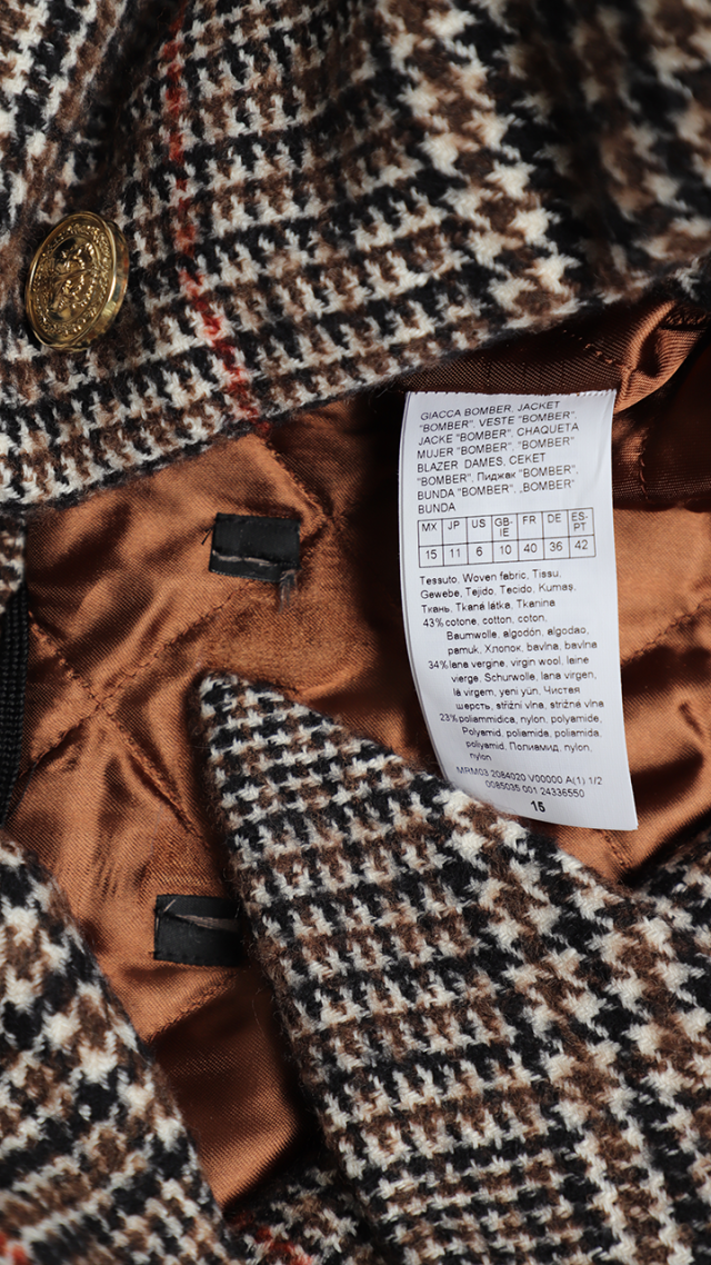 Оригинал. Новый бомбер концерна Max Mara (линия Marina Rinaldi) в шотландскую клетку коричневых тонов. Свободный укороченный покрой с широкой резинкой на талии и манжетах. Воротничок аскот с лентами, которые можно позвязать в элегантный бант или заправить внуть. Свободный приспущенный рукав. Кармашки по бокам с золотыми гербовыми пуговками. Застежка на молнию и гербовые пуговки. Шелковистый ромбовый подклад с утеплителем. В составе: 34% шерсть, 43% хлопок, 23% полиамид, на подкладе из 60% натурального шелкового ацетата и 40% вискозы — ткань экстра качества: плотная, мягкая, хорошо драпируется. Состояние — новое, из аутлета концерна MaxMara (ярлык бренда надрезан — это политика аутлета).