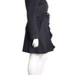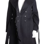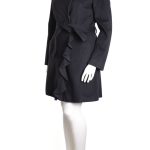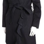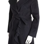Новое шерстяное пальто американского бренда Ellen Tracy черного цвета. Женственный приталенный покрой, слегка расклешенный от талии, с подвязкой на пояс и застежкой на потайные кнопки. Красивая декоративная оборка по низу. Классический отложной воротничок — можно застегнуть на пуговку или отвернуть в лацканы. Врезные кармашки по бокам. В составе: 100% шерсть, на подкладе из 100% натурального ацетата — ткань мягкая, бархатистая, фактурная (с небольшим ворсом). Состояние — новое, без бирки.