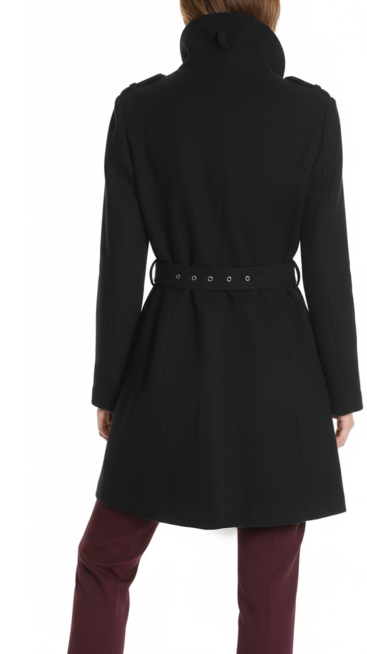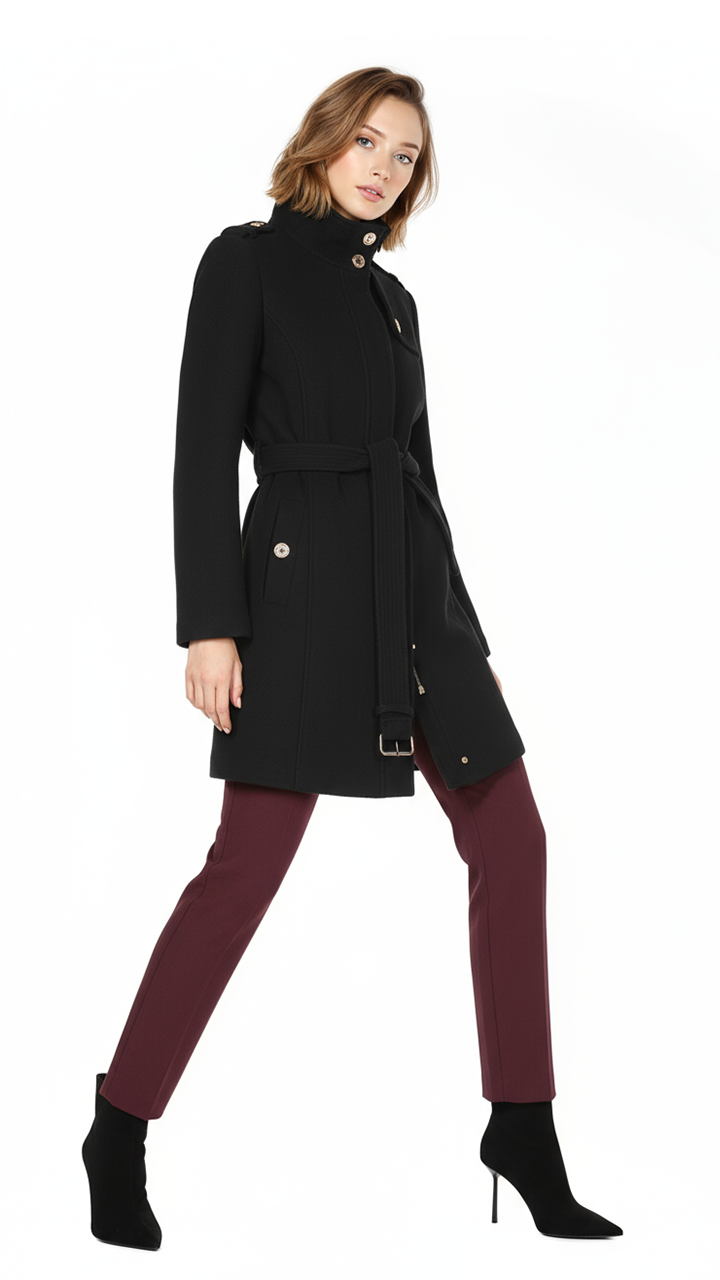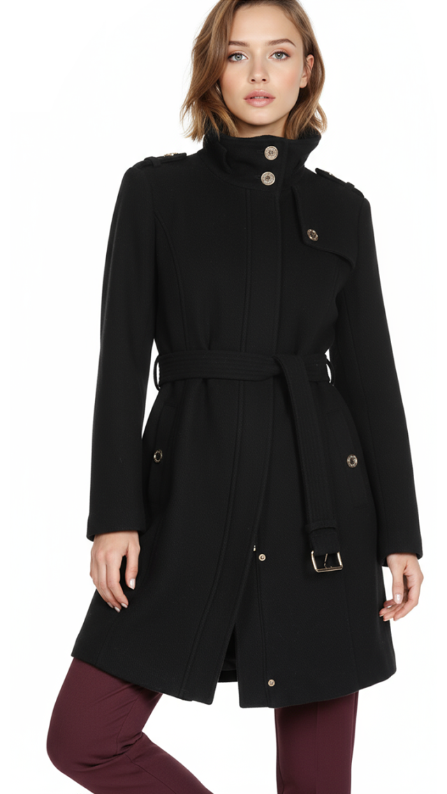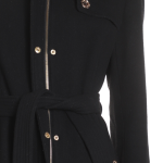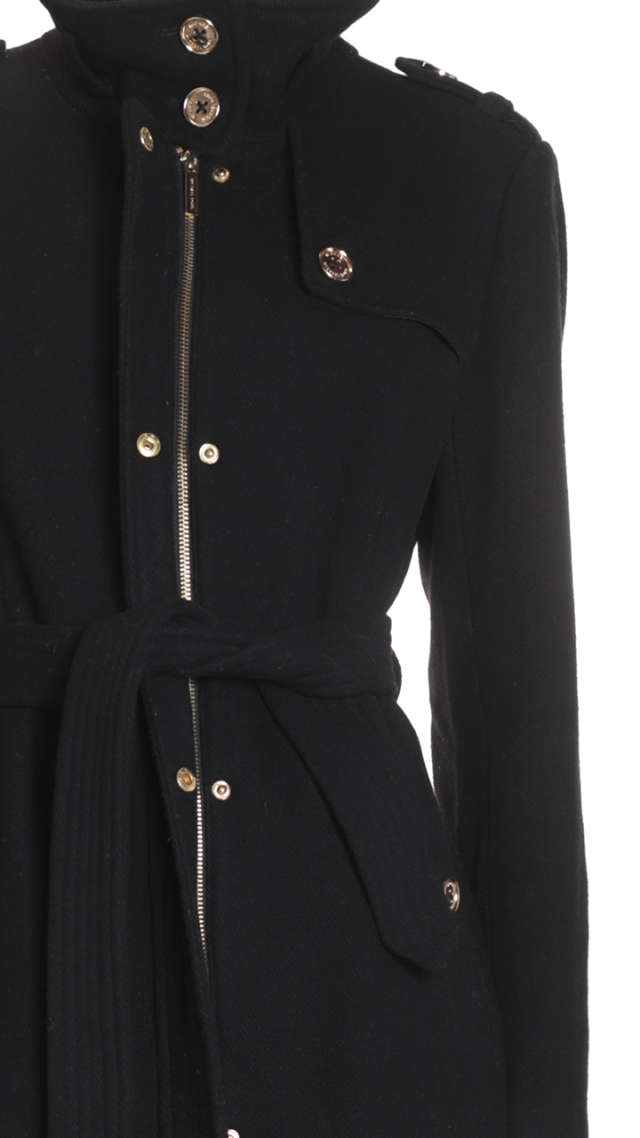 Новое шерстяное пальто американского бренда Michael Kors черного цвета с яркой фирменной золотой фурнитурой с гравировкой бренда. Приталенный фасон с застежкой на молнию и кнопки, и подвязкой на пояс. Объемный воротничок стойка. Эполеты на плечах. Врезные кармашки. В составе 52% шерсть, 37% п.э, 6% вискоза, 3% нейлон, 2% акрил, на подкладе из п.э: ткань плотная, драповая, «в рубчик», очень теплая (подойдет даже зимой, на легкий мороз). Состояние — новое, с биркой американского гипермаркета Nordstrom. Цена на бирке — 285$.