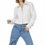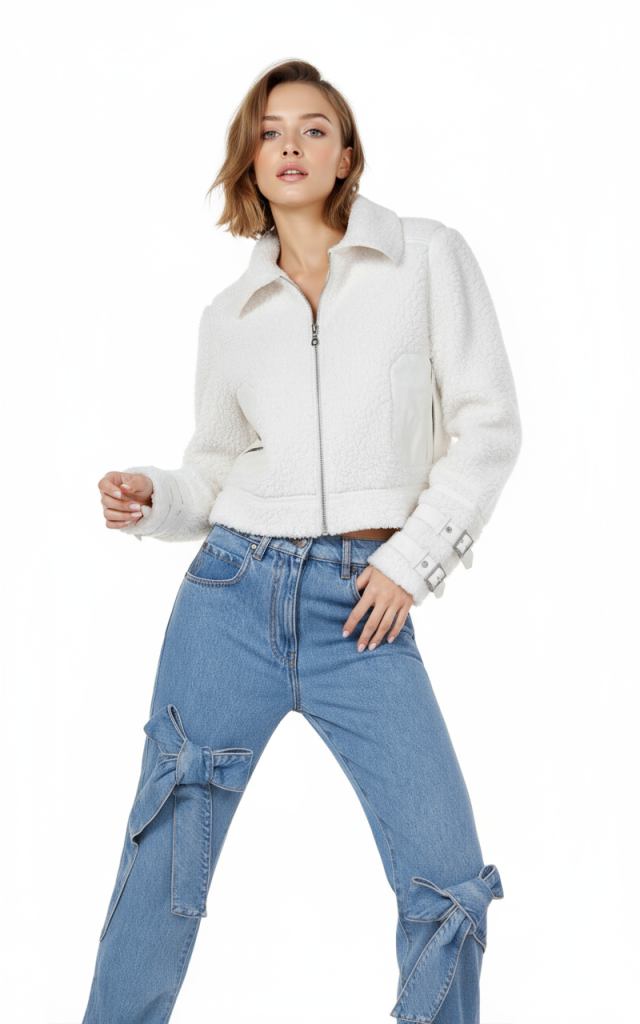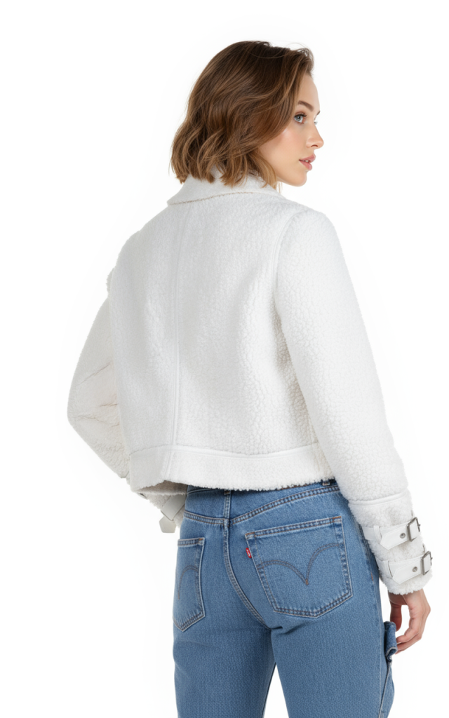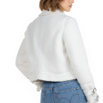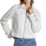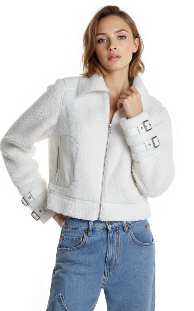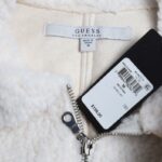 Новый жакет Guess «под овчинку» теплого молочного цвета. Укороченный свободный фасон с объемным воротничком и застежкой на молнию. Накладные боковые кармашки с отделкой «под кожу». Длинный рукав с ремешками на пряжках. С внутренней стороны отделка «под замшу». В составе: 100% п.э. — ткань мягкая, легкая и в тоже время теплая. Оригинал, привезен из США. Продается с фирменной биркой магазина Guess Los Angeles. Цена на бирке — 158$.