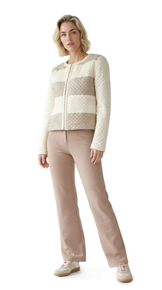 Новая куртка ветровка итальянского бренда Rinascimento цвета слоновой кости с горизонтальными вставками цвета трюфеля. Укороченный фасон с застежкой на воздушные крючки, скругленной горловиной и длинным рукавом. В составе: п/э, на подкладе из п.э — ткань легкая, по фактуре «стеганка». Состояние — новое, с фирменной биркой Rinascimento.