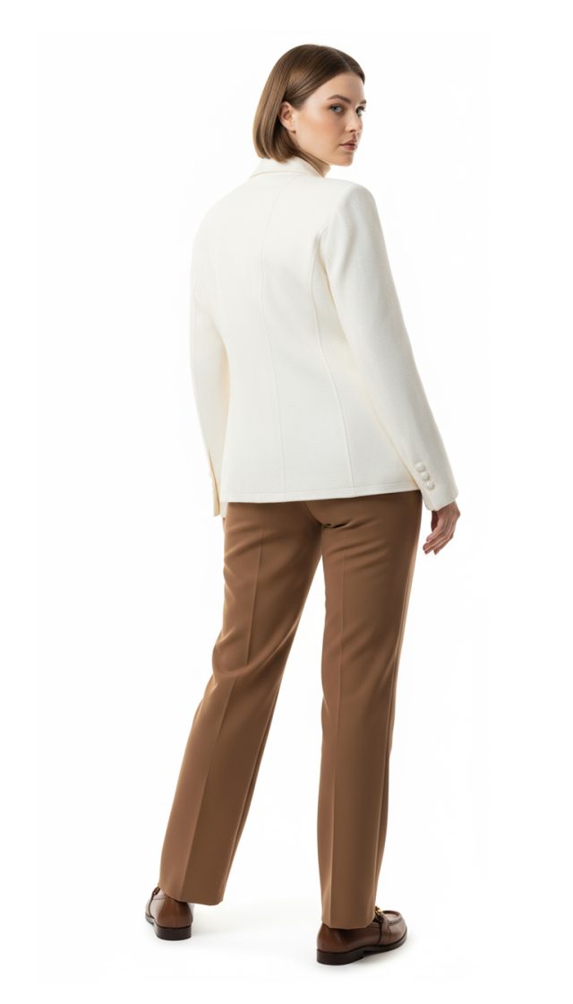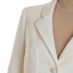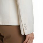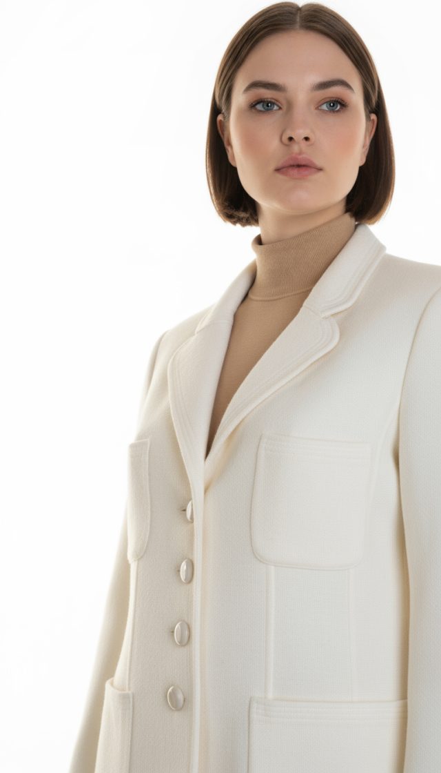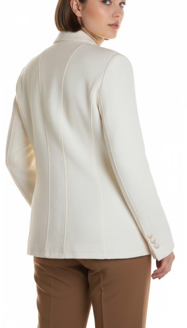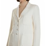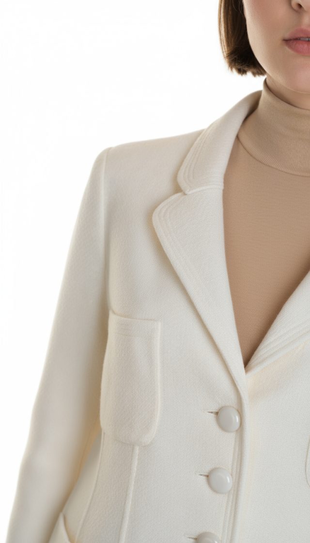 Новый шерстяной пиджак итальянского бренда Armani Collezioni цвета молочных сливок. Женственный полу-приталенный фасон с застежкой на большие перламутровые пуговки. V-вырез горловины с резным скругленным воротничком. Накладные кармашки на груди и бедрах. Длинный рукав, декорированный пуговками. В составе: 100% шерсть премиум класса (Virgin Wool), на подкладе из 97% п.э, 3% эластана — ткань с фактурным переплетением, средней плотности, отлично держит форму, немного тянется. Эксклюзив, с оригинальной запломбированной биркой. Цена на бирке — 1 525$.