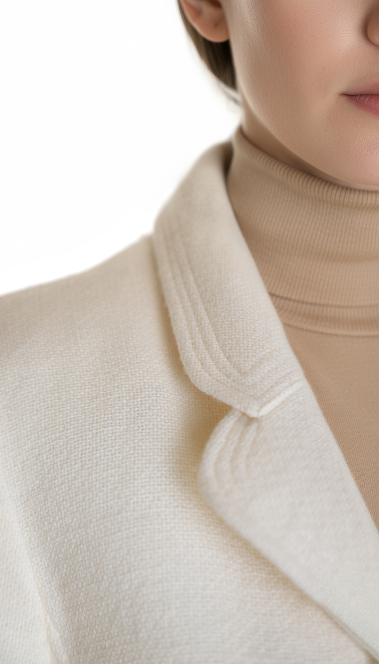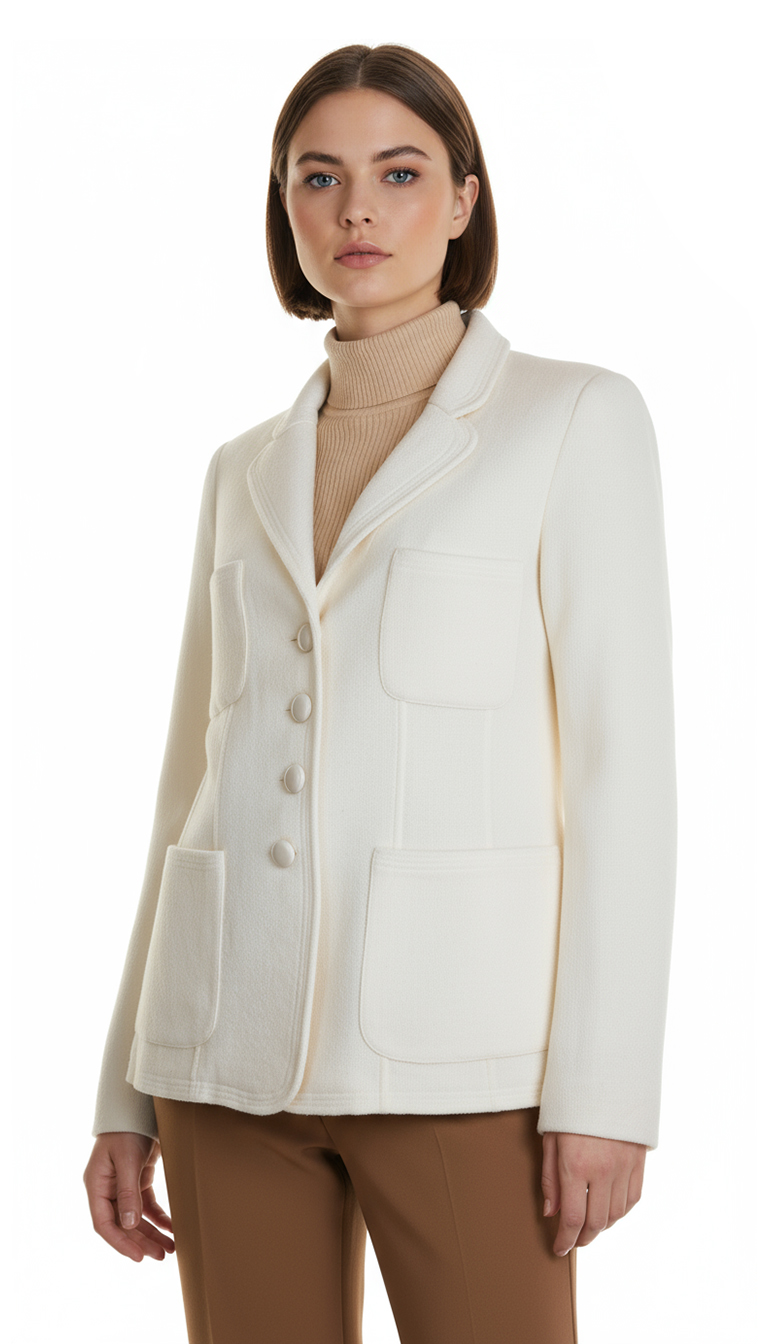 Новый шерстяной пиджак итальянского бренда Armani Collezioni цвета молочных сливок. Женственный полу-приталенный фасон с застежкой на большие перламутровые пуговки. V-вырез горловины с резным скругленным воротничком. Накладные кармашки на груди и бедрах. Длинный рукав, декорированный пуговками. В составе: 100% шерсть премиум класса (Virgin Wool), на подкладе из 97% п.э, 3% эластана — ткань с фактурным переплетением, средней плотности, отлично держит форму, немного тянется. Эксклюзив, с оригинальной запломбированной биркой. Цена на бирке — 1 525$.