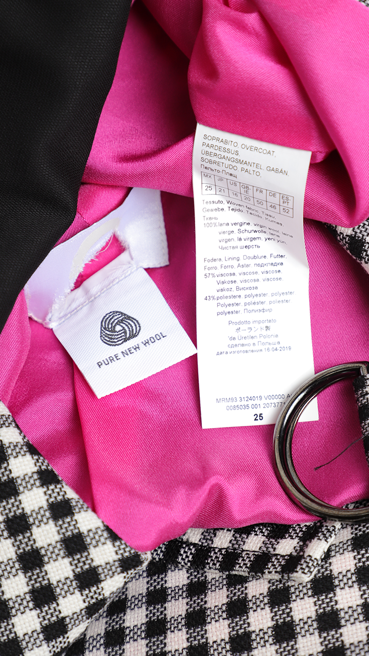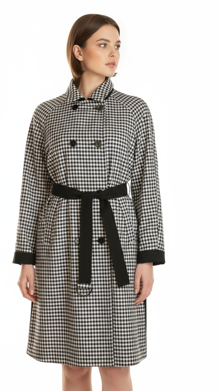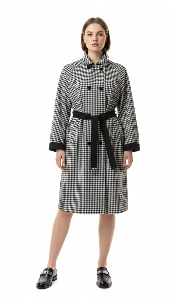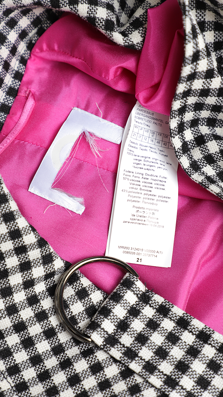 Оригинал. Новый шерстяной пиджак концерна Max Mara (линия Marina Rinaldi) в мелкую черно-белую клетку спереди и черный — по спинке. Удлиненный двубортный фасон, слегка расклешенный от талии, с подвязкой на двусторонний пояс и застежкой на пуговки. Длинный приспущенный рукав реглан с отворачиваемыми черными манжетами. Классический отложной воротничок, с внутренней стороны — черный. Врезные кармашки по бокам. Яркий розовый подклад. Пошив — Европа (Польша). В составе: 100% шерсть виргинская, на подкладе из 57% вискозы, 43% п.э — ткань экстра качества: средней плотности, мягкая, шелковистая на ощупь. Состояние — новое, из аутлета концерна Max Mara (ярлык бренда надрезан — это политика аутлета).