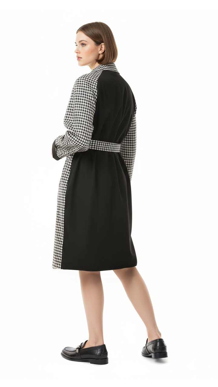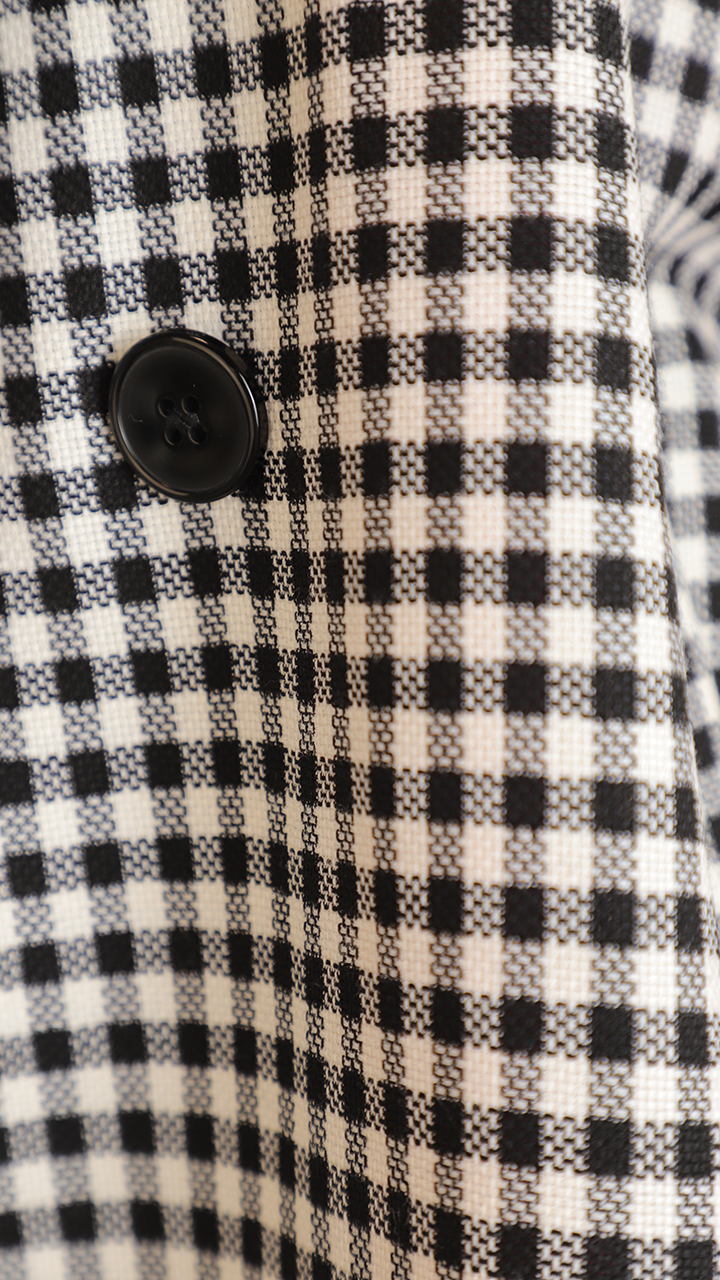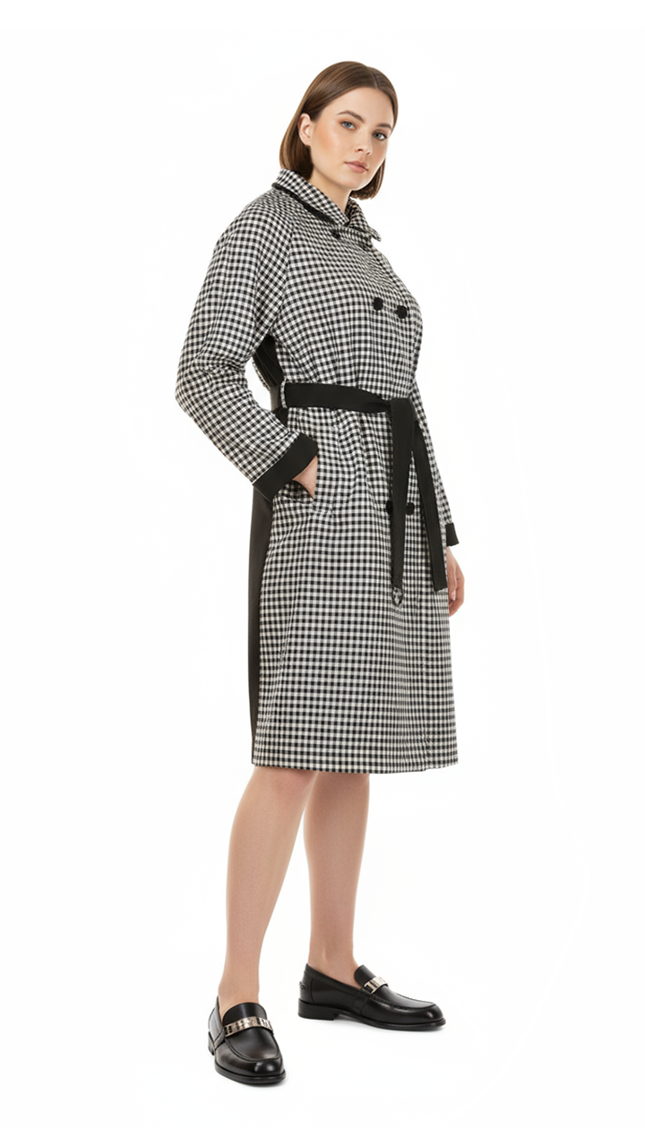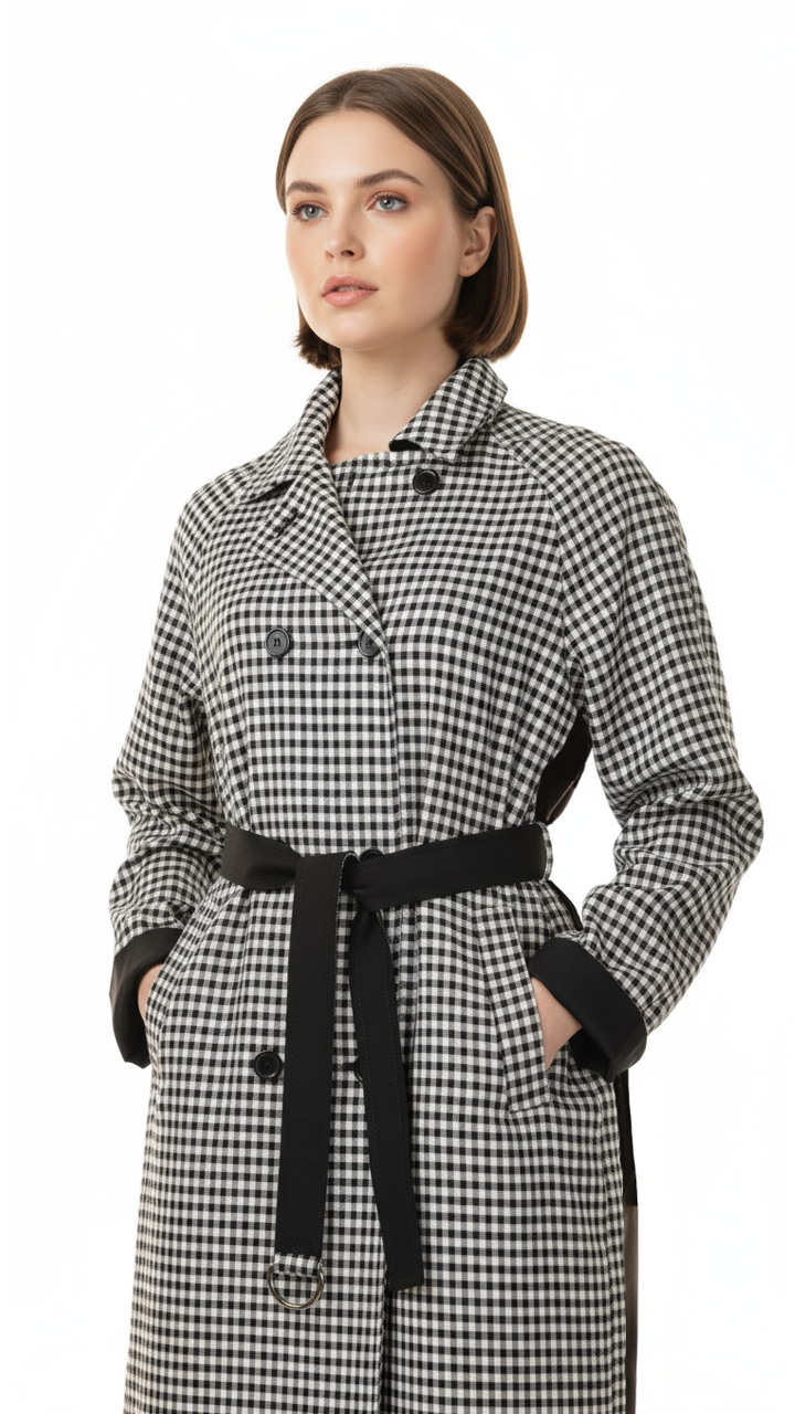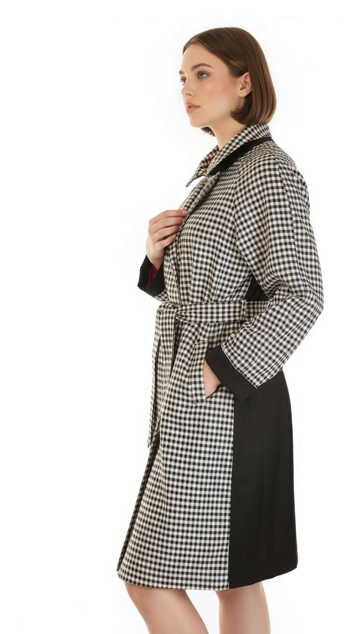 Оригинал. Новый шерстяной пиджак концерна Max Mara (линия Marina Rinaldi) в мелкую черно-белую клетку спереди и черный — по спинке. Удлиненный двубортный фасон, слегка расклешенный от талии, с подвязкой на двусторонний пояс и застежкой на пуговки. Длинный приспущенный рукав реглан с отворачиваемыми черными манжетами. Классический отложной воротничок, с внутренней стороны — черный. Врезные кармашки по бокам. Яркий розовый подклад. Пошив — Европа (Польша). В составе: 100% шерсть виргинская, на подкладе из 57% вискозы, 43% п.э — ткань экстра качества: средней плотности, мягкая, шелковистая на ощупь. Состояние — новое, из аутлета концерна Max Mara (ярлык бренда надрезан — это политика аутлета).