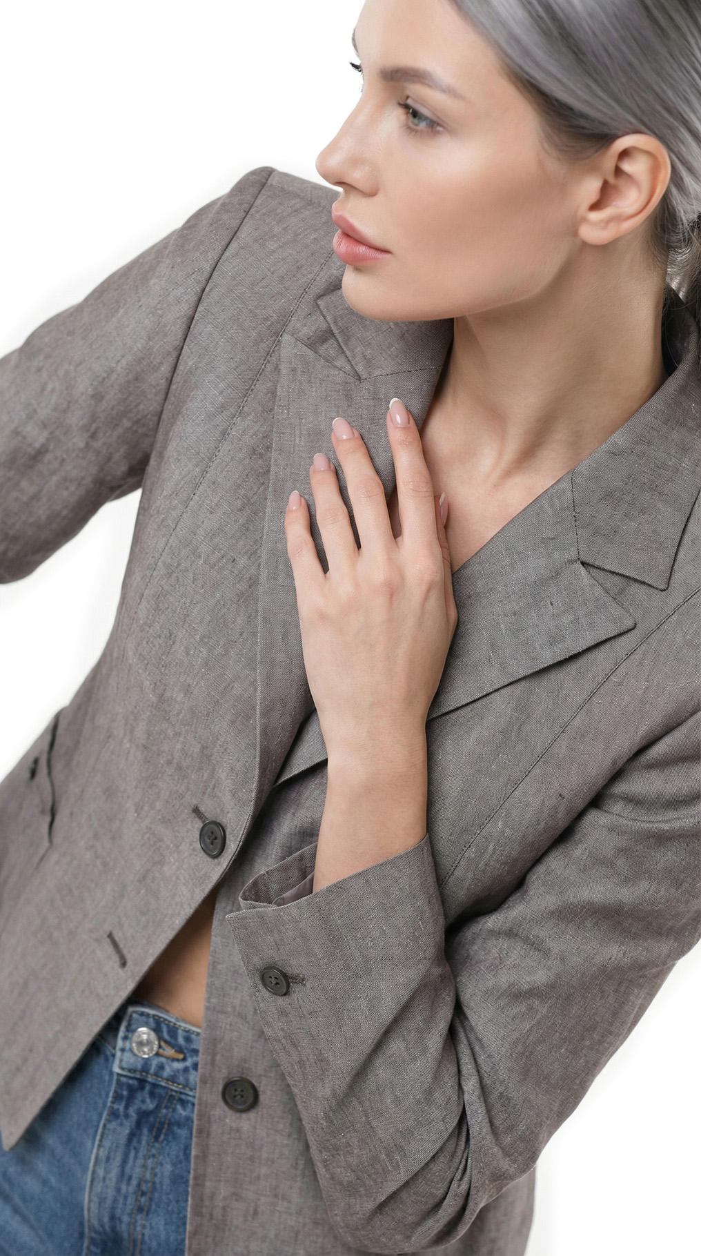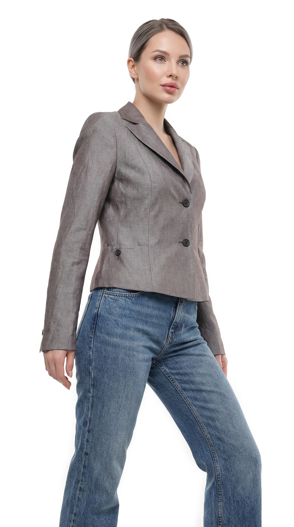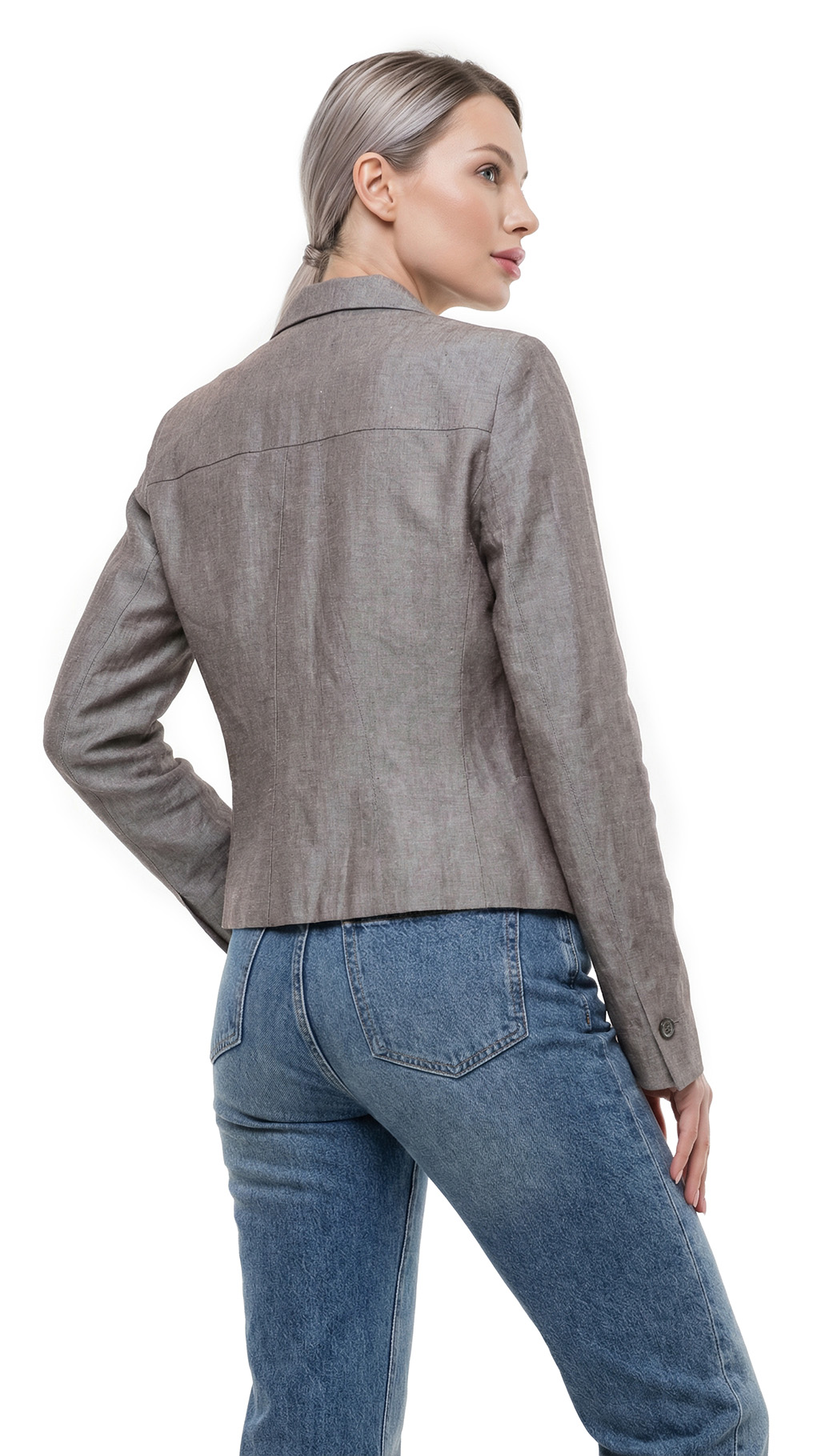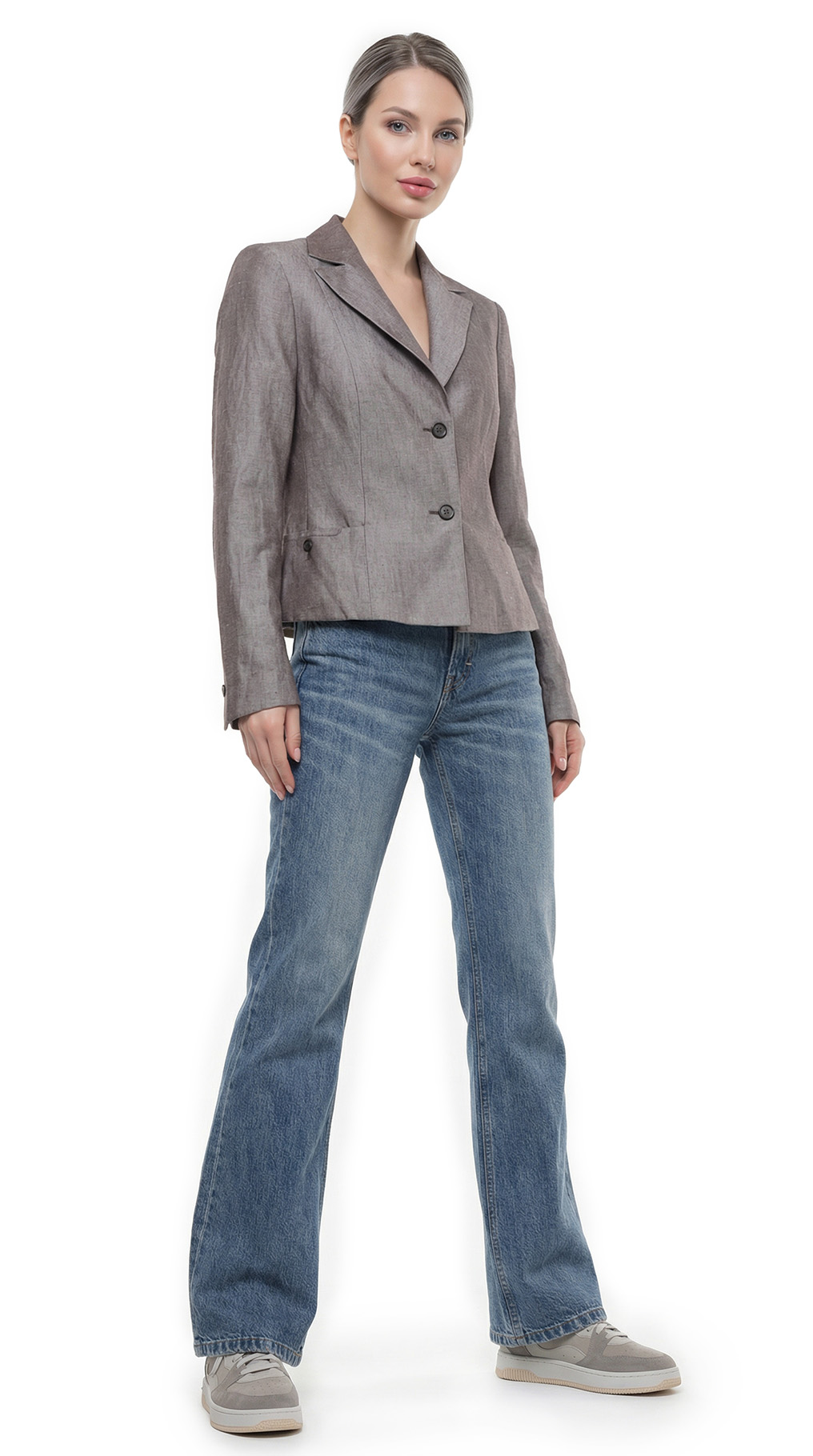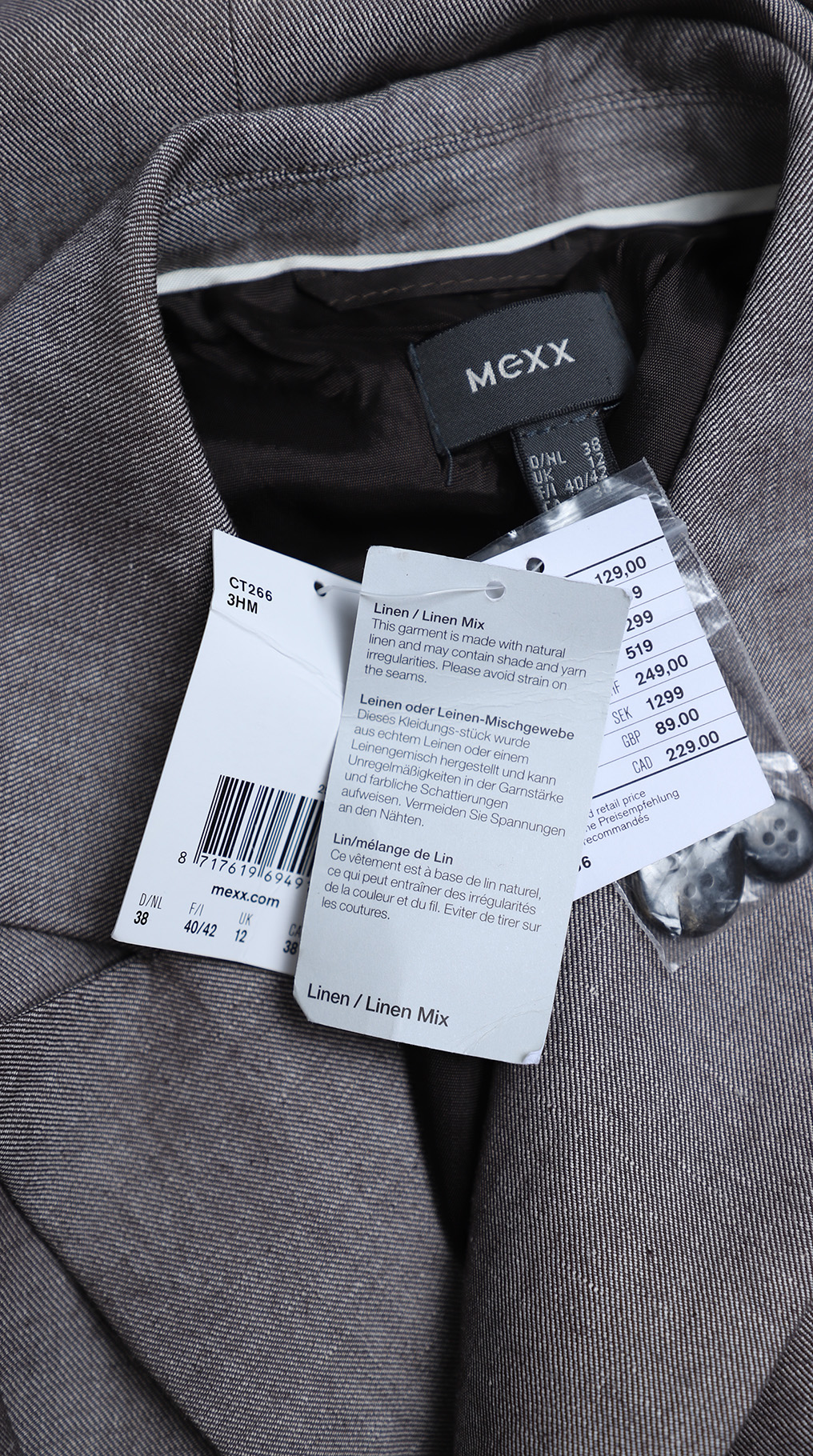 Новый льняной пиджак популярного голландского бренда Mexx светлого серо-бежевого цвета. Укороченный приталенный фасон с длинным рукавом. Застежка на пуговки. Отложной воротничок с резными лацканами. Накладные кармашки по бокам. В составе: 59% лен, 33% вискоза, 8% п.э, на подкладе из натурального ацетата — ткань средней плотности, шелковистая. Состояние — новое, с фирменной биркой Mexx. Цена на бирке — 129 евро.