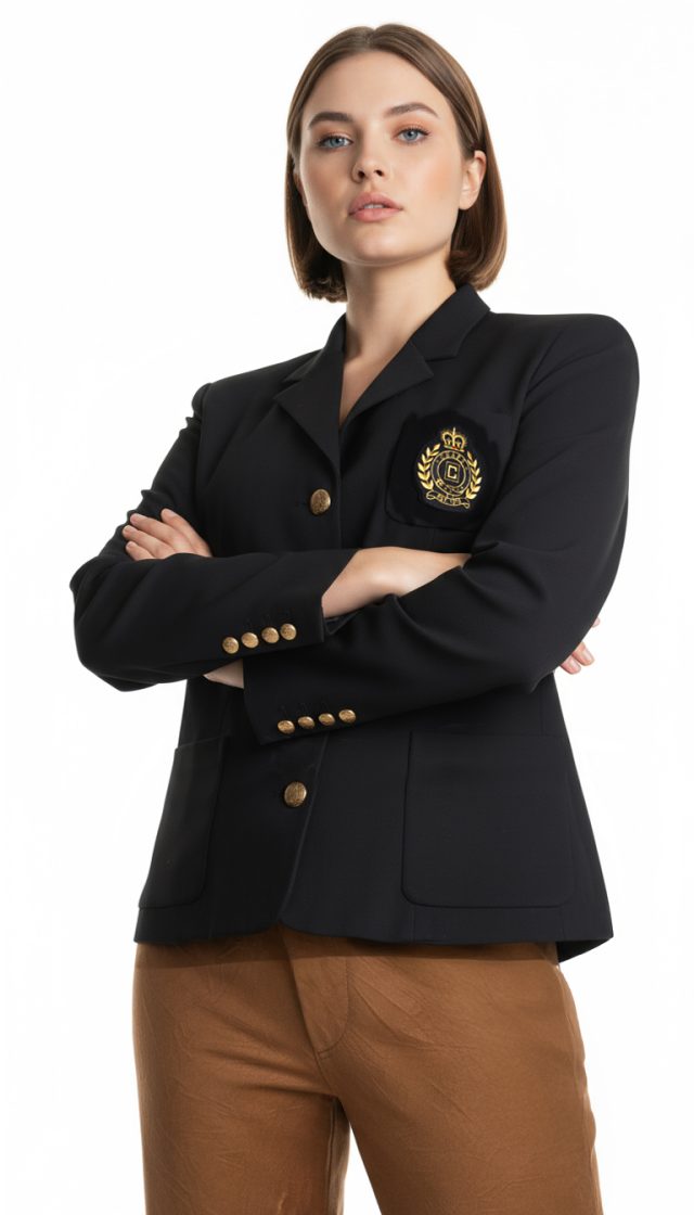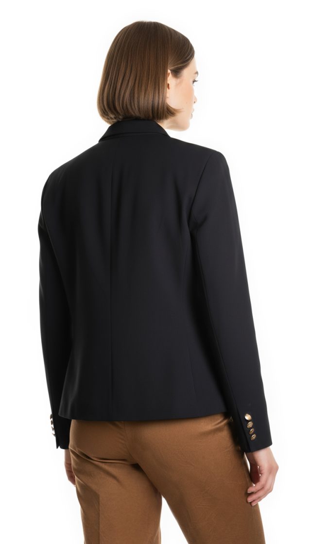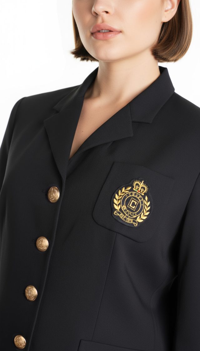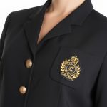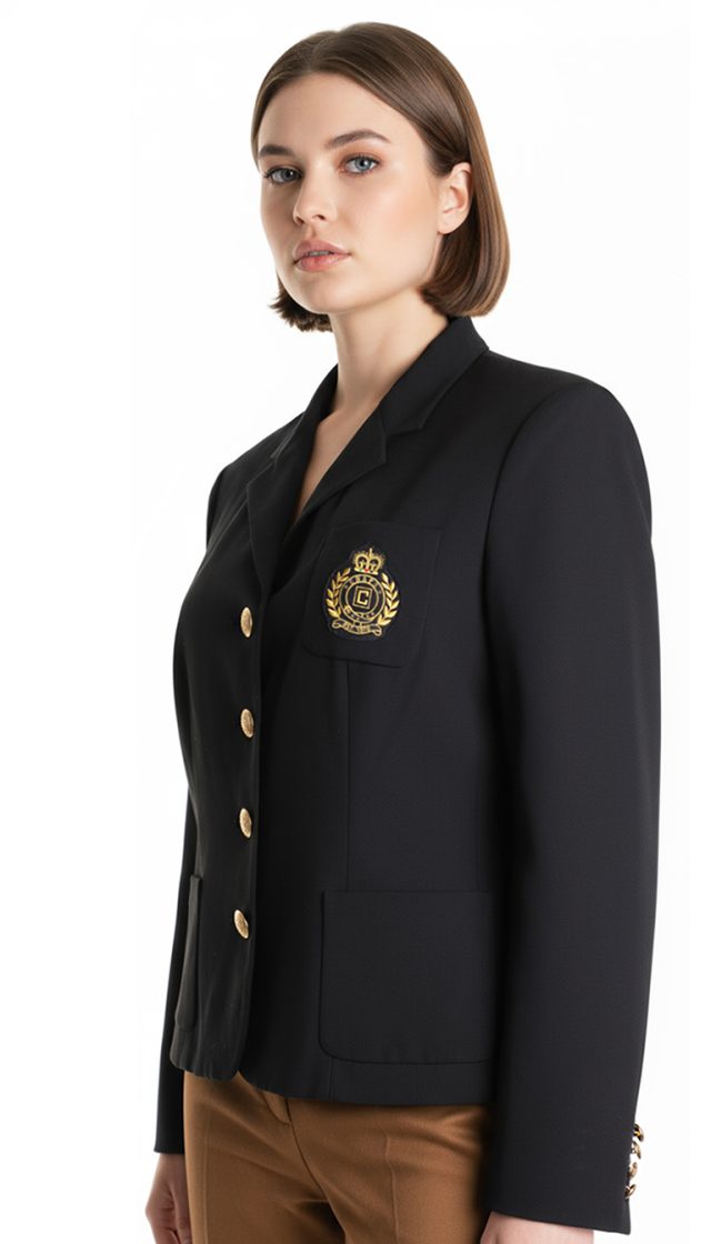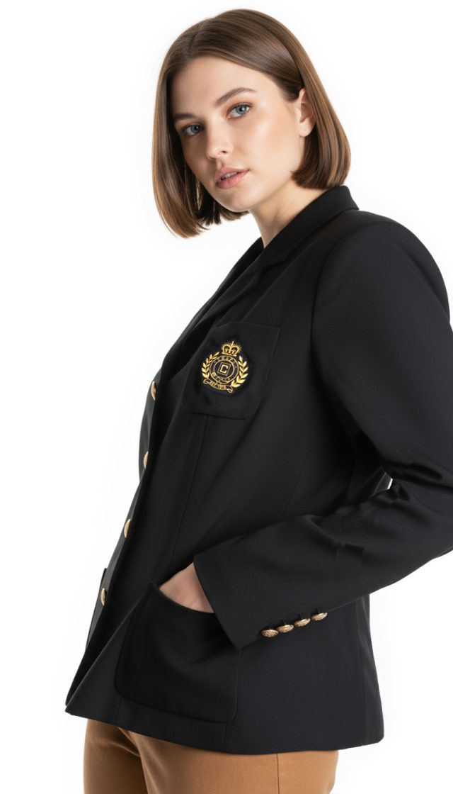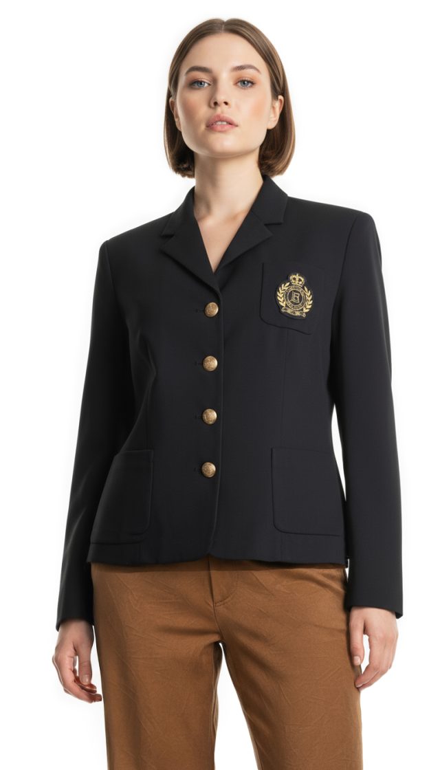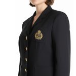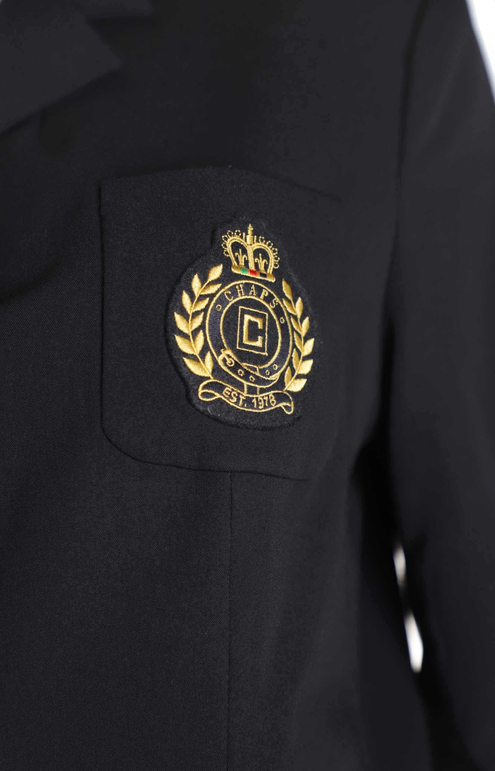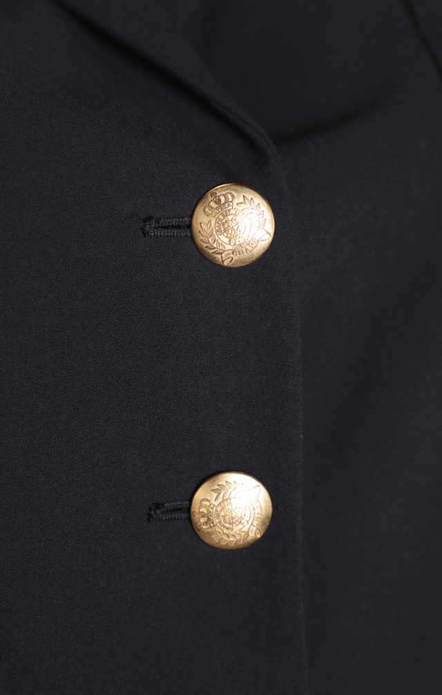 Новый пиджак премиального американского бренда Ralph Lauren (коллекция Chaps) черного цвета с фирменной золотой гербовой эмблемой на груди. Полу-приталенный покрой с застежкой на массивные золотые пуговки. Классический воротничок с резными лацканами. Накладные кармашки по бокам. Длинный рукав, декорированный пуговками. В составе: 20% вискоза, 75% п.э, 5% эластан, на подкладе из п.э — ткань экстра качества: средней плотности, мягкая. Оригинал из США. Состояние — новое.