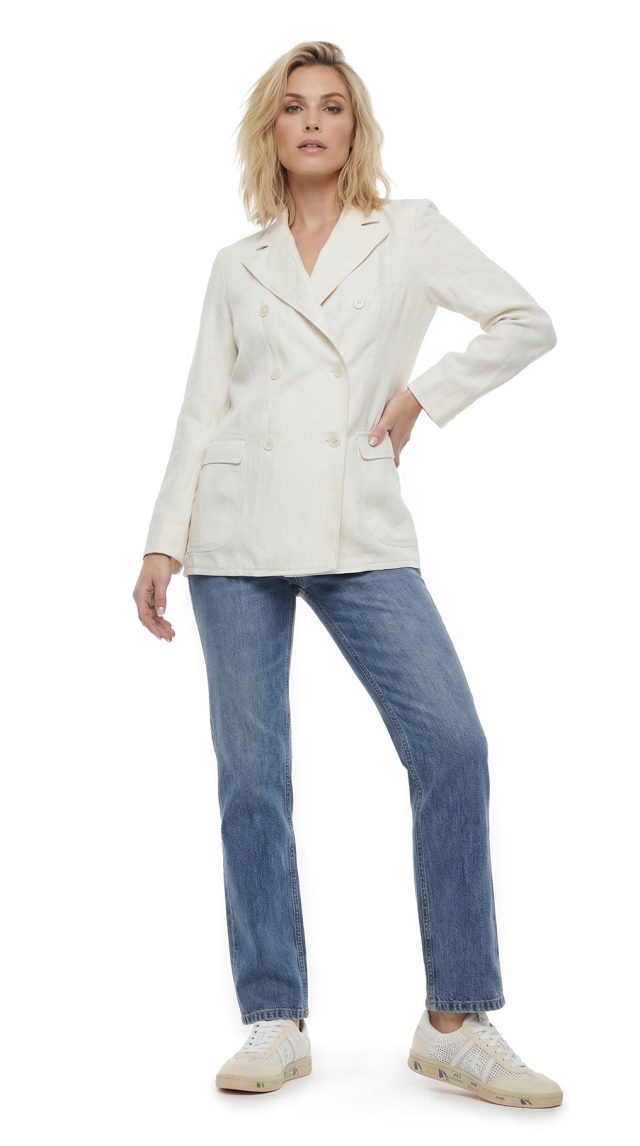 Оригинал. Новый льняной пиджак Ralph Lauren (коллекция Denim & Supply) цвета слоновой кости. Удлиненный, слегка приталенный, двубортный фасон с большими накладными кармашками. Красивый резной воротничок с петельками. Кармашек под платочек. Застежка на перламутровые пуговки (в т.ч. одну потайную). Длинный рукав, декорированный пуговками. В составе: 100% лен, без подклада — ткань экстра качества, с «живой» фактурой натурального льна. Оригинал из США. Состояние — новое, с фирменной биркой магазина Ralph Lauren. Цена на бирке — 225$.