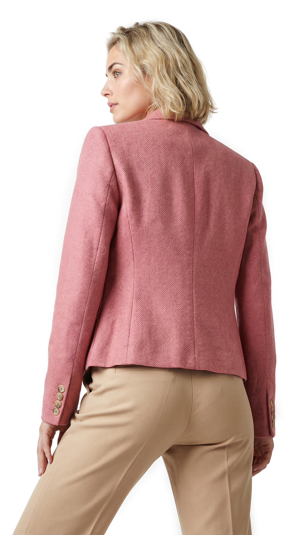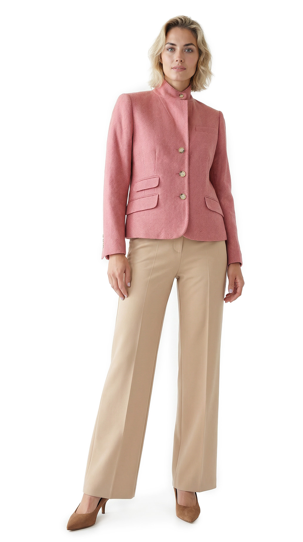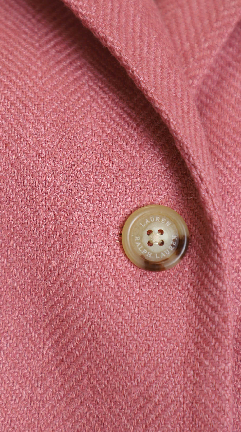 Новый пиджак Ralph Lauren цвета пыльной розы с длинным рукавом и классическим резным воротничком, который можно превратить в воротничок стойку застежкой на пуговку, из смеси льна, вискозы, хлопка и шелка.