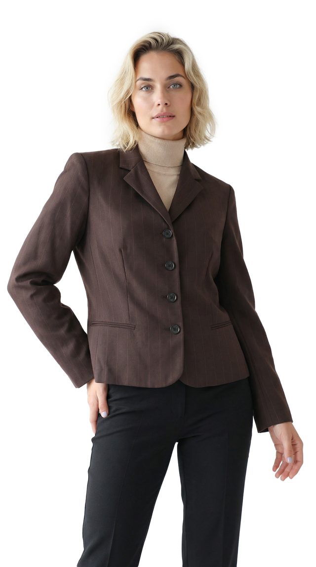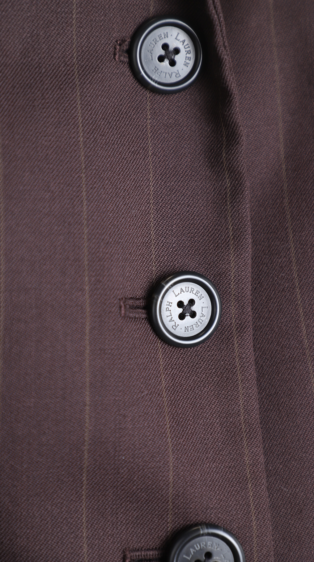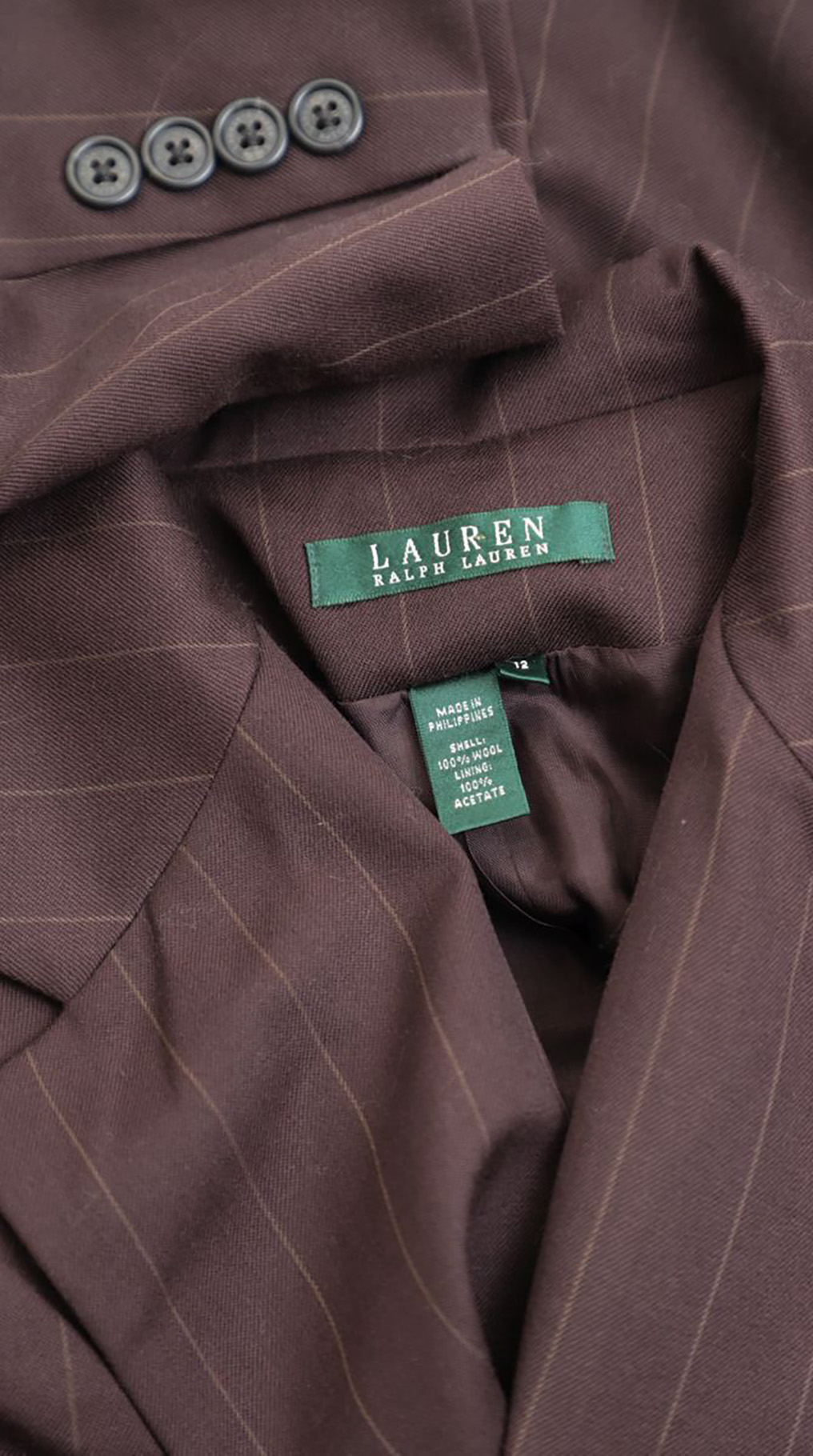 Новый шерстяной пиджак Ralph Lauren шоколадного цвета в продольную полоску. Классический приталенный фасон с отложным воротничком и длинным рукавом, декорированным пуговками. Врезные кармашки по переду. Застежкой на пуговки с гравировкой бренда. В составе: 100% шерсть — ткань экстра качества: мягкая, практически невесомая, на подкладе из натурального ацетата. Оригинал из США. Состояние — новое, без бирки.