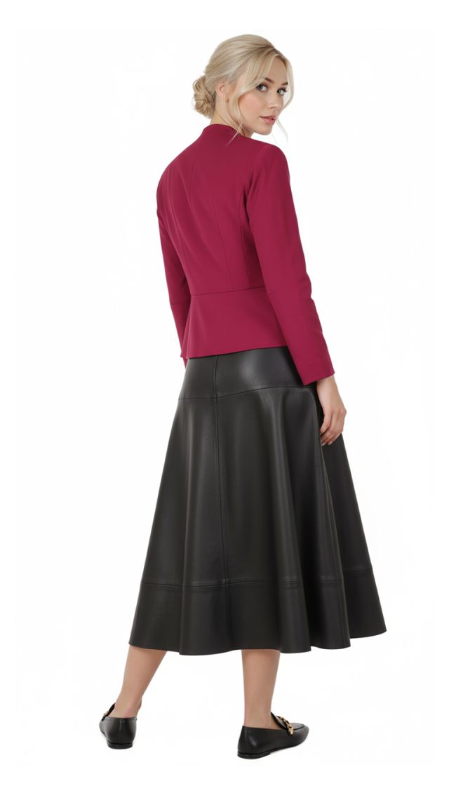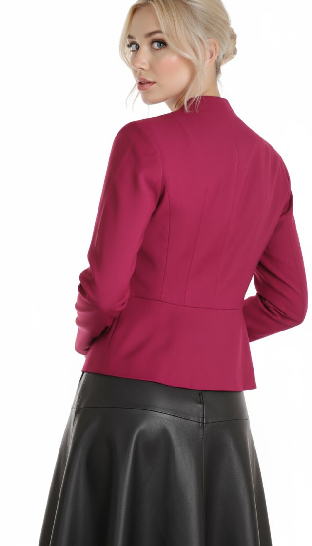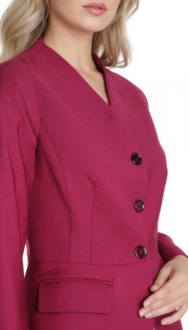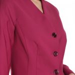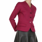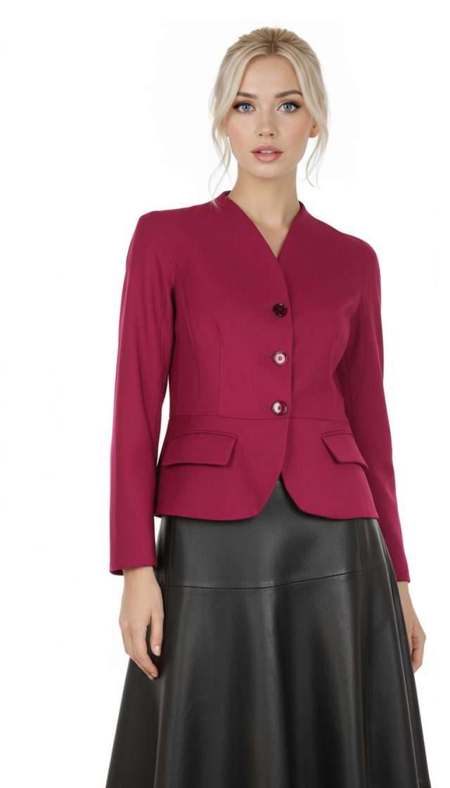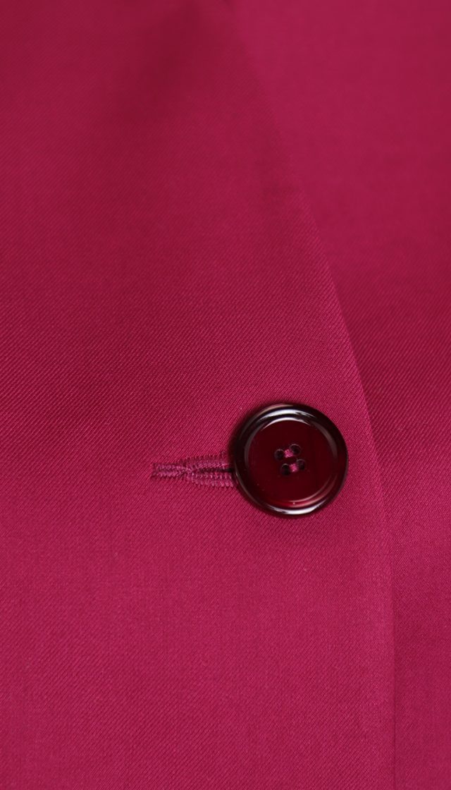 Женственный жакет BGL цвета черешни. Приталенный фасон с резными вытачками и кокеткой по талии. Застежка на большие пуговки. Красивый скругленный вырез горловины. Врезные кармашки с клапанами. Укороченный рукав реглан. В составе: 12% шерсть, 45% вискоза, 40% п/э, 3% эластан, на подкладе из 35% вискозы, 63% п/э. Состояние идеальное, как новое.