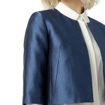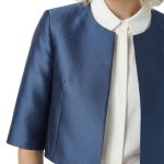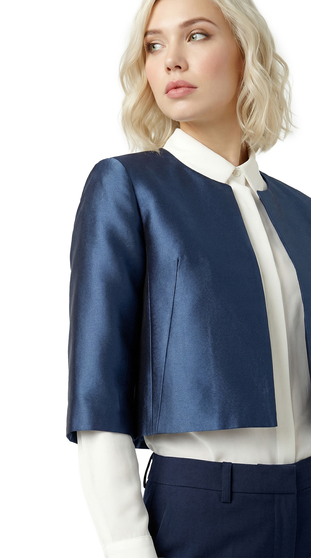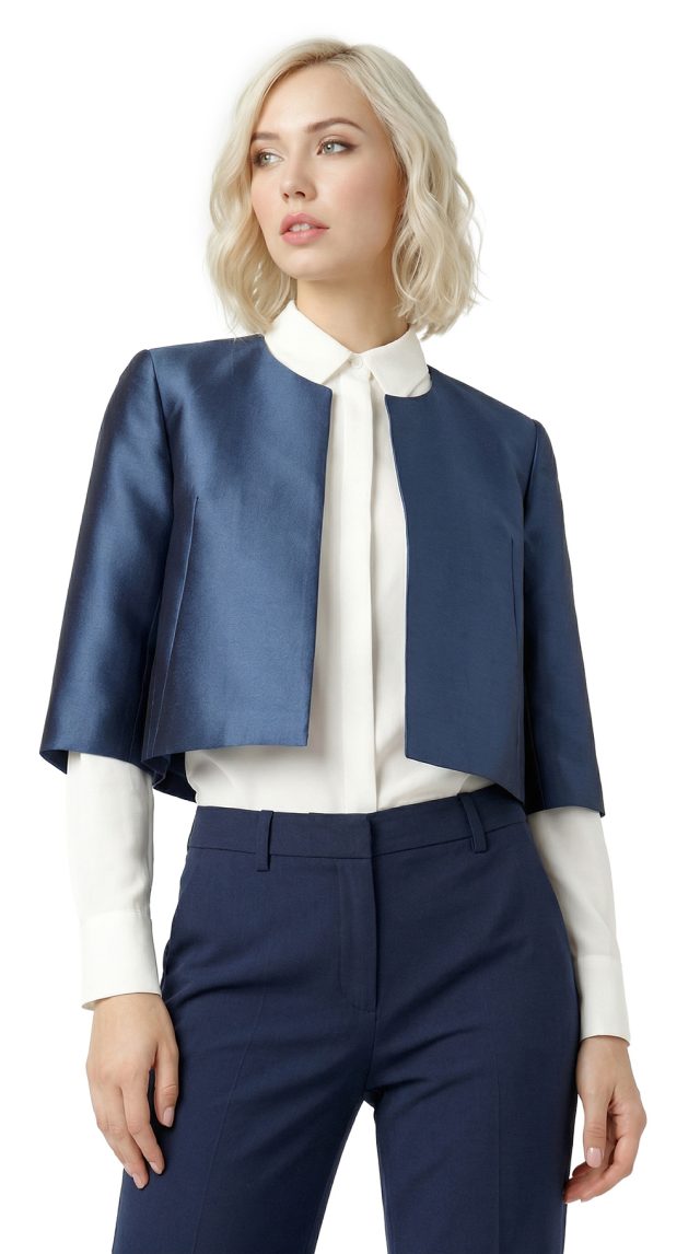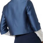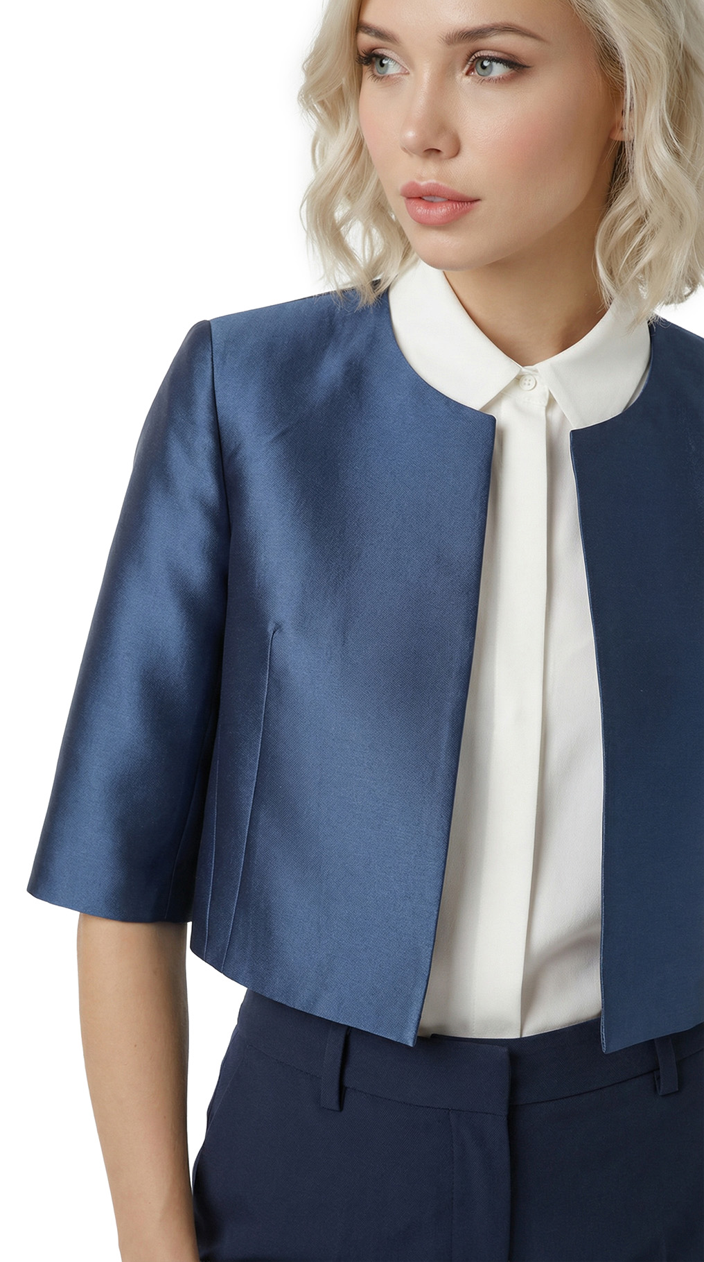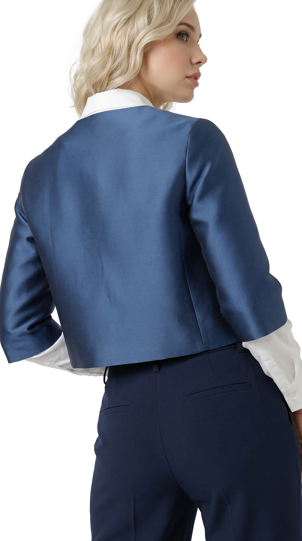 Оригинал. Жакет-болеро концерна Max Mara сине-голубого цвета с красивым стальным отливом. Свободный прямой укороченный фасон на запах, без застежки, с рукавом 1/2. В составе: 39% хлопок, 16% натуральный шелк, 45% п.э, на подкладе из 100% хлопка — ткань экстра качества: средней плотности, мягкая, шелковистая, хорошо держит форму. Состояние — новое, из аутлета концерна MaxMara (ярлык бренда надрезан — это политика аутлета).
