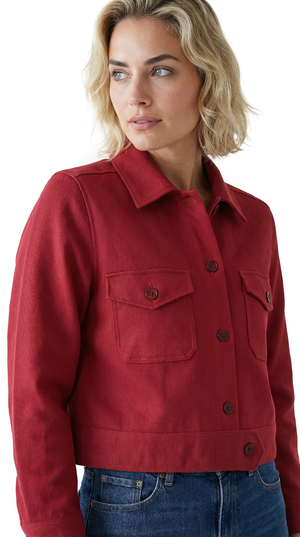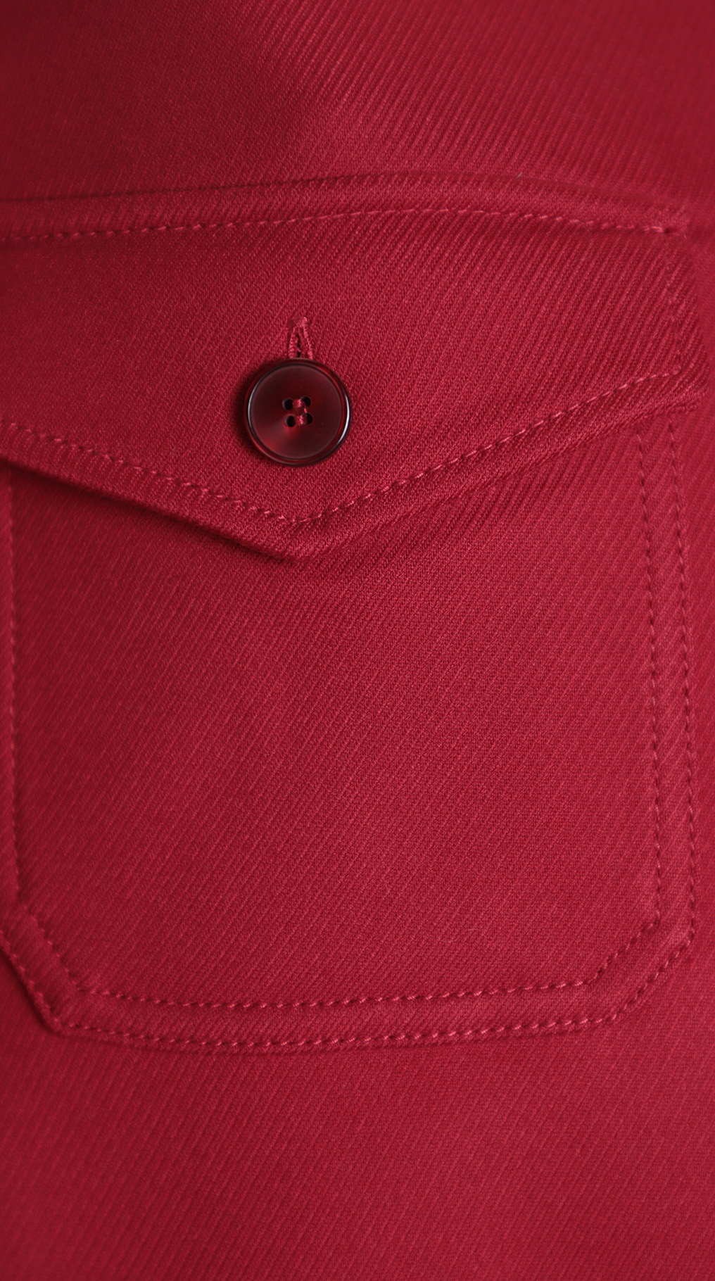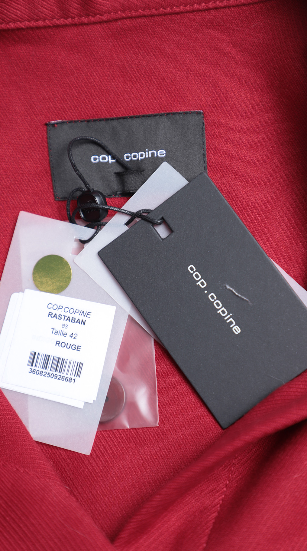 Новый жакет легендарного французского бренда Cop Copine красного цвета. Укороченный фасон с длинным рукавом и застежкой на перламутровые пуговки. Большие накладные кармашки. Классический воротничок. Баска по низу с пуговками — можно регулировать обхват. В составе: 64% п.э, 35% вискоза, 1% эластан, без подклада — ткань плотная, мягкая, по фактуре в мелкий «рубчик». Состояние — новое, с оригинальной запломбированной биркой Cop Copine.