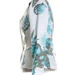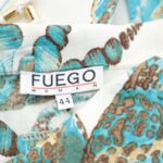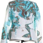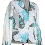 Льняной жакет Fuego белого цвета с ярким принтом в зелено-золотисто-голубых тонах. Женственный приталенный фасон с подвязкой по спинке и длинным рукавом. Втачные кармашки спереди. Застежка на перламутровые пуговки. В составе — 100% натуральный лен: ткань легкая, мягкая — идеальный вариант на лето. Без подклада. Состояние — идеальное, как новое.