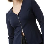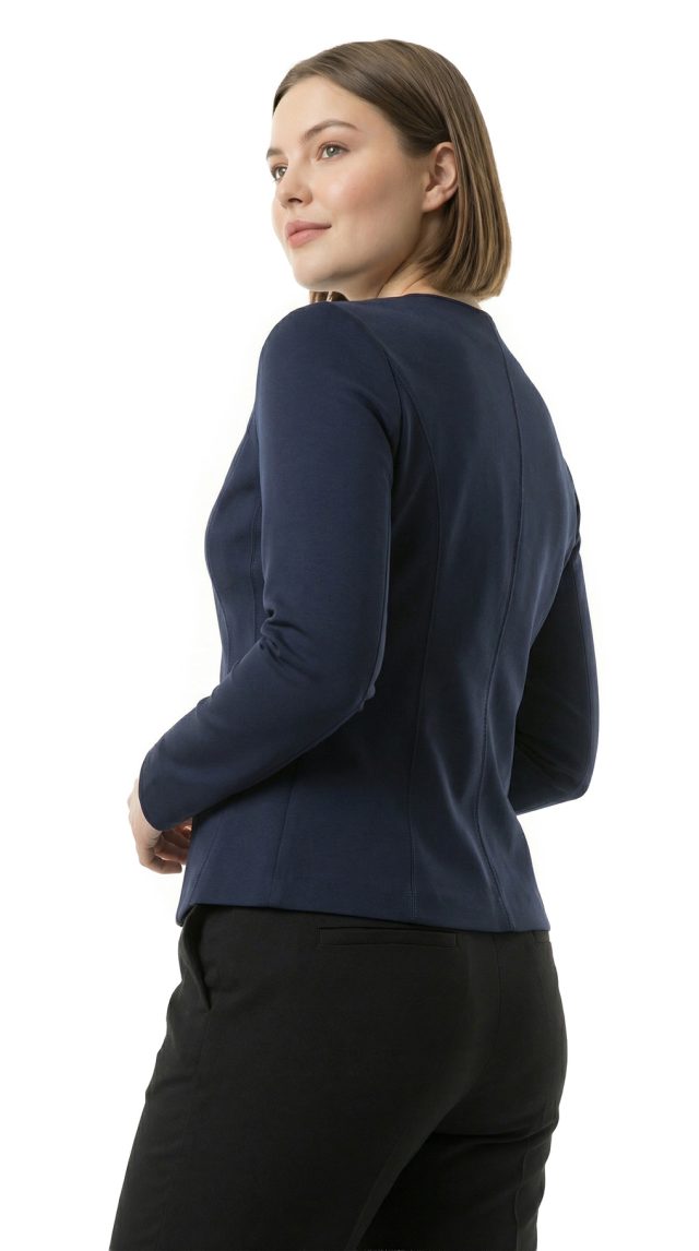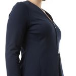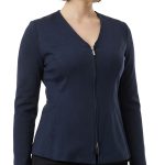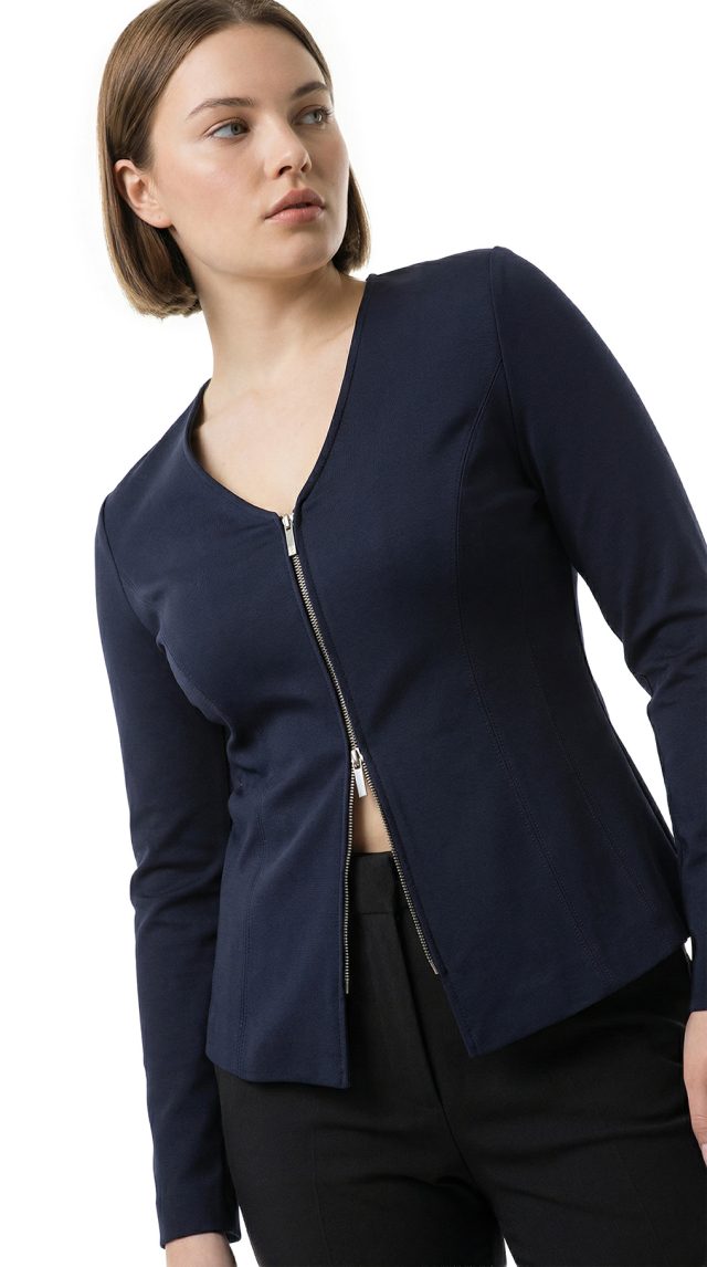 Оригинал. Трикотажный жакет концерна Max Mara (линия Marina Rinaldi) темно-синего (почти черного) цвета. Женственный приталенный фасон с длинным рукавом, V-образным вырезом горловины и застежкой на двустороннюю молнию. В составе: 65% вискоза, 30% полиамид, 5% эластан, без подклада — ткань экстра качества: средней плотности, бархатистая, хорошо тянется и садиться точно по фигурке. Пошив — Тунис. Состояние — новое, из аутлета концерна MaxMara (ярлык бренда надрезан — это политика аутлета).