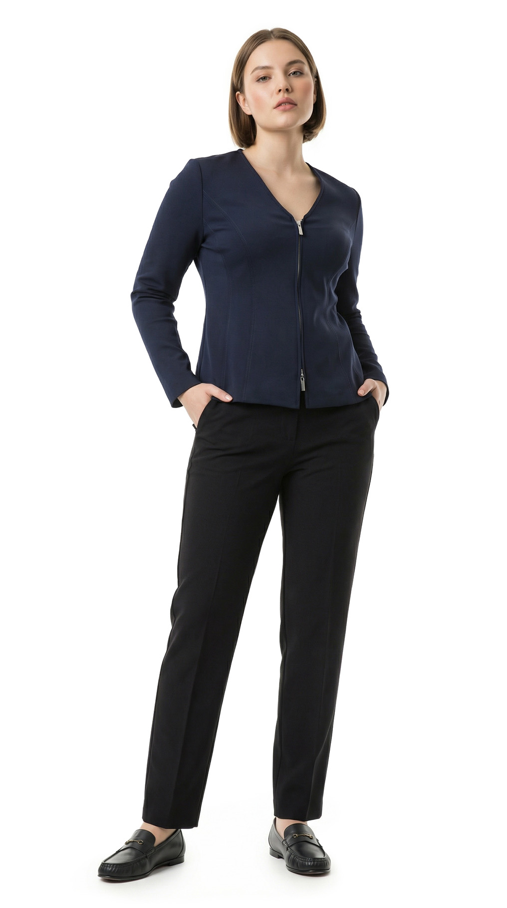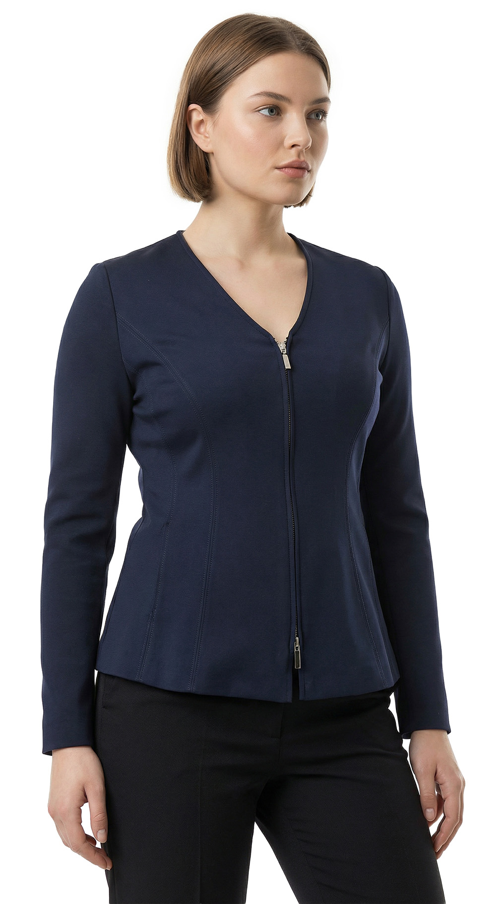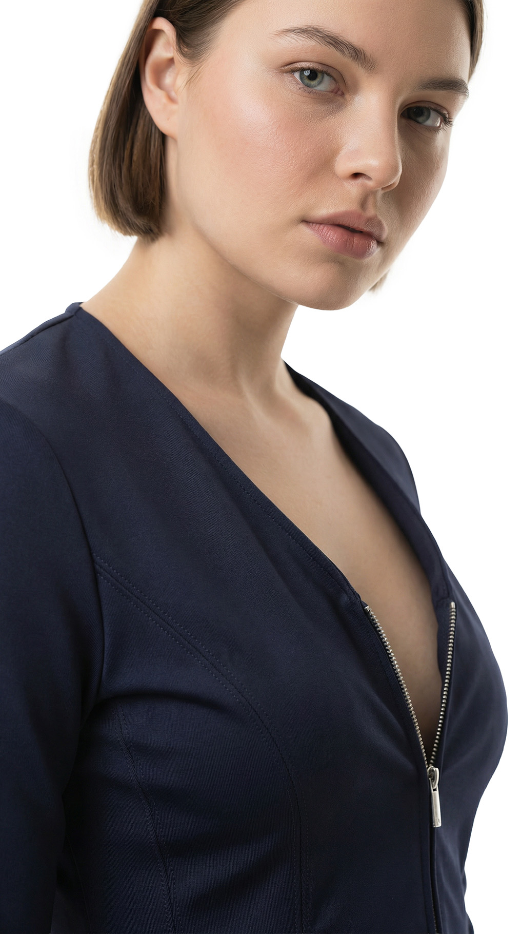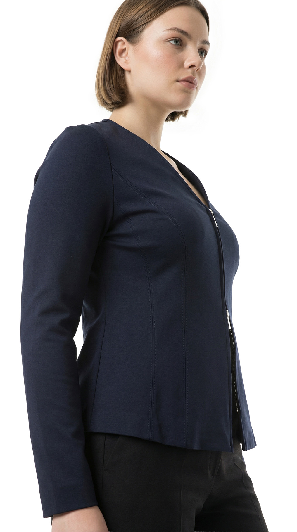 Оригинал. Трикотажный жакет концерна Max Mara (линия Marina Rinaldi) темно-синего (почти черного) цвета. Женственный приталенный фасон с длинным рукавом, V-образным вырезом горловины и застежкой на двустороннюю молнию. В составе: 65% вискоза, 30% полиамид, 5% эластан, без подклада — ткань экстра качества: средней плотности, бархатистая, хорошо тянется и садиться точно по фигурке. Пошив — Тунис. Состояние — новое, из аутлета концерна MaxMara (ярлык бренда надрезан — это политика аутлета).