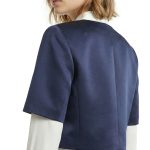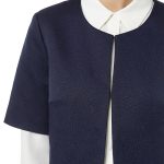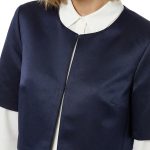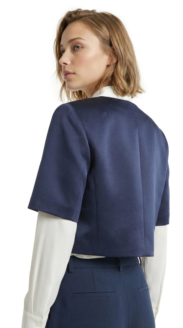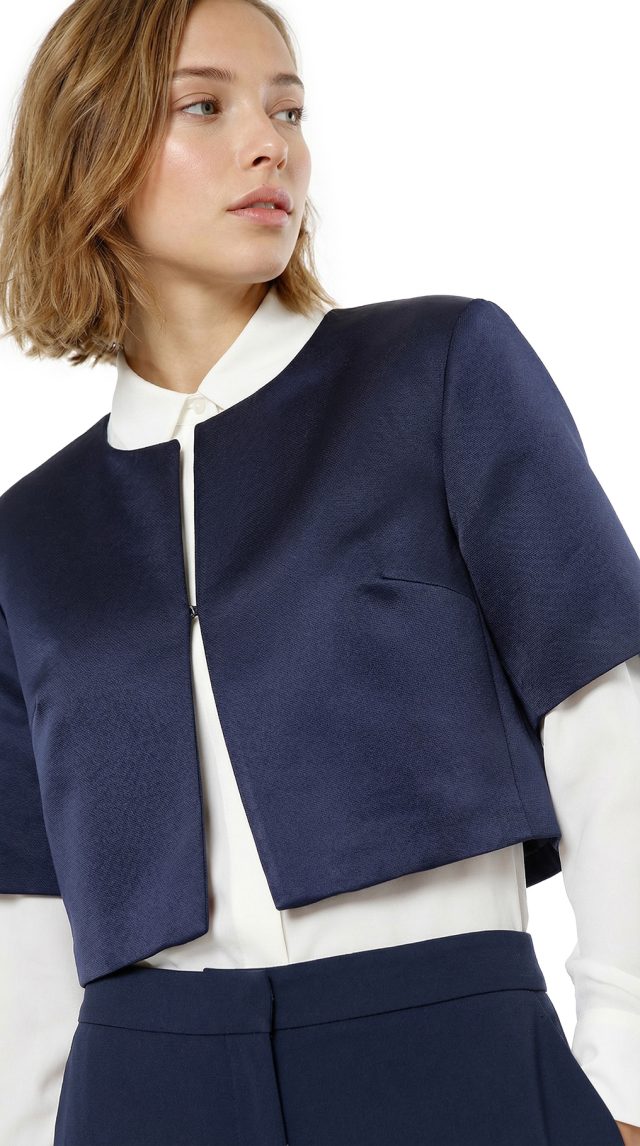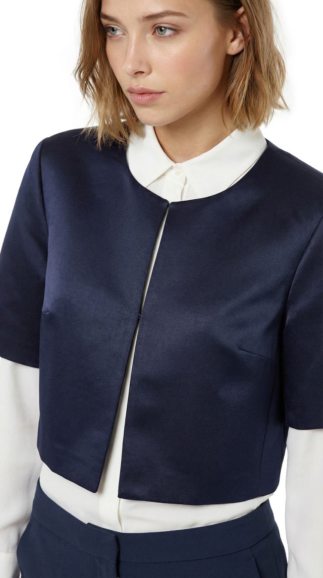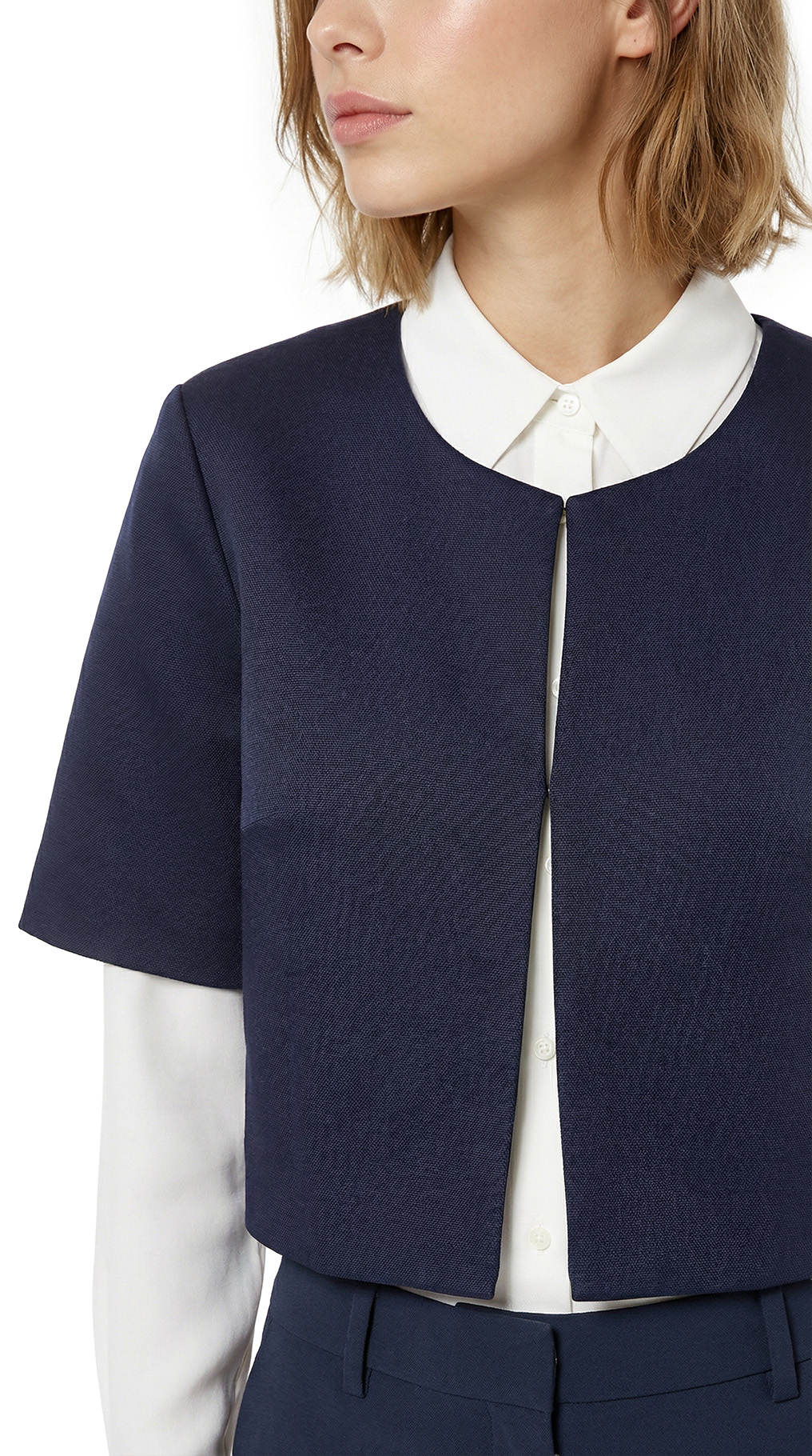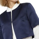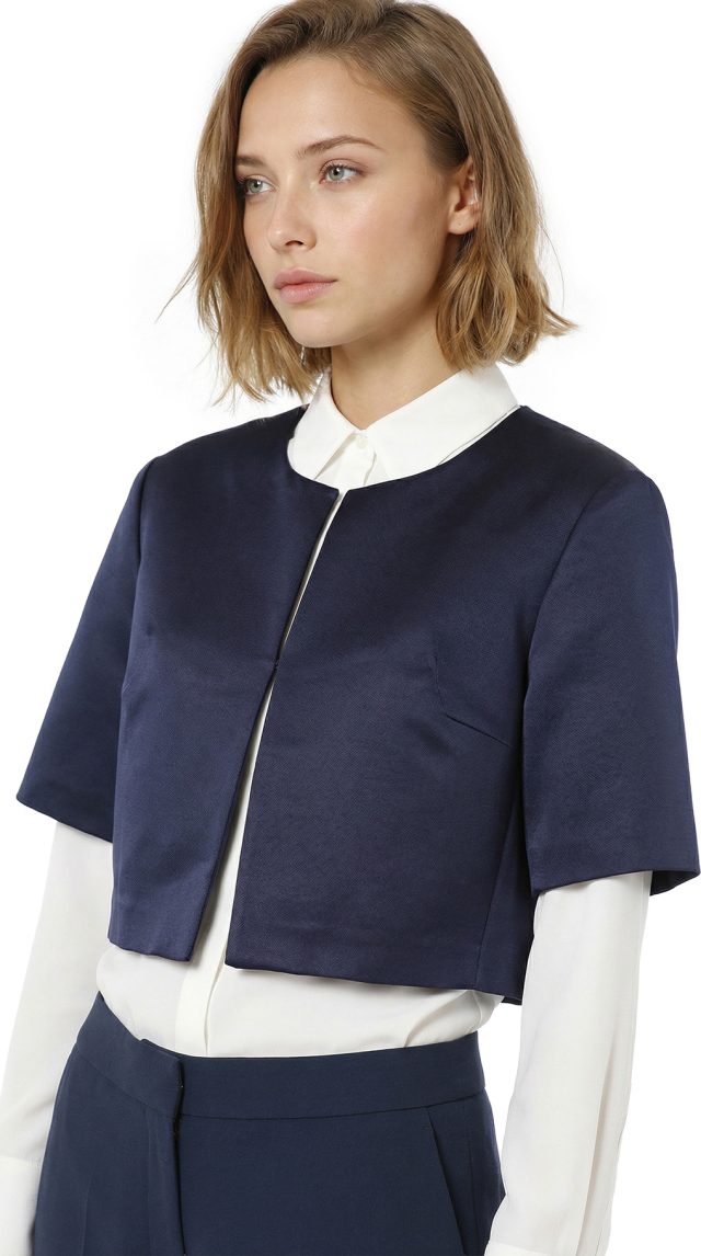 Оригинал. Жакет концерна Max Mara (линия Weekend) темно-синего цвета. Укороченный фасон с рукавом 1/2 и застежкой на потайные крючки. В составе: 100% п.э, без подклада — ткань плотная, шелковистая, по фактуре в мелкий рубчик. Пошив — Албания. Состояние — новое, из аутлета концерна MaxMara (ярлык бренда надрезан — это политика аутлета).