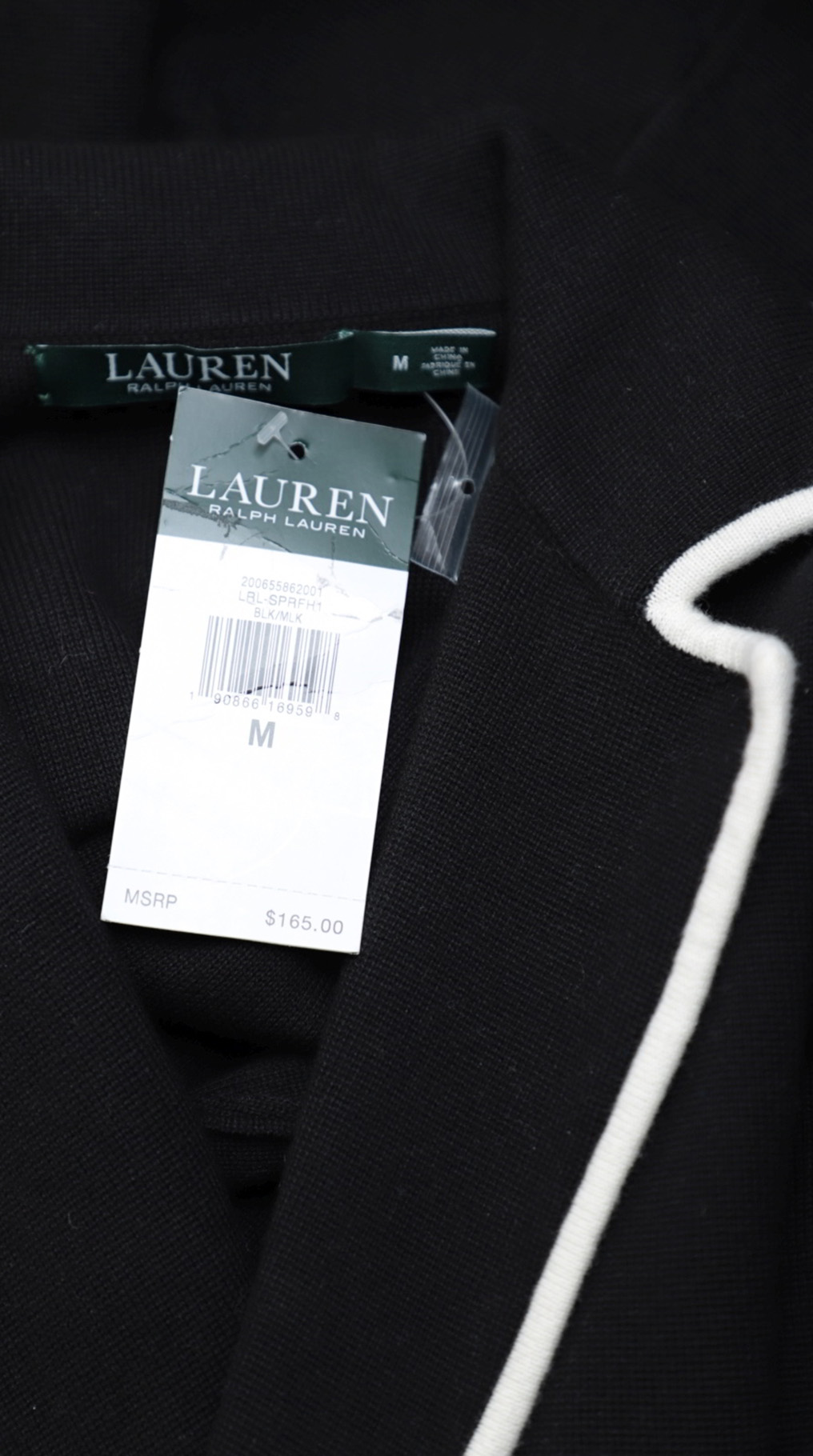 Новый трикотажный жакет Ralph Lauren черного цвета с контрастной белой окантовкой. Застегивается на стильные фирменные пуговки с гравировкой бренда Ralph Lauren. Свободный прямой, слегка приталенный, фасон. Врезные кармашки по переду. В составе: 75% хлопок, 25% нейлон, без подклада — ткань плотная, тянется. Элегантный вариант в любое время года. Оригинал, привезен из США. Продается с биркой магазина Ralph Lauren — цена на бирке 165$.