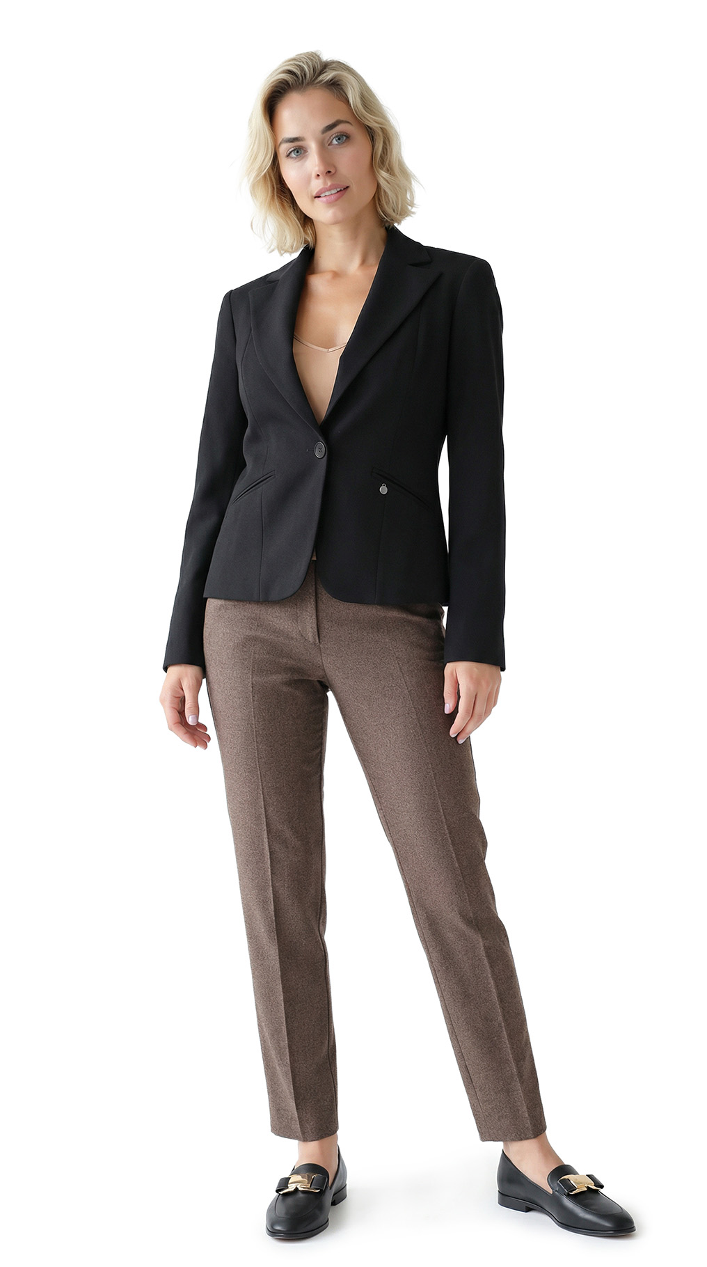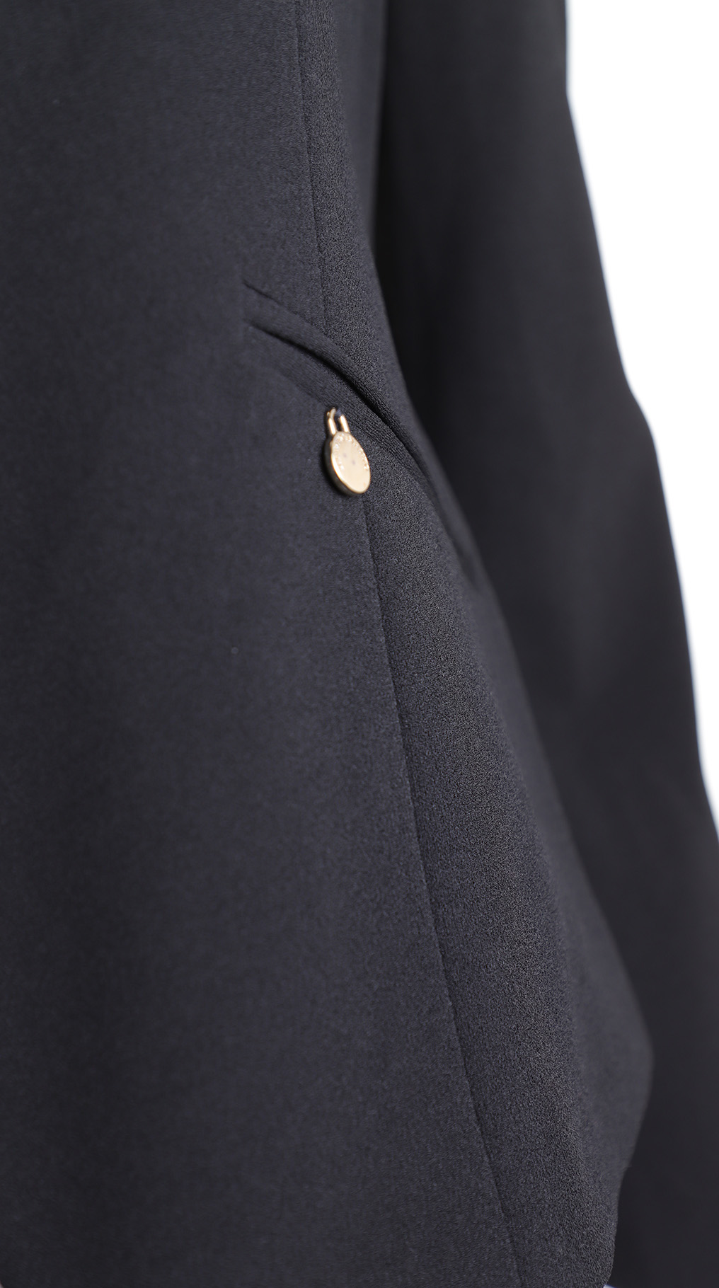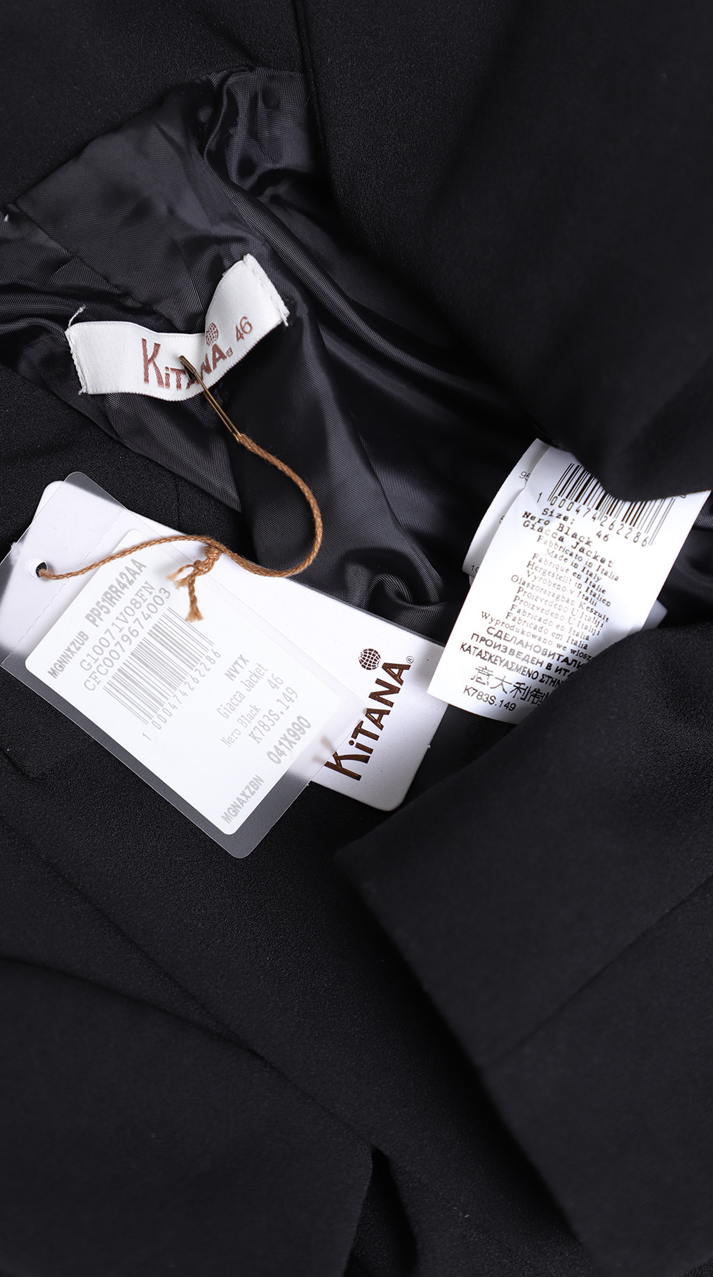 Новый классический жакет итальянского бренда Rinascimento (коллекция Kitana) черного цвета. Женственный приталенный фасон с глубоким декольте, резными лацканами и застежкой на одну пуговку. Врезные кармашки по бокам, декорированные золотой подвеской. Универсальное дополнение к гардеробу. В составе: 95% п/э, 5% эластан, на подкладе — ткань плотная, мягкая, по фактуре «крепе». Состояние — новое, с фирменной биркой Kitana.