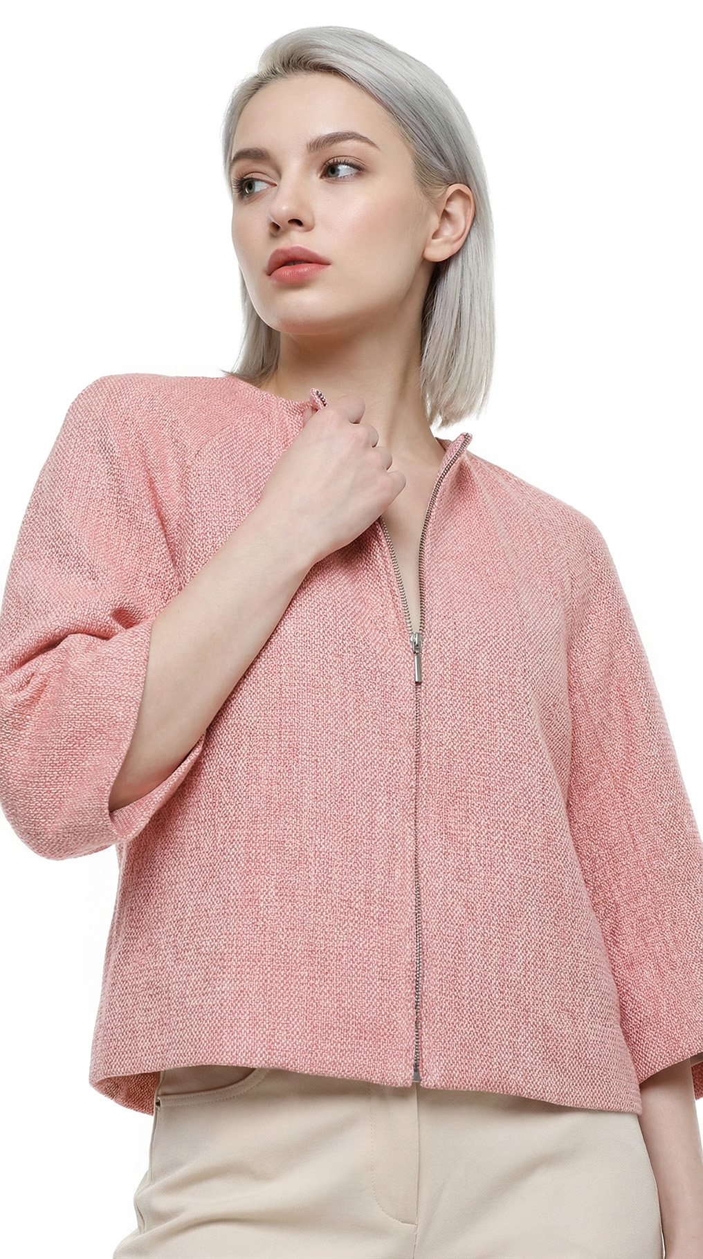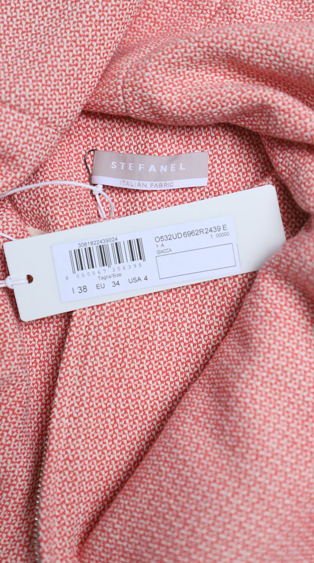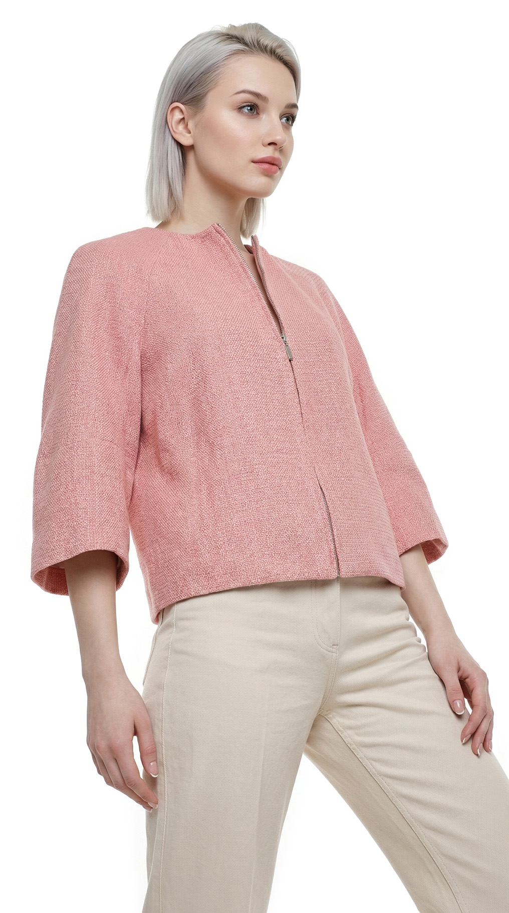 Новый хлопковый жакет итальянского премиального бренда Stefanel бледно-розового (лососевого) цвета. Свободный укороченный фасон с широким рукавом-реглан длиной 3/4. Застежка спереди на молнию. В составе: 93% хлопок, 6% п.э, 1% вискоза — ткань плотная, без подклада. Состояние — новое, с фирменной биркой магазина Stefanel.