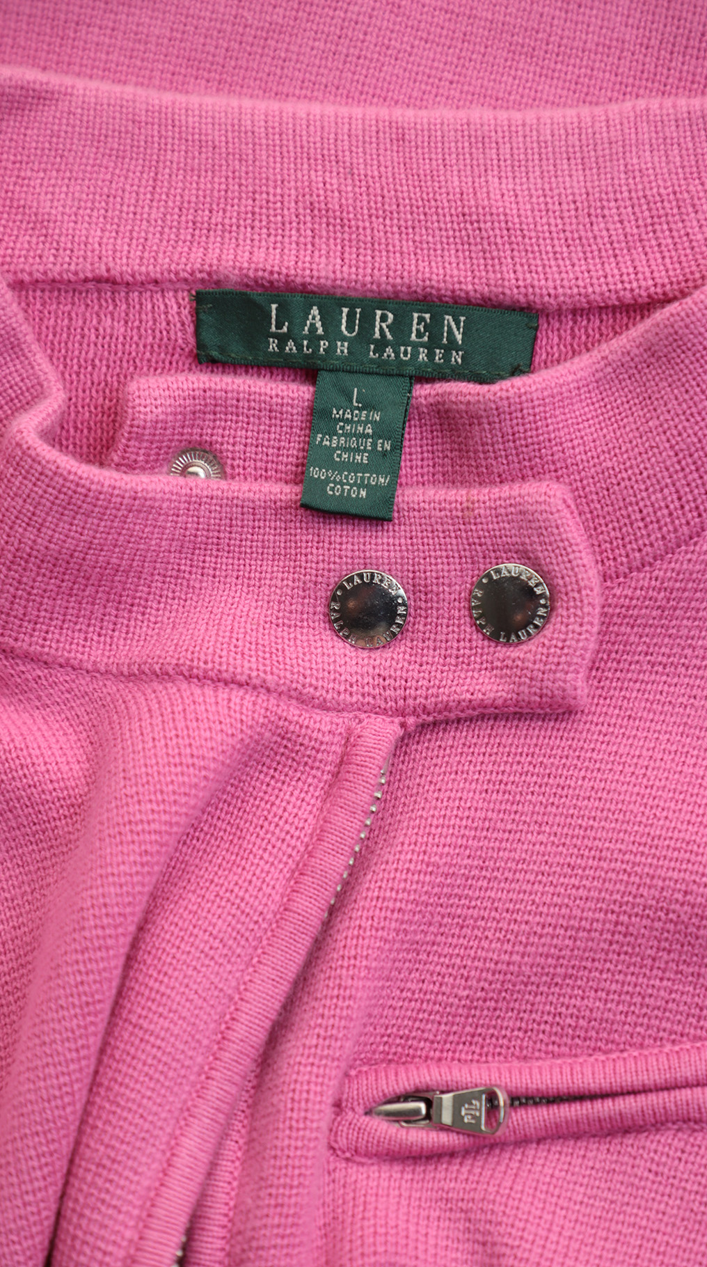 Стильный трикотажный жакет Ralph Lauren яркого розового цвета. Приталенный фасон с погонами на плечах, застежкой на молнию и скругленной горловиной на кнопках. Большие накладные кармашки, врезной кармашек на молнии. Длинный рукав. В составе 100% хлопок трикотаж, без подклада — ткань плотная, хорошо тянется и прекрасно садиться по фигурке. Стильный, яркий, вариант. Оригинал, привезен из США. Состояние — отличное.