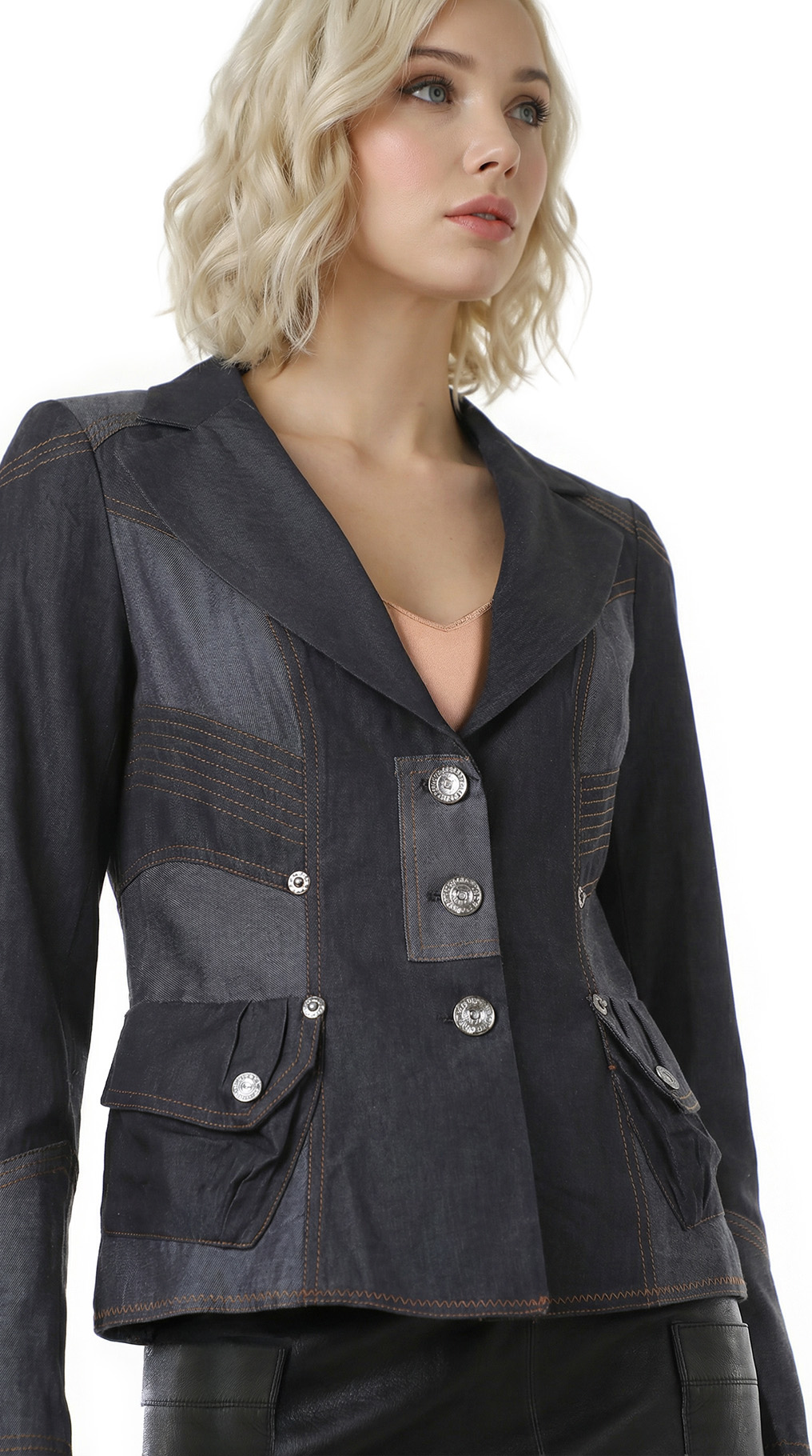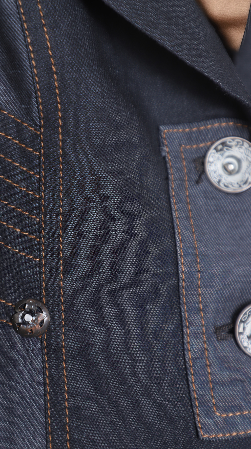 Новый дизайнерский жакет французского бренда класса «люкс» Zapa Paris темно-серого цвета с контрастной рыжей отстрочкой и пуговками, расписанными вручную. Женственный приталенный фасон с длинным рукавом и глубоким вырезом горловины с резным воротничком. Застежка на пуговки. Большие накладные кармашки. Шличка по спинке для комфортной посадки. Премиальное качество пошива и материалов. Смотрится стильно и дорого. В составе: 73% хлопок, 23% лен, на подкладе из 100% хлопка: ткань экстра качества: по фактуре «под легкую джинсы», мягкая, шелковистая. Эксклюзив: в единственном экземпляре в России. Состояние — новое, с фирменной биркой Zapa. Цена на бирке — 310 евро (!)