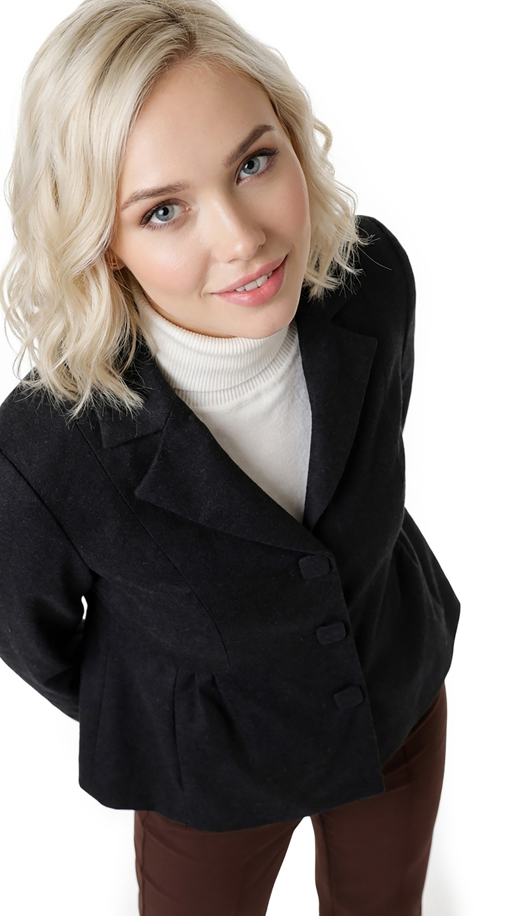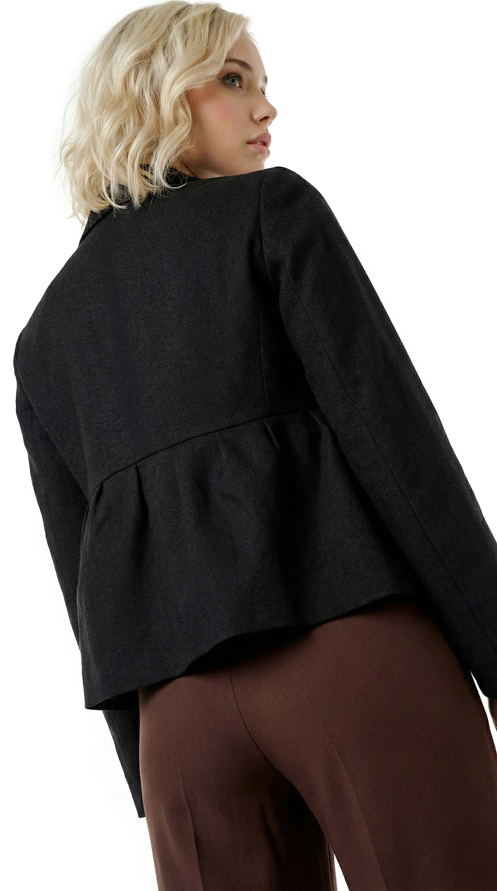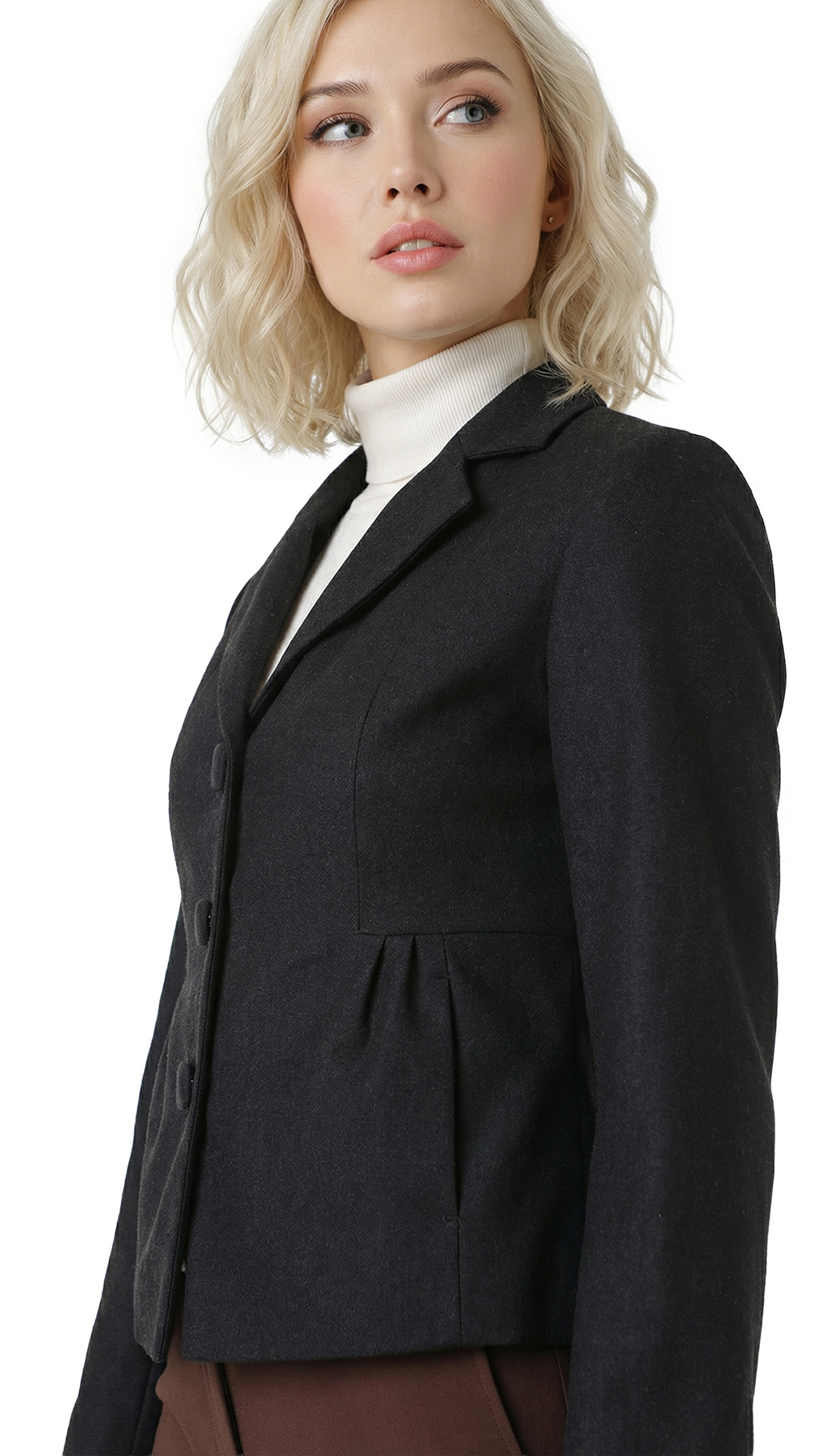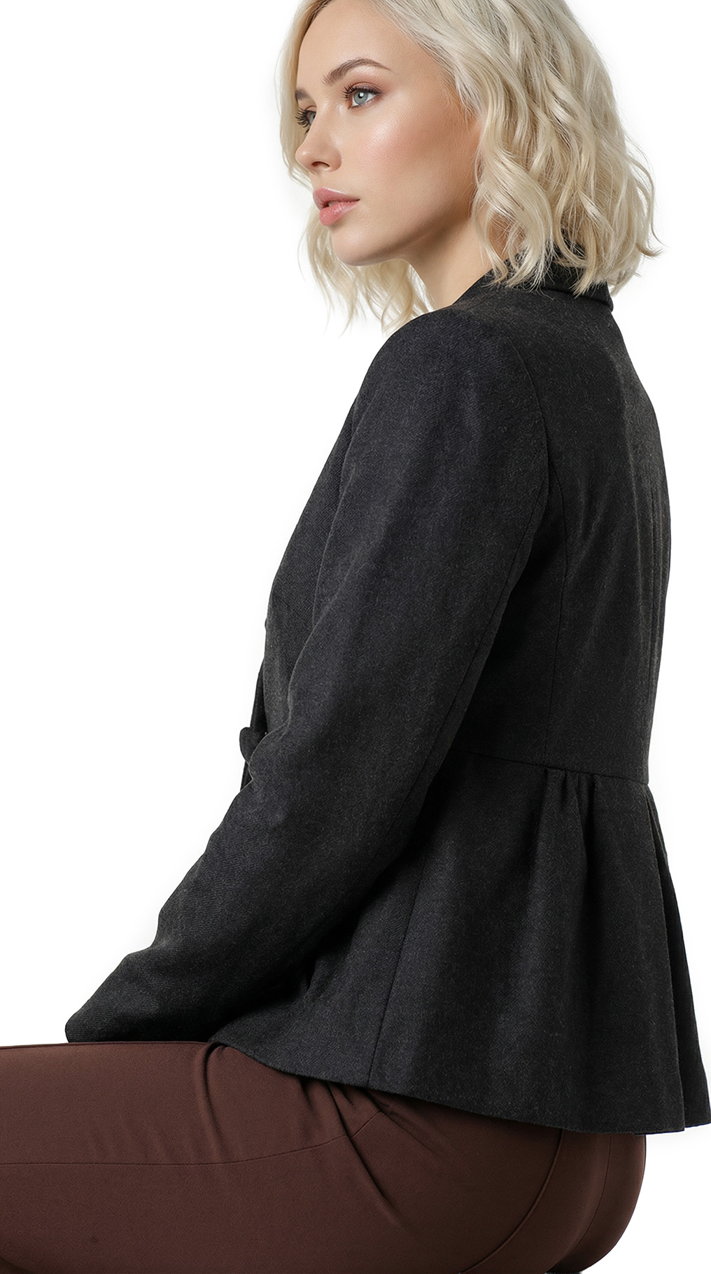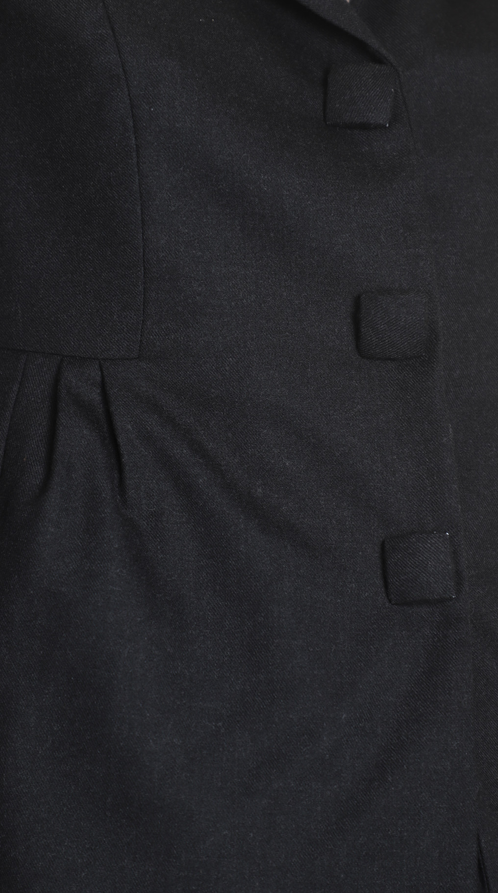 Новый шерстяной жакет французского бренда класса «люкс» Zapa Paris темно-серого (почти черного, антрацит) цвета. Женственный полу-прилегающий фасон с кокеткой по талии и большими пуговками, обтянутыми тканью. Классический отложной воротник с резными лацканами. Длинный рукав. Стильный подклад в мелкий золотой горошек. К жакету есть брючки — можно подобрать комплект. Премиальное качество пошива и материалов. В составе 100% шерсть, на подкладе: ткань средней плотности, очень мягкая, и теплая. Эксклюзив: в единственном экземпляре в России. Состояние — новое, с фирменной биркой Zapa. Цена на бирке — 255 евро (!).