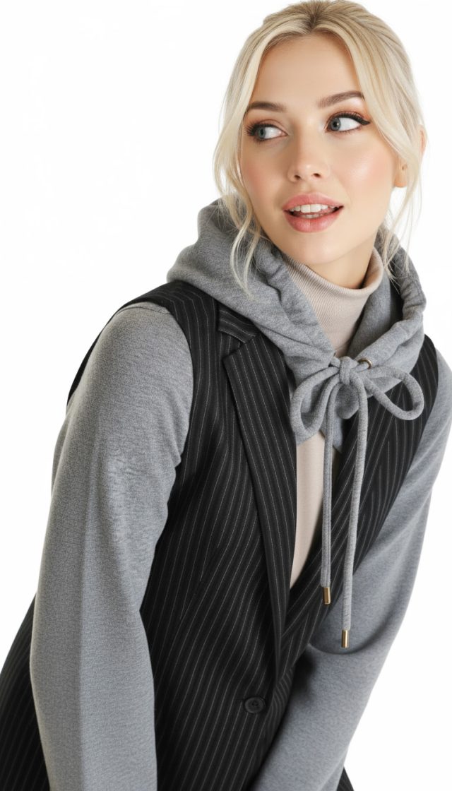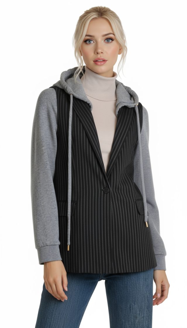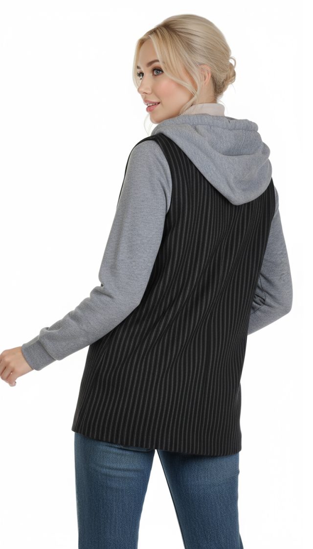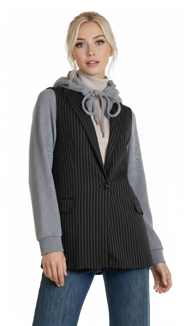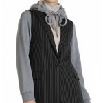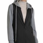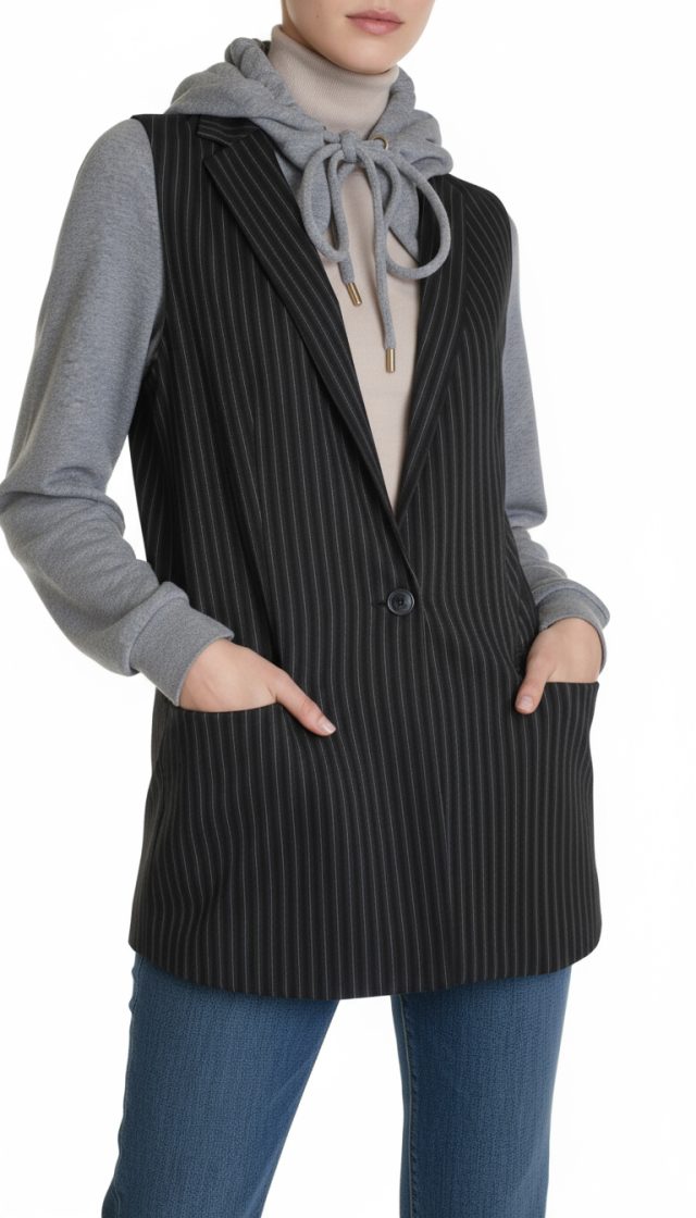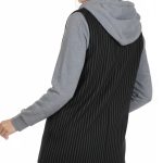 Стильная жилетка итальянского премиум бренда Pinko черного цвета с серыми полосами, трикотажными серыми рукавами и капюшоном. Удлиненный полу-приталенный фасон с глубоким декольте и застежкой на пуговку. Фальш-кармашки по бокам. Капюшон с подвязкой на кантик по горловине. В составе: 58% вискоза, 40% хлопок, 2% эластан, на подкладе из 67% натурального ацетата, 33% п.э — ткань экстра качества: плотная, мягкая. Состояние — идеальное, как новое.