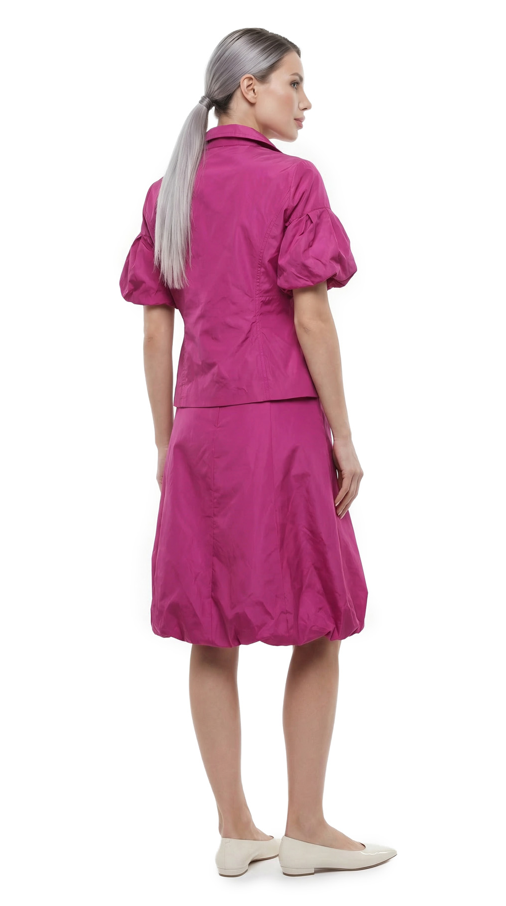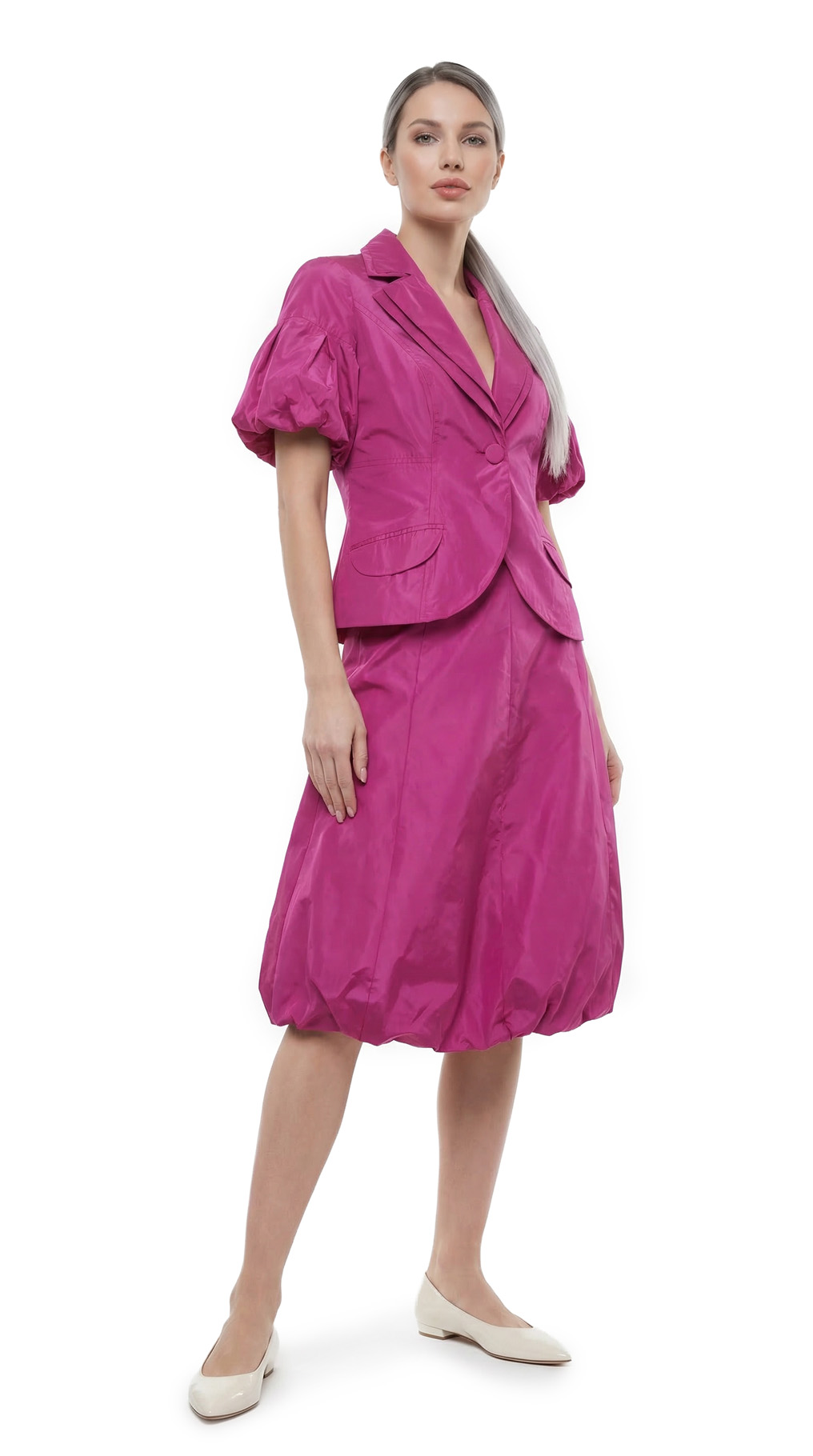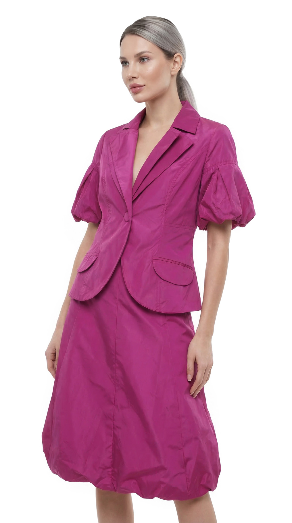 Новый дизайнерский костюм (жакет и юбка) французского бренда класса «люкс» Zapa Paris цвета фуксии. Жакет приталенный с красивыми резными лацканами, пышным коротким рукавом, накладными кармашками и застежкой на большую пуговку. Юбочка из клинышек с резинкой по низу, что придает ей объем и пышность, и застежкой сбоку на молнию. Премиальное качество пошива и материалов. В составе 100% п.э, на подкладе из 100% натурального ацетата — ткань мягкая, с шелковистым отливом, по фактуре напоминает плащевую. Состояние — новое, с фирменной биркой Zapa.