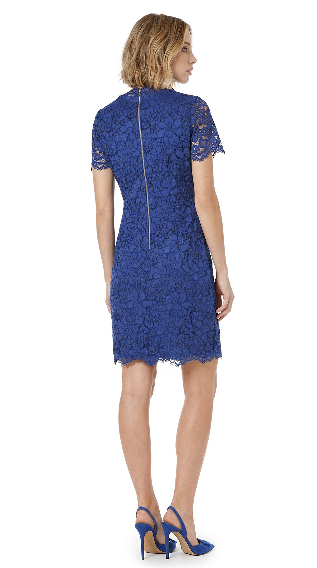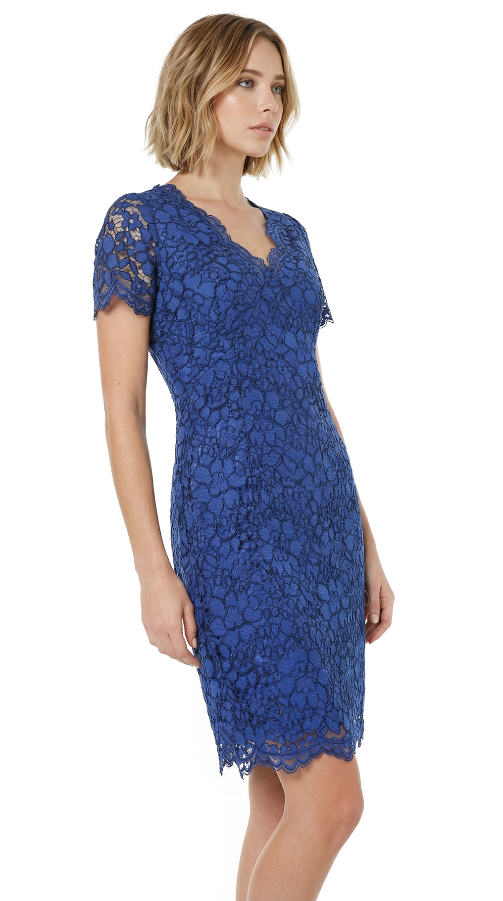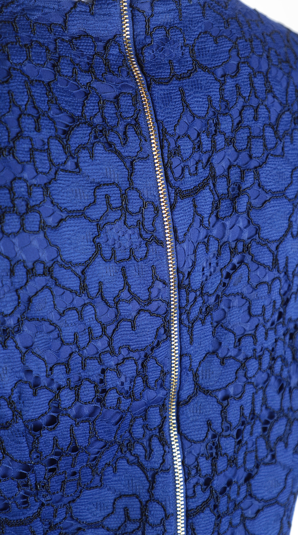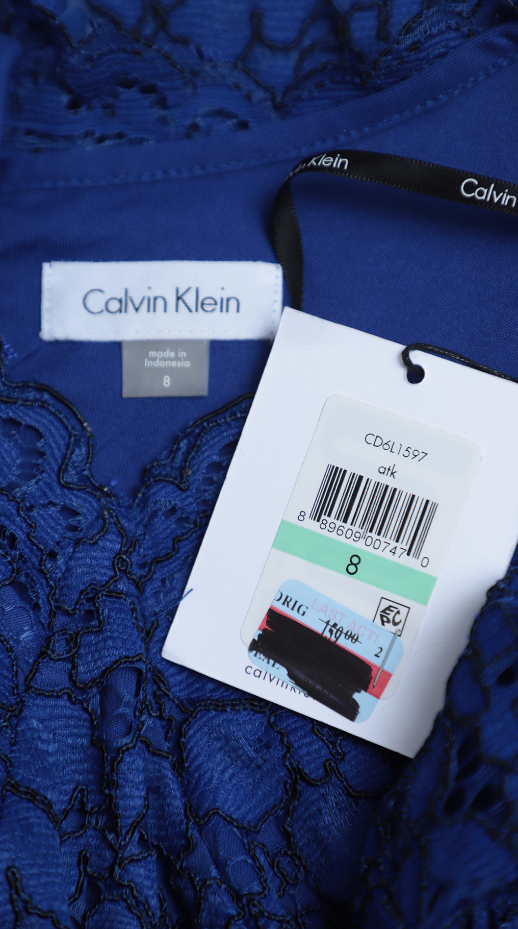 Новое кружевное платье Calvin Klein красивого синего цвета. Женственный приталенный фасон с глубокой зоной декольте и коротким рукавом. Застежка по спинке на яркую, золотую, молнию. В составе: 51% вискоза, 49% нейлон, на подкладе из 100% пэ. Состояние — новое, с фирменной биркой Calvin Klein. Цена на бирке — 159$.