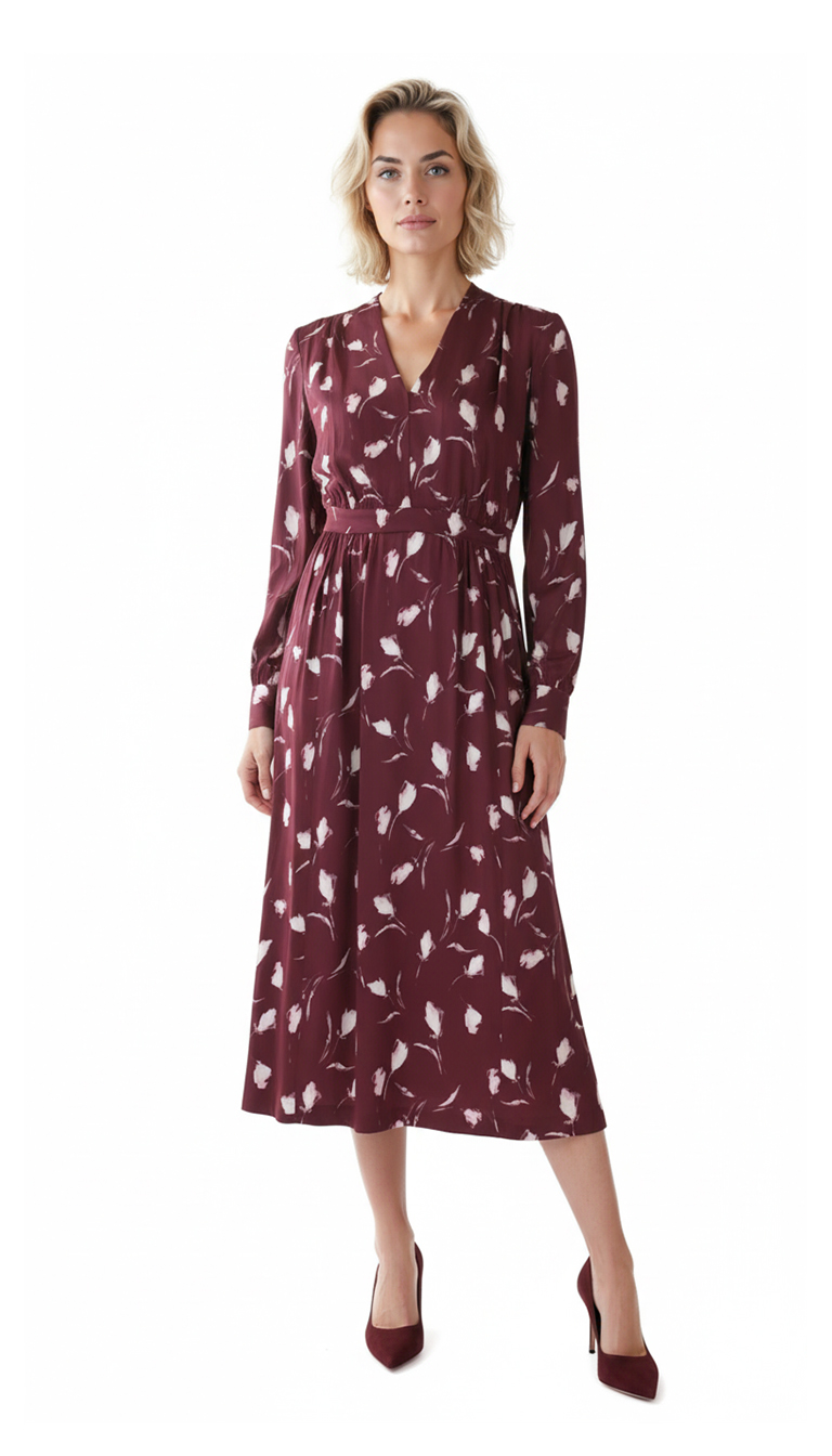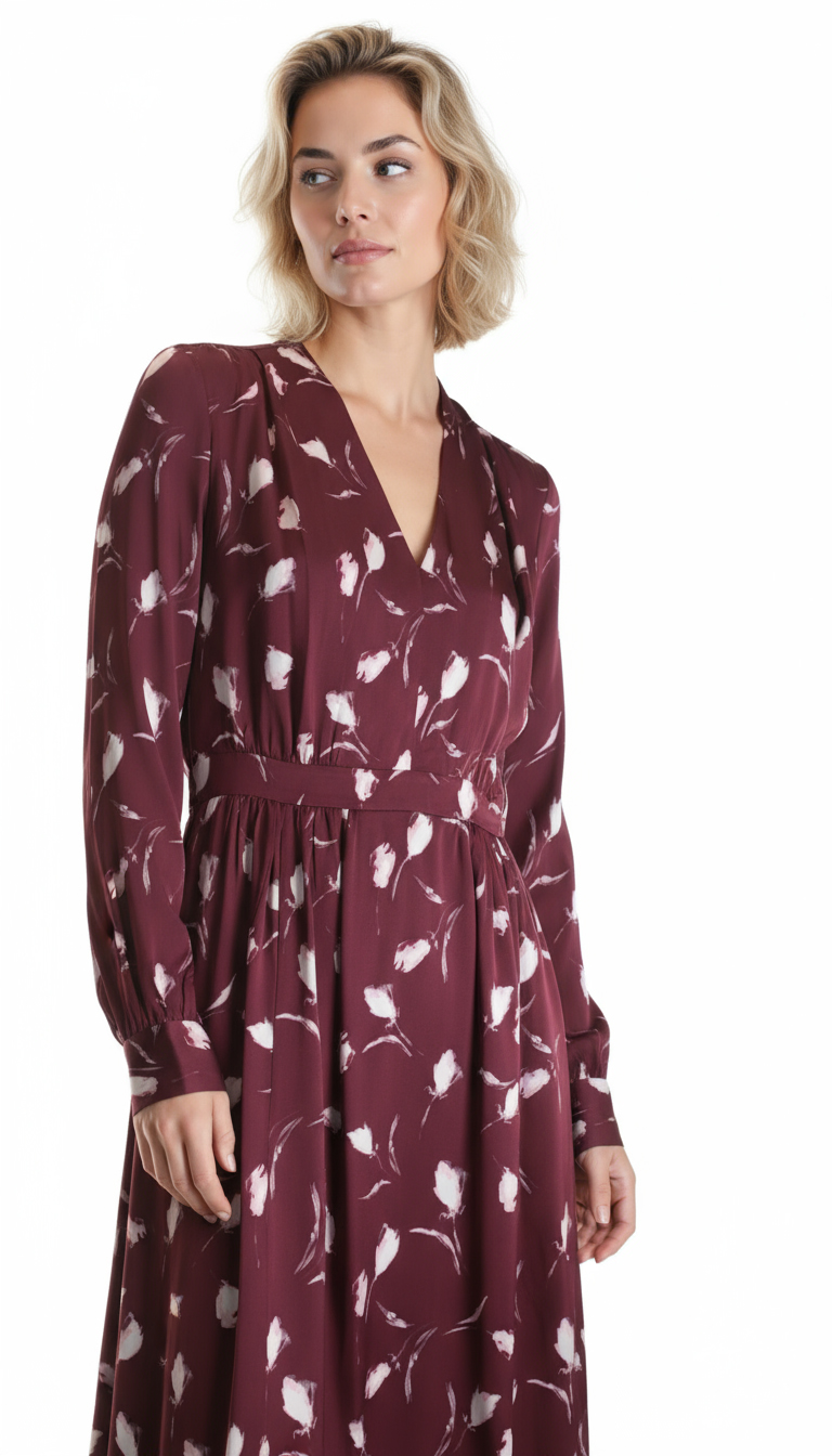 Новое шелковое платье премиального американского бренда Classiques Entier темно-вишневого цвет с цветочным принтом. Приталенный покрой с V-образным вырезом горловины, акцентирующим линию груди и длинным рукавом с манжетами на пуговках. Драпировка по талии и плечам придает особую женственность фасону. Боковая застежка на молнию. Материал — нежный, шелковистый, очень приятный на ощупь. В составе: 92% натуральный шелк, 8% спандекс, на подкладе. Состояние — новое, с биркой. Цена на бирке — 288$ (!)