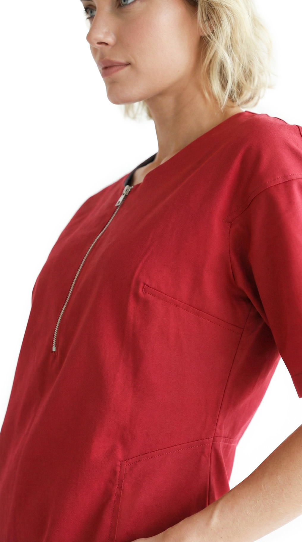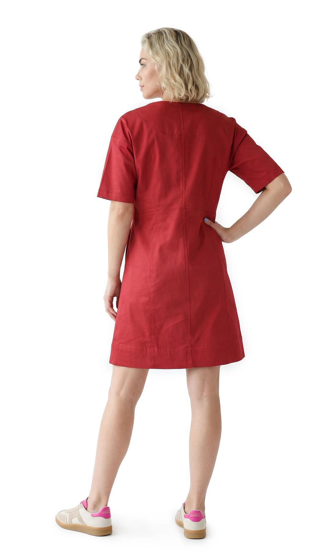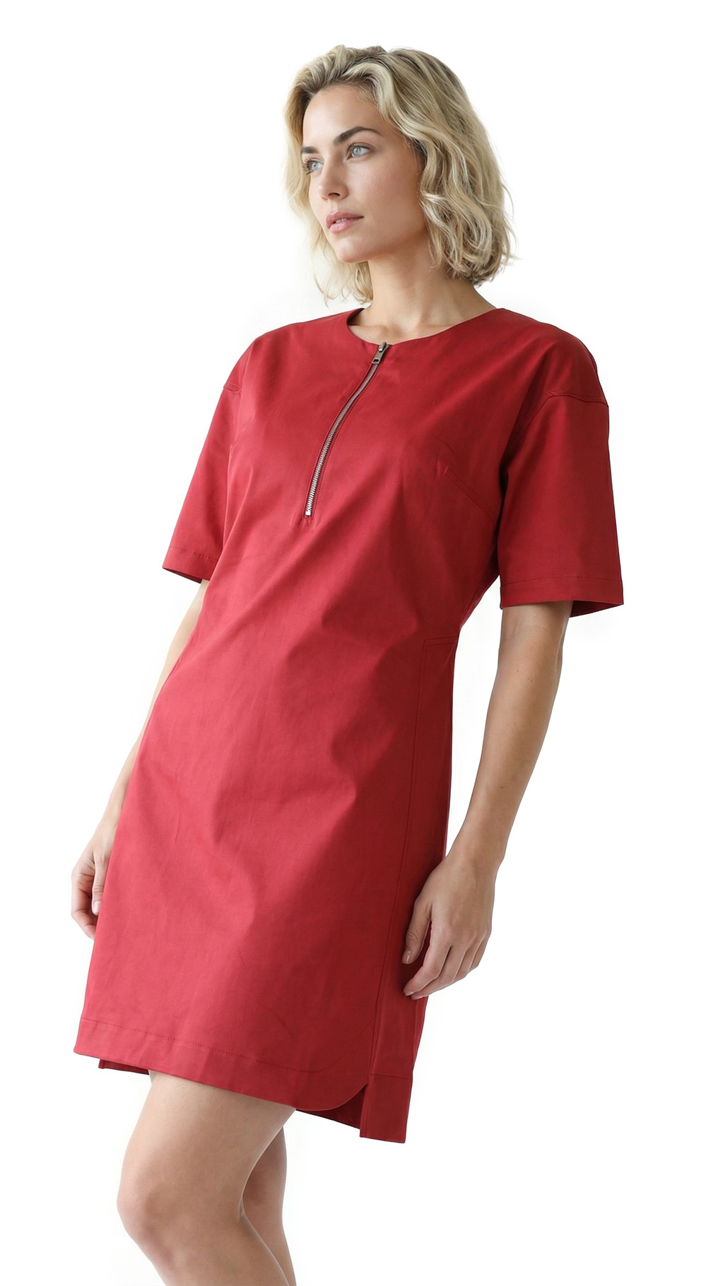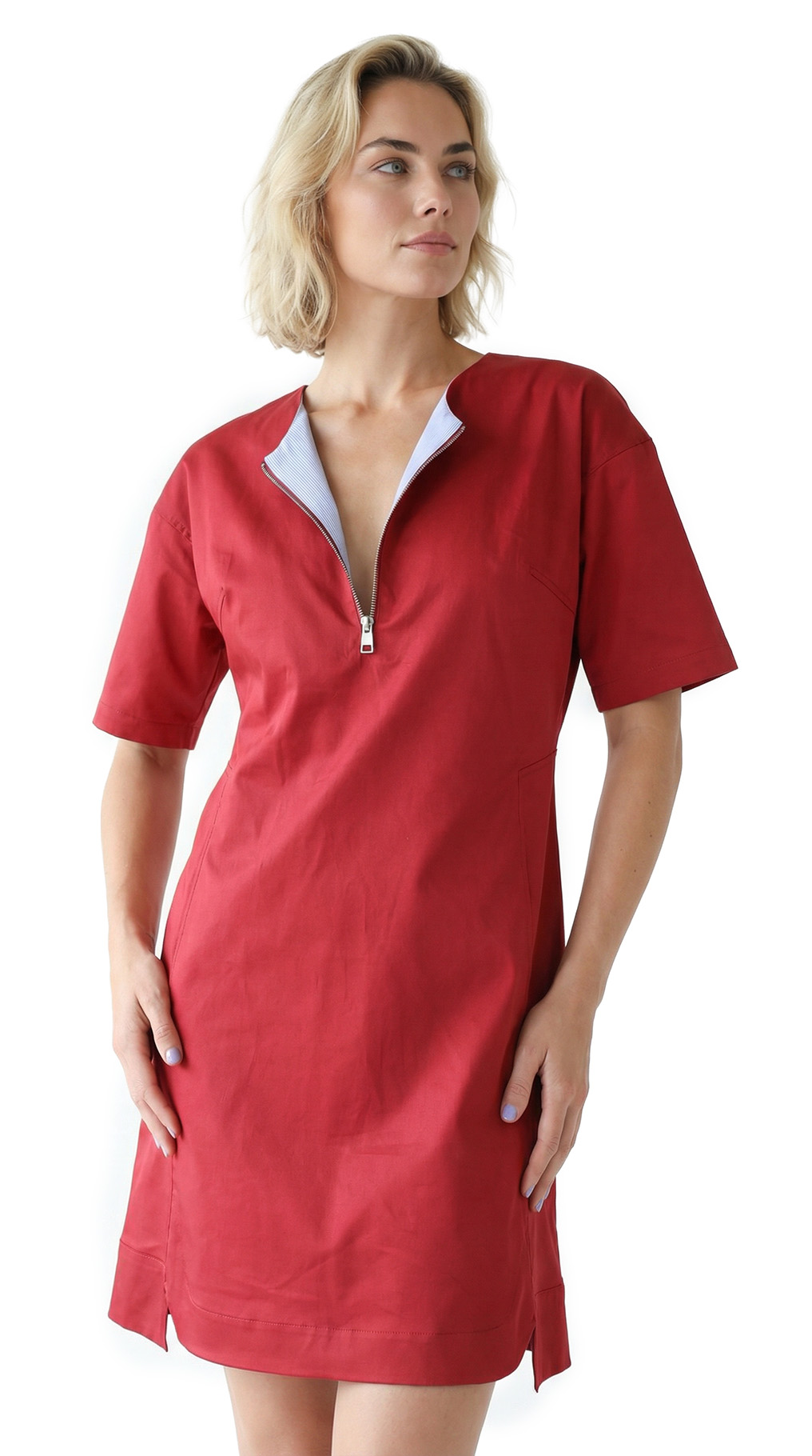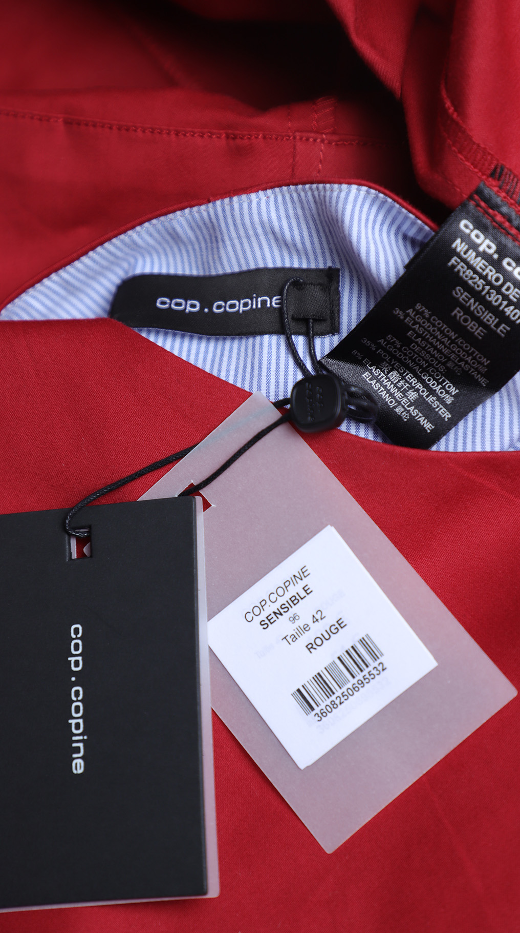 Новое платье легендарного французского бренда Cop Copine карминово-красного цвета. Свободный приталенный фасон с коротким приспущенным рукавом «реглан». Скругленная горловина с застежкой на серебряную молнию по груди. Расстегнув молнию, получаются резные лацканы в сине-голубую полоску. Красиво оформленная линия низа с вырезами и скругленным передом. Резные боковины с оригинальной отстрочкой. Манишка по спинке. В составе: 97% хлопок, 3% эластан: ткань плотная, хорошо садиться по фигурке. Пошив — Португалия. Состояние — новое, с оригинальной запломбированной биркой Cop Copine.
