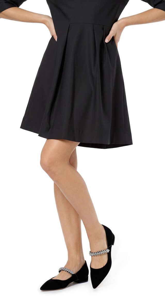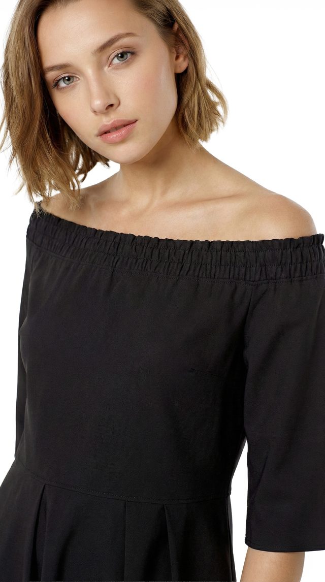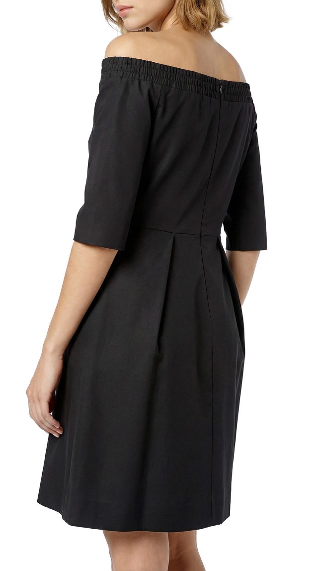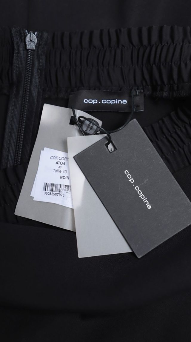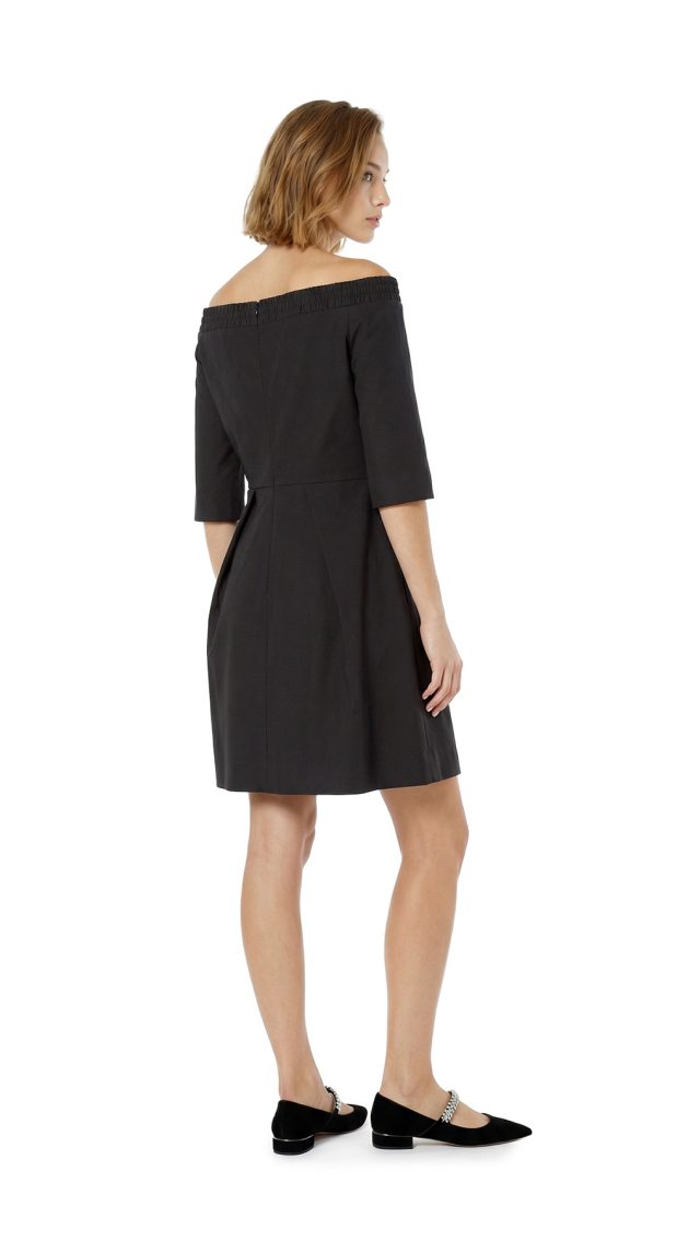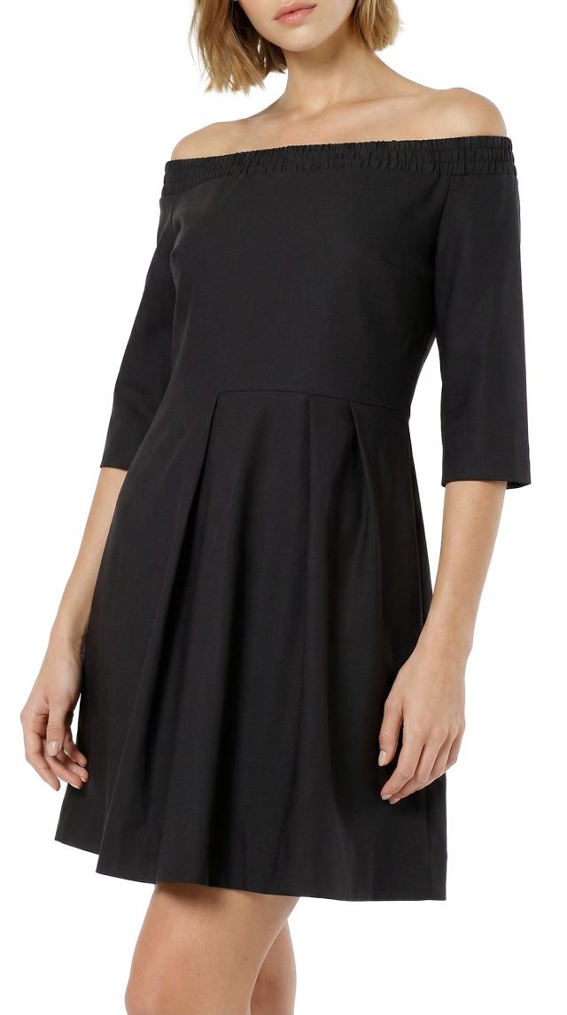 Новое женственное платье легендарного французского бренда Cop Copine черного цвета. Полу-прилегающий фасон с коротком рукавом и открытыми плечами на резинке. Юбочка с красивыми складками от талии, запахом и скрытым вырезом от колена по переду. Застежка по спинке на молнию. В составе: 49% п.э, 47% хлопок, 4% эластан, без подклада. Ткань плотная, шелковистая, хорошо держит форму. Состояние — новое, с оригинальной запломбированной биркой Cop Copine.