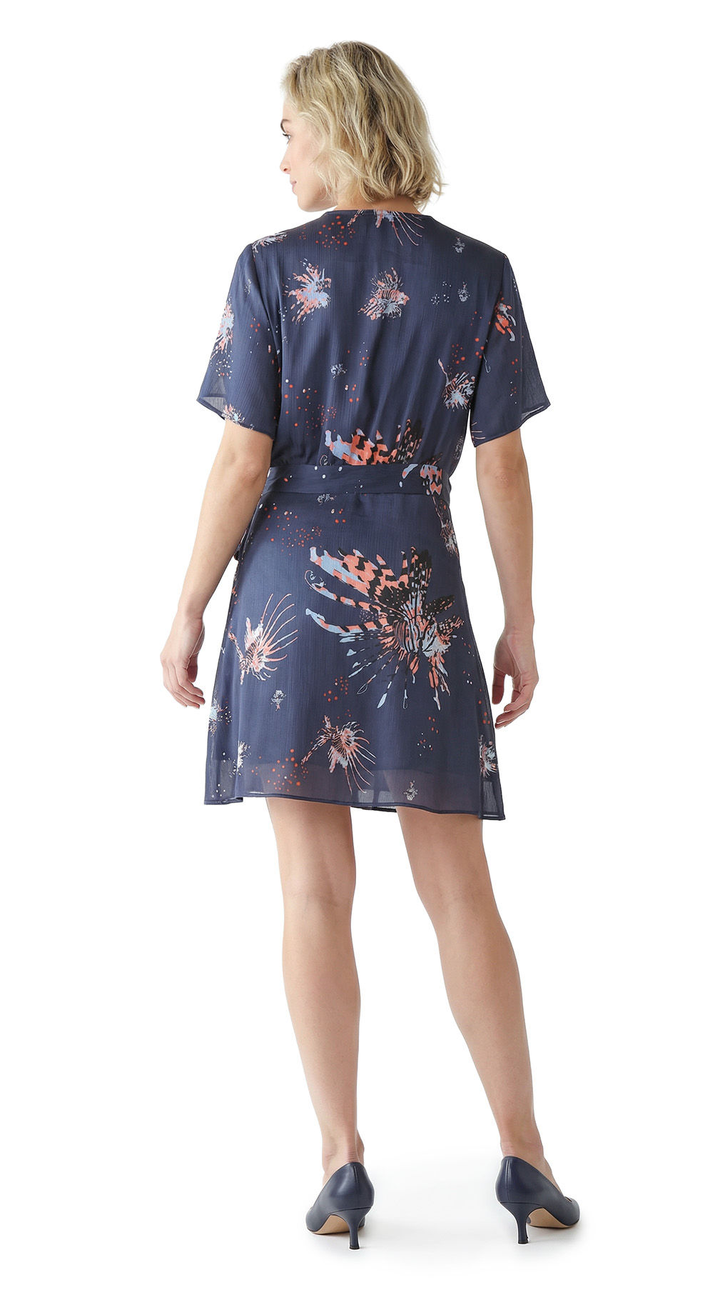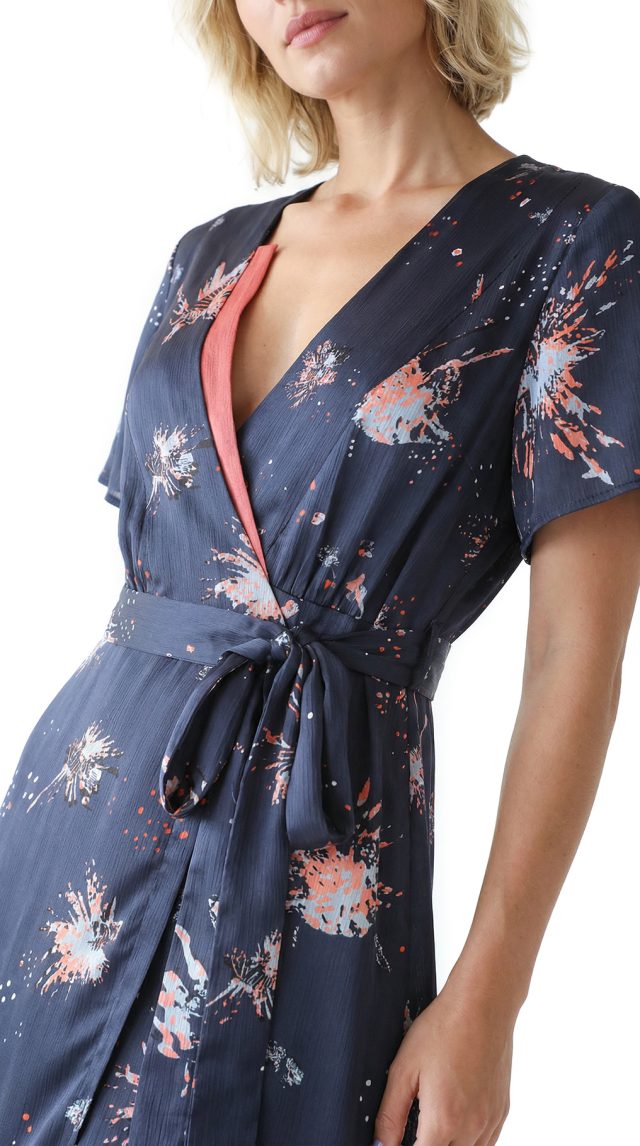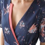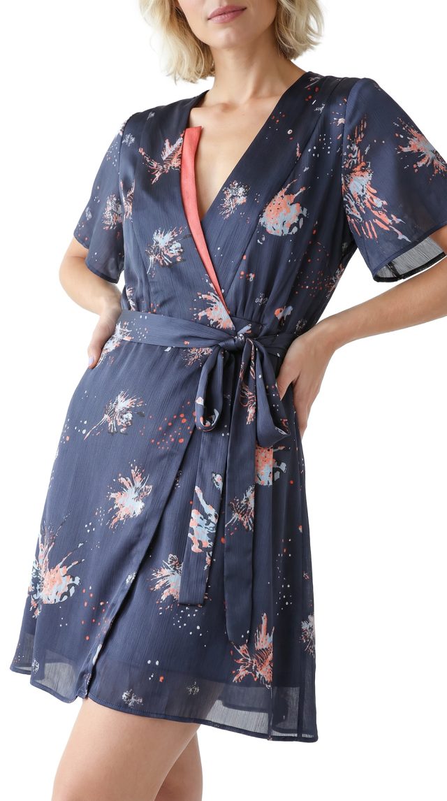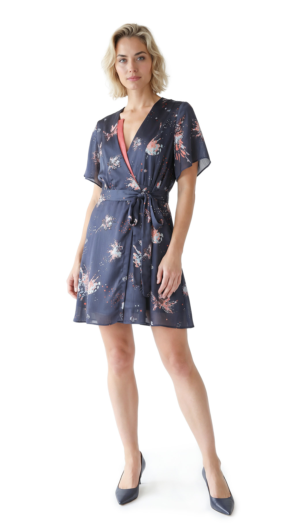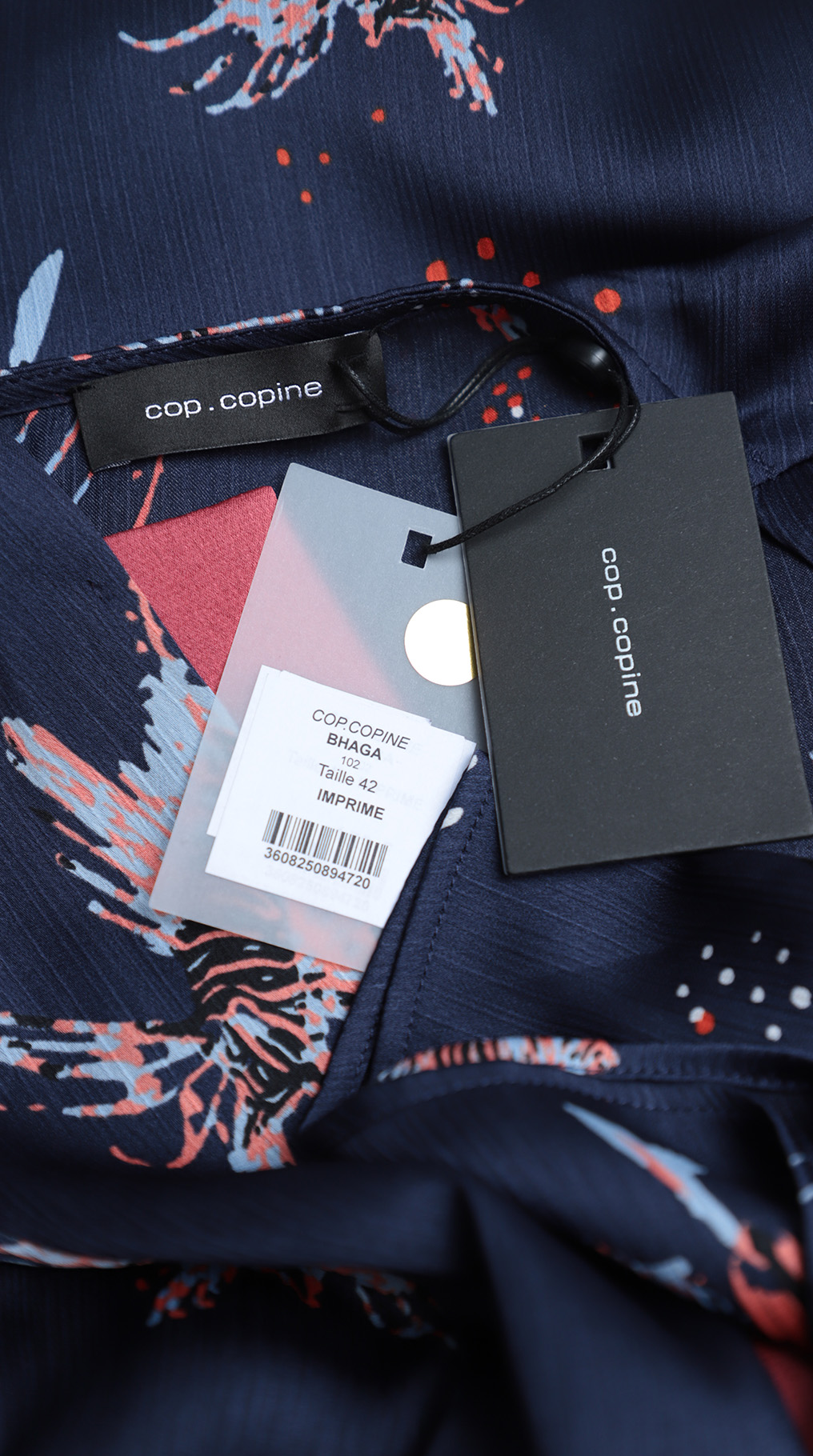 Новое платье легендарного французского бренда Cop Copine темно-синего цвета с розово-голубым принтом. Женственный фасон на запах с глубоким вырезом горловины, декорированным яркой контрастной вставкой. Короткий рукав. Юбочка — трапеция с застежкой на потайную пуговку и подвязкой на пояс. Смотрится модно и стильно. В составе: 100% п.э, на подкладе из 100% натуральной вискозы (юбочка): ткань мягкая, шелковистая. Состояние — новое, с оригинальной запломбированной биркой Cop Copine.